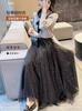 Saia 2024 Nova Saia de Véu Longo de Verão Drapeado Cintura Alta Fina Super Fada Brilhante Prata Seda Grande Saia Swing