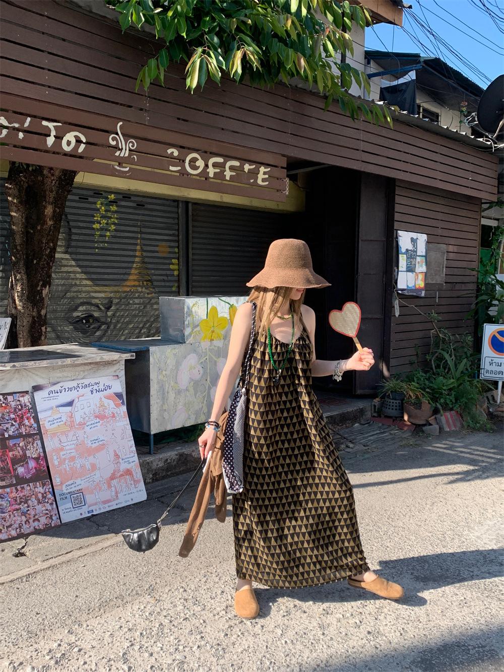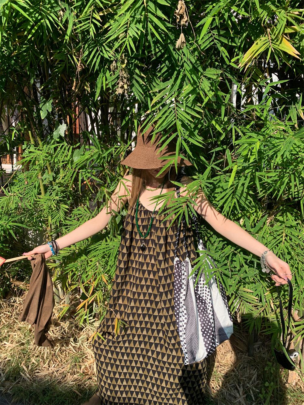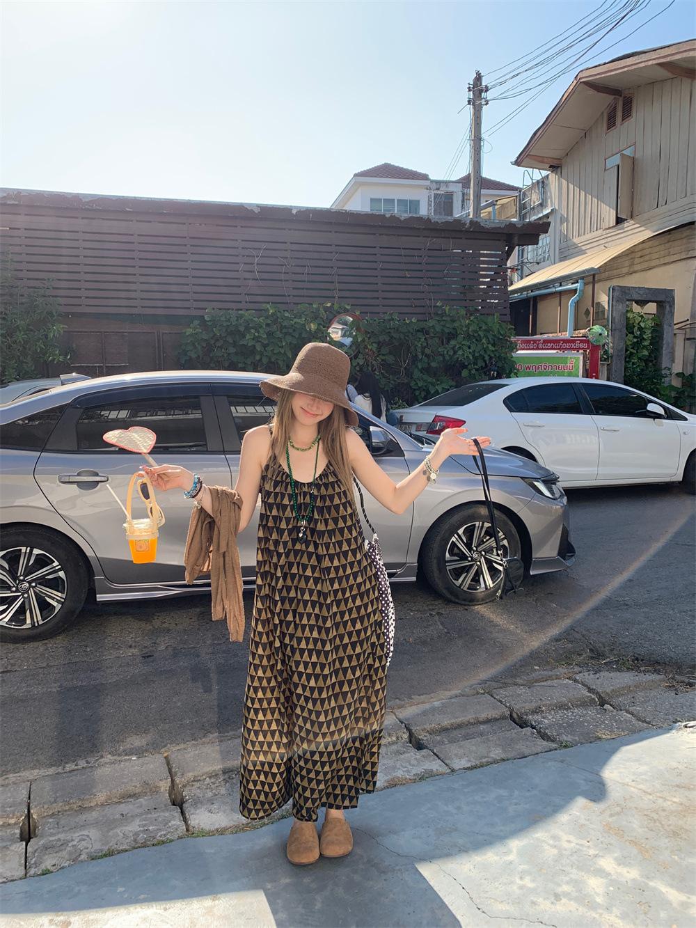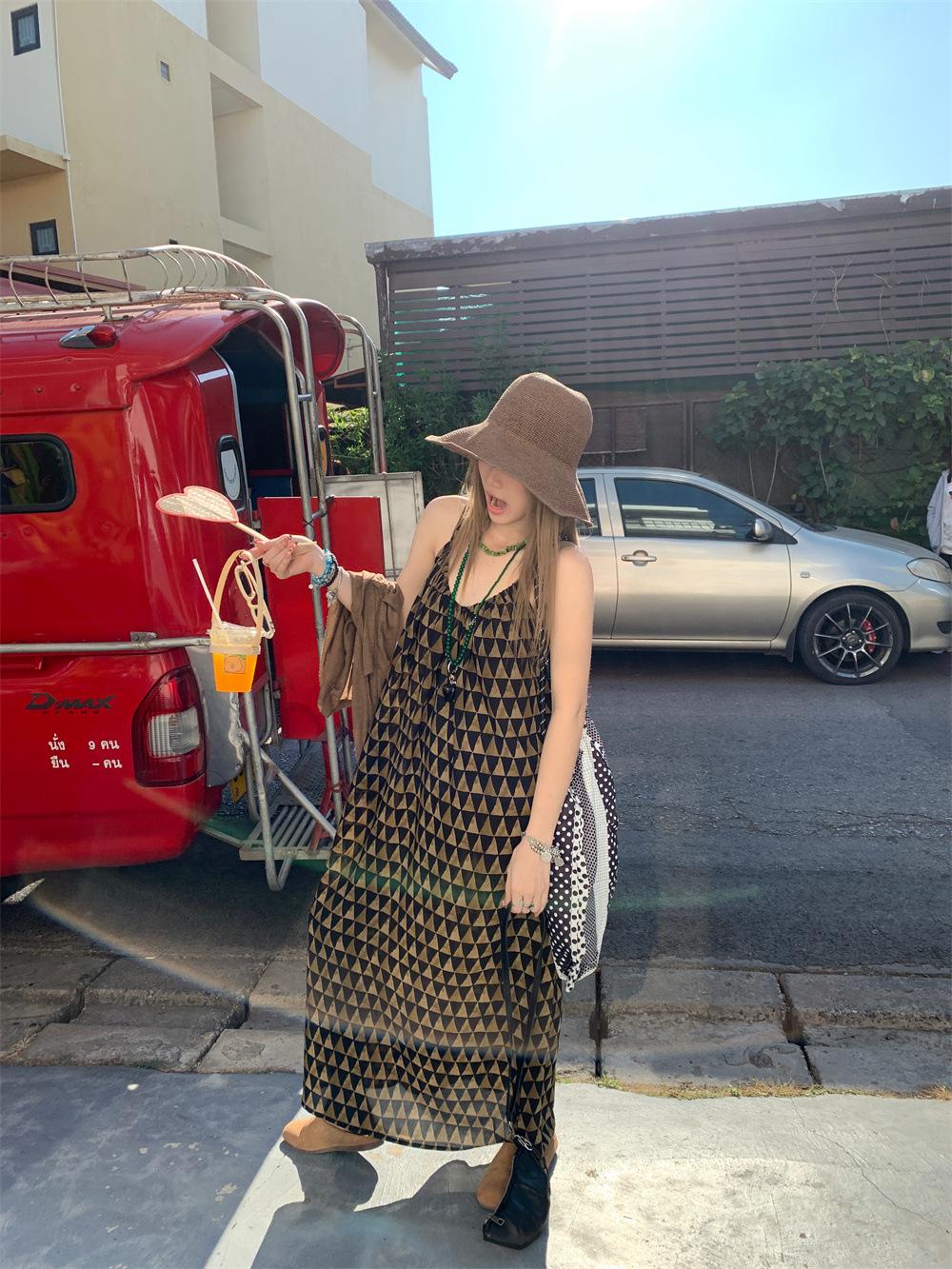 2025 Novo Estilo de Verão Elegante Vestido Regata Estampado Vestido Suspensório Estilo Resort Beira-Mar Saia Longa de Praia Saia Retrô Americana