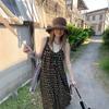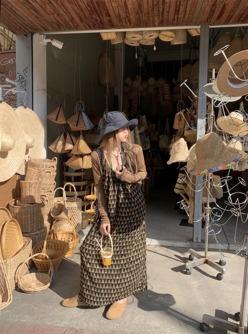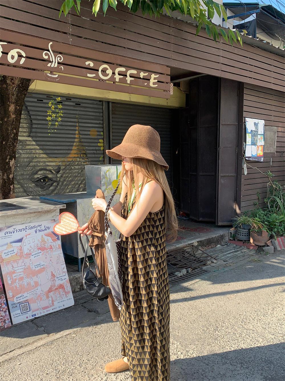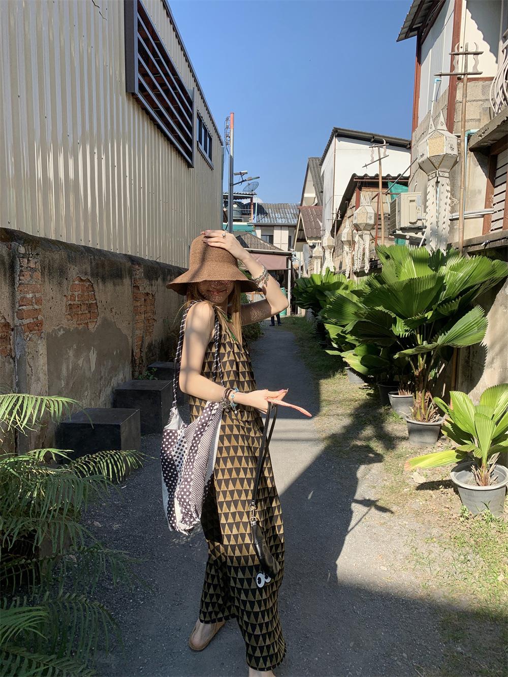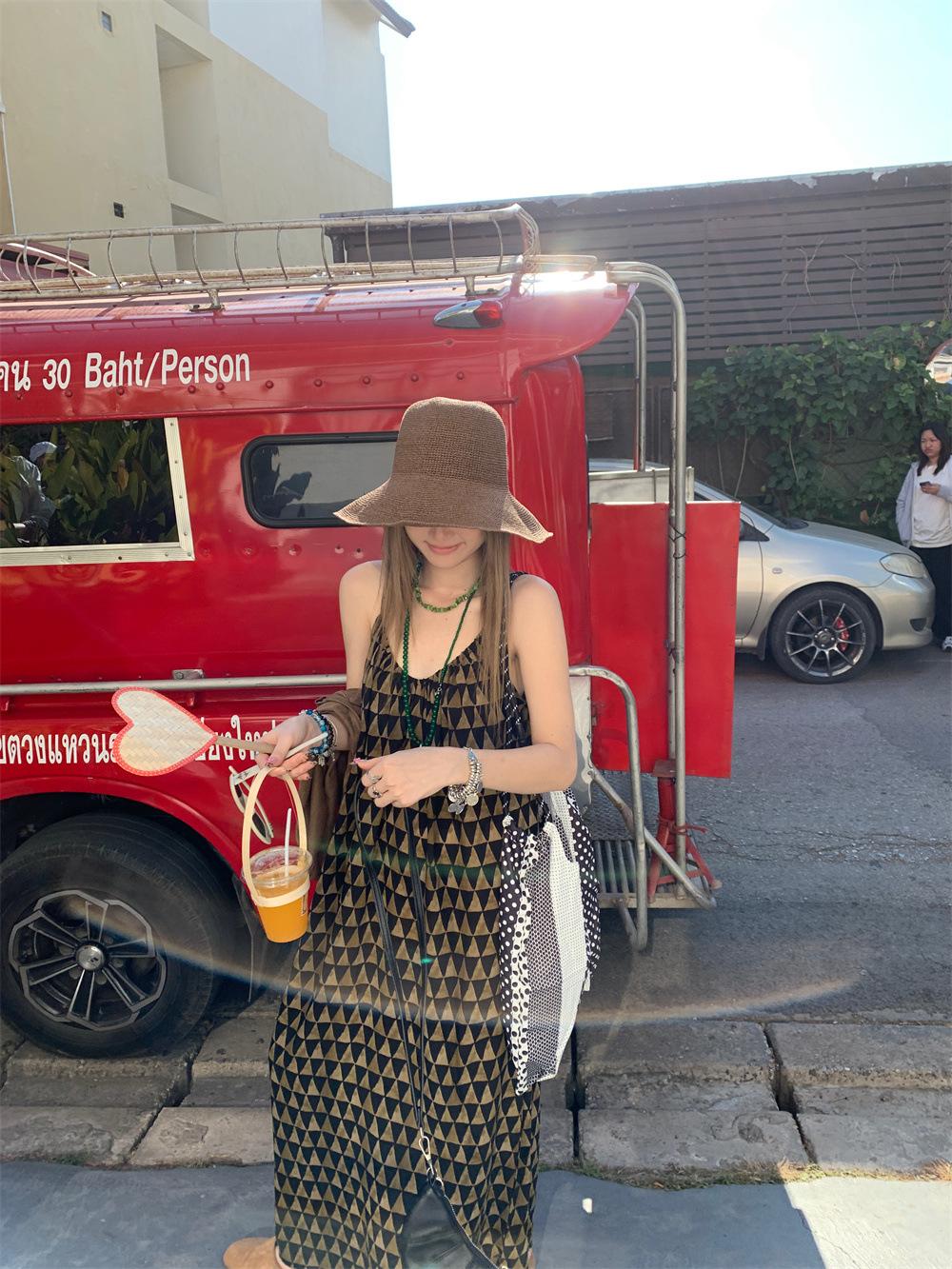 2025 Novo Estilo de Verão Elegante Vestido Regata Estampado Vestido Suspensório Estilo Resort Beira-Mar Saia Longa de Praia Saia Retrô Americana