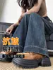 Calça jeans feminina de perna larga com estampa de leopardo e costura espessada com forro de lã, nova calça casual de cintura alta lavada para inverno