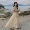 Vestido plissado com gola quadrada francesa Vestido feminino 2025 Primavera Novo Cintura alta Grande Swing Manga comprida Vestido guarda-chuva
