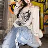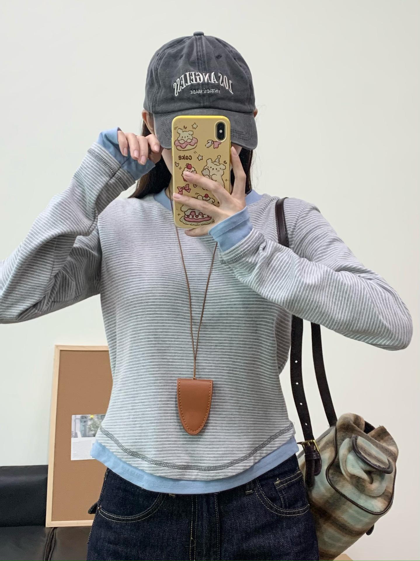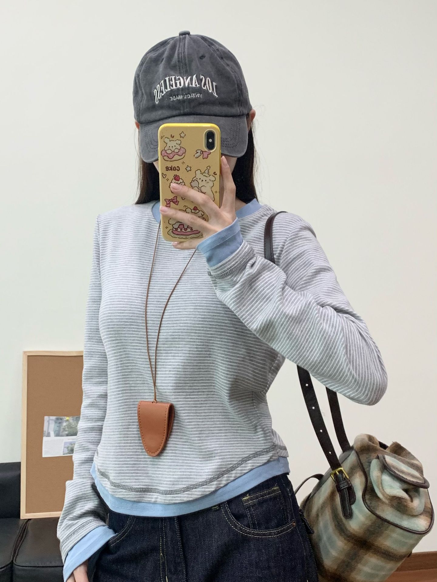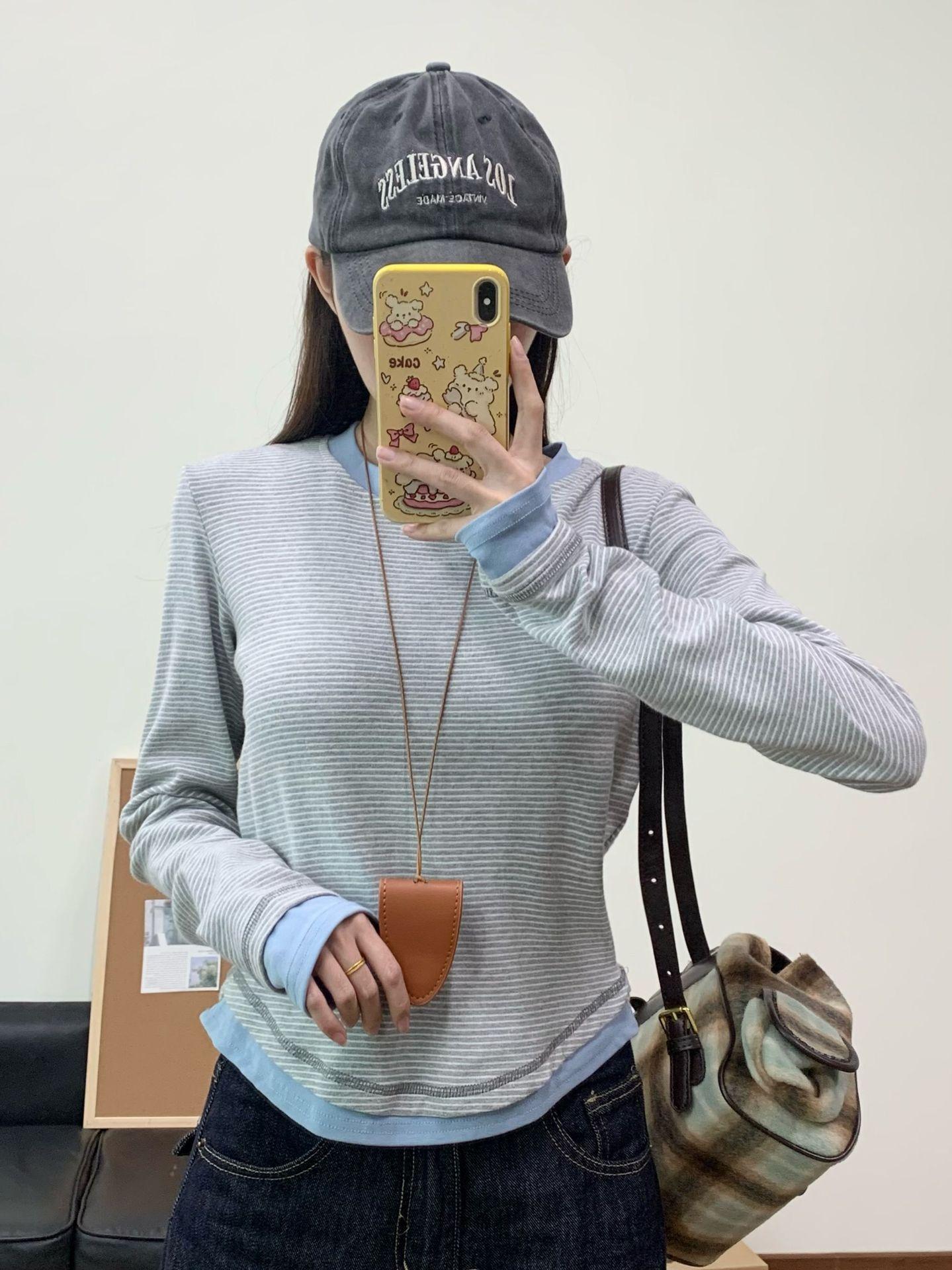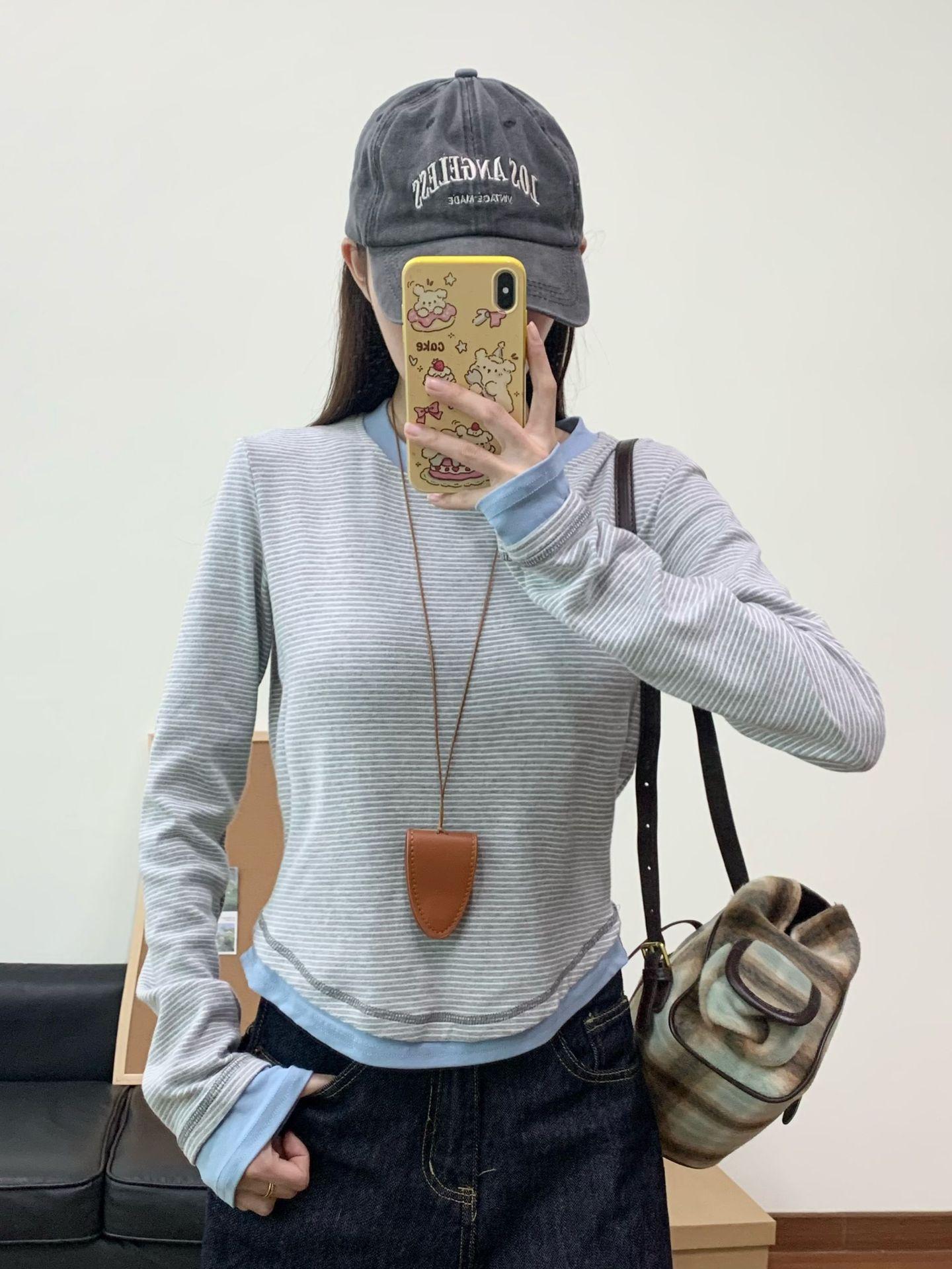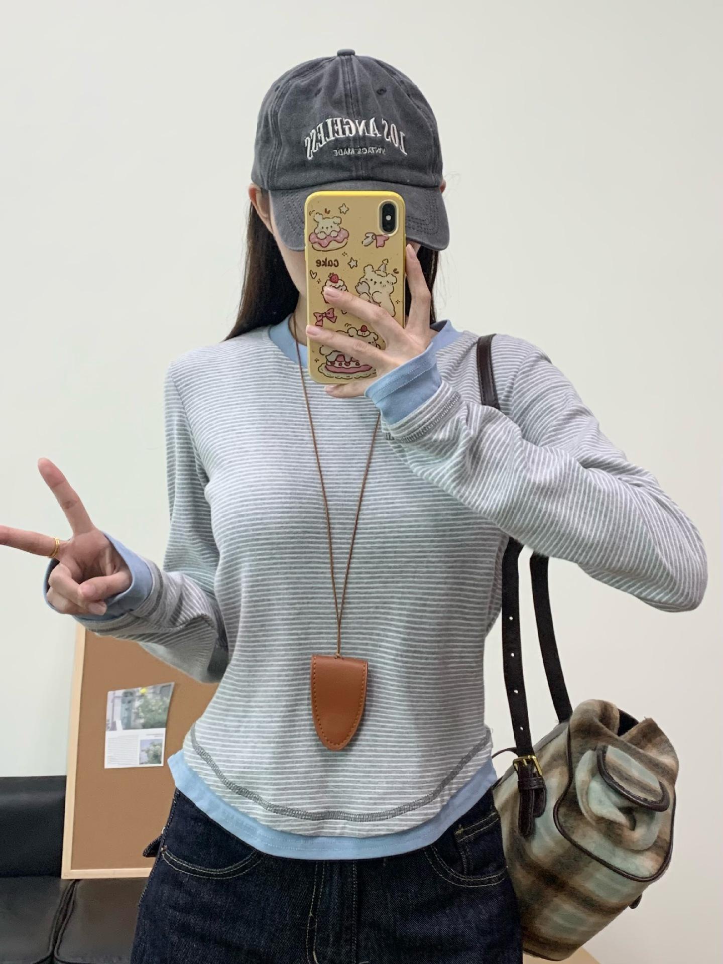 Camiseta feminina estilo americano retrô Spice Girl ombro manga comprida primavera e outono nova camisa slim fit emagrecedora base interna top listrado