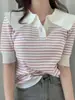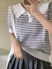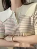 Vintage listrado gola polo suéter de manga curta feminino verão ombro fino camiseta moda antienvelhecimento bonito top roupas