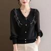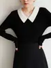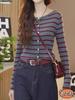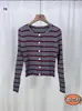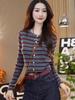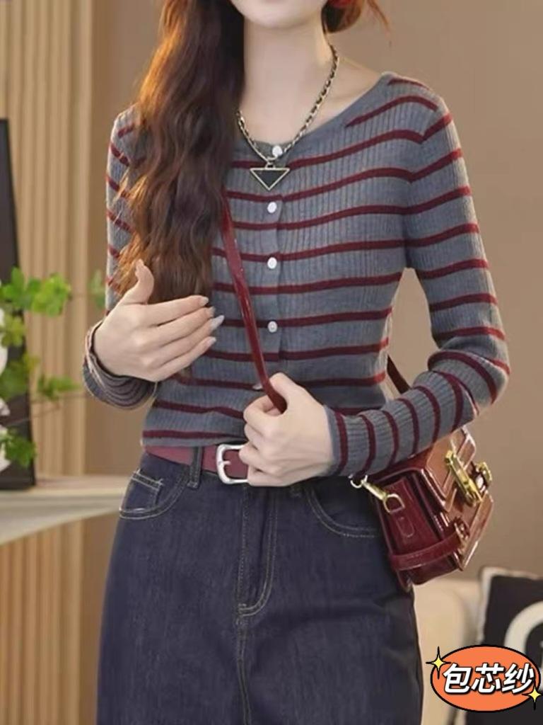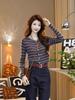 Design Sense Suéter listrado com cores que reduzem a idade, feminino, início do outono, manga comprida, novo cardigan elegante, base interna, camisa, top