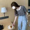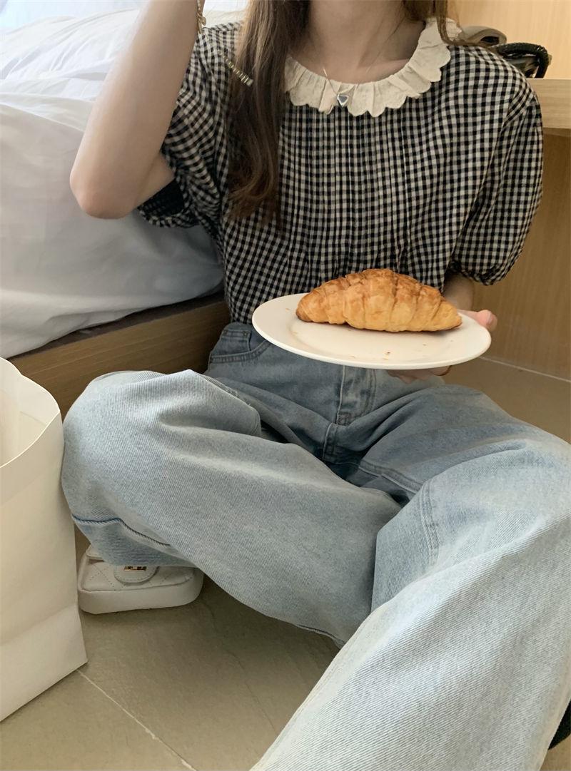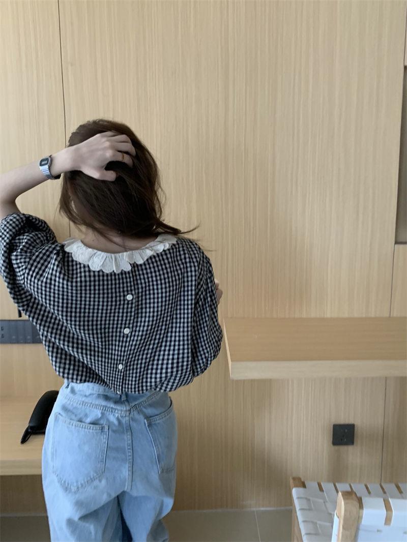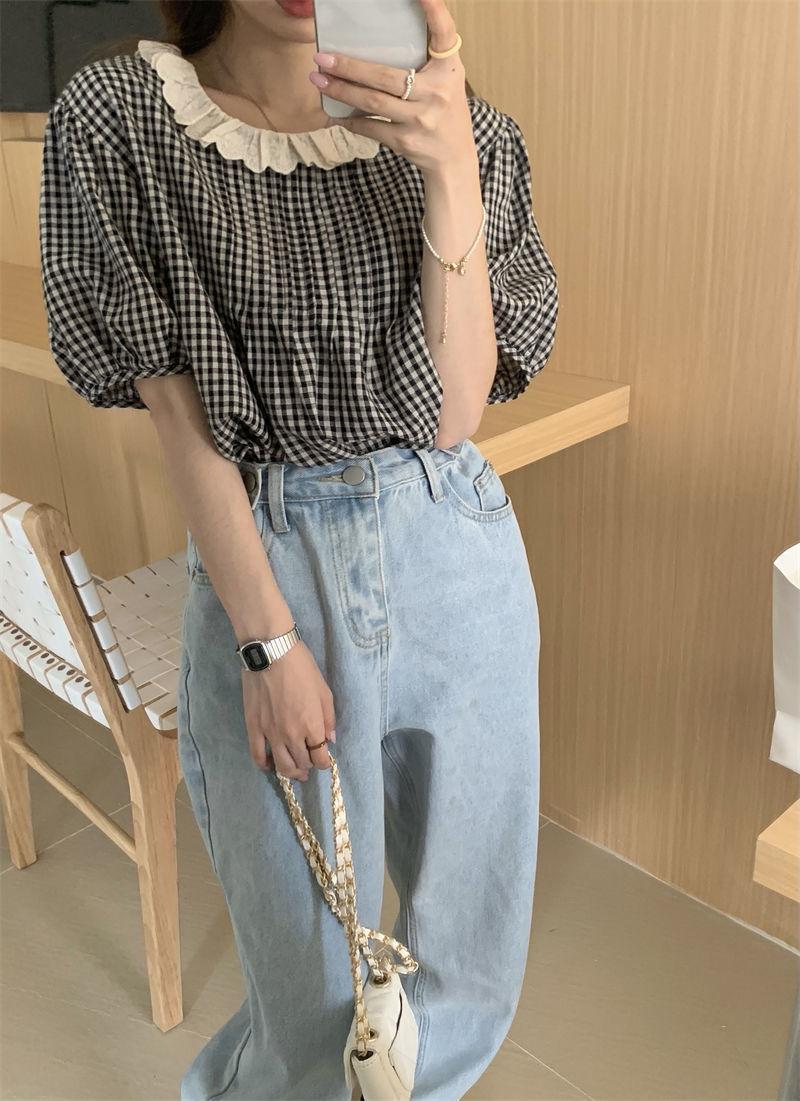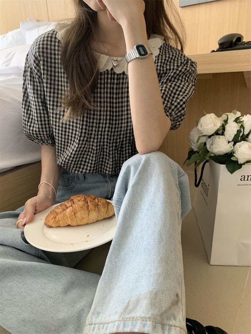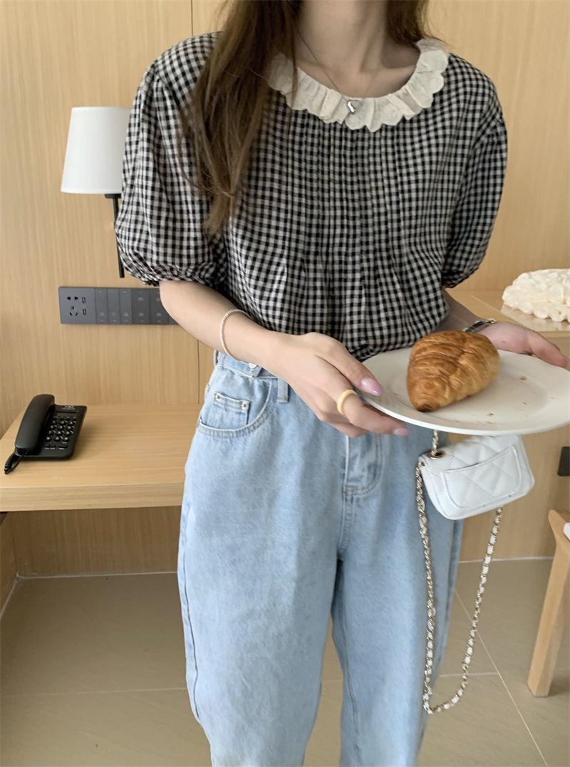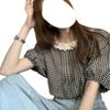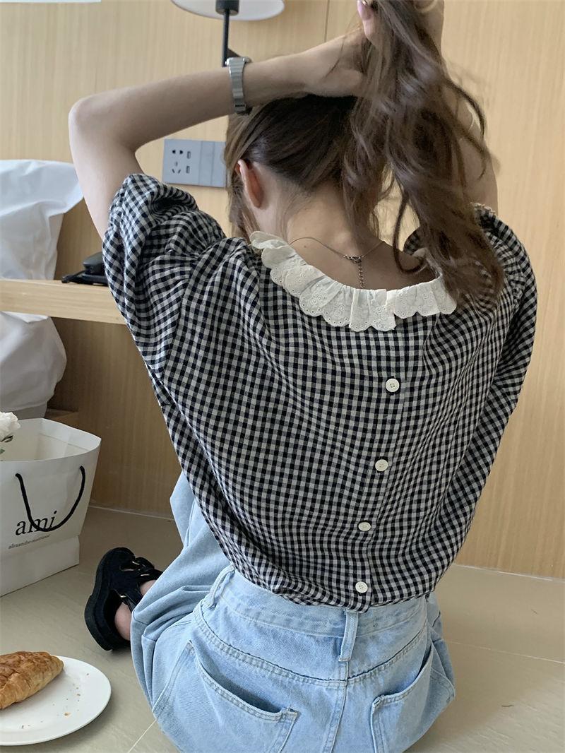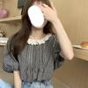 Camisa xadrez de renda com manga bufante feminina verão 2022 novo pulôver de nicho francês solto para uso externo blusa de manga curta