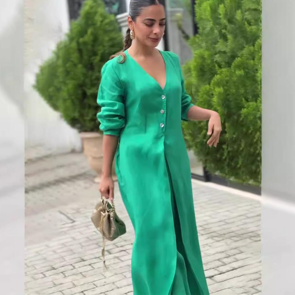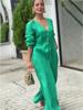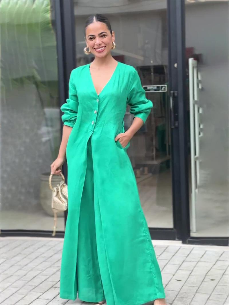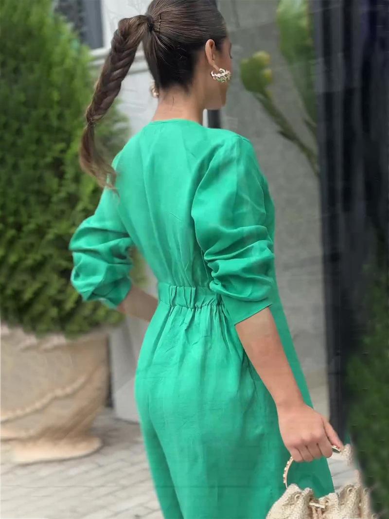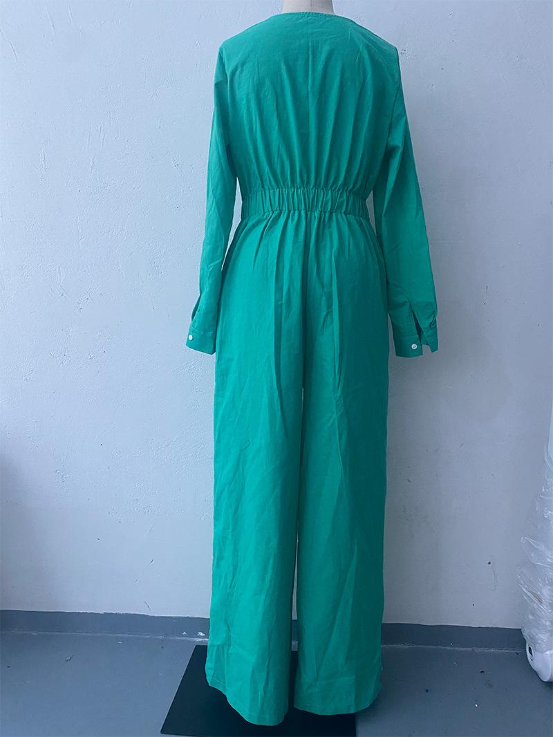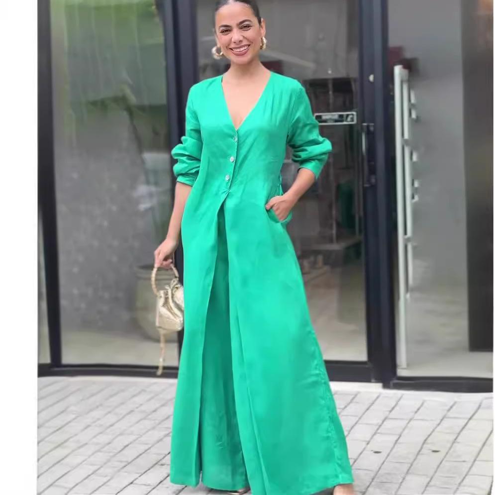 2024 Amazon Verão Europeu e Americano Nova Cor Sólida Decote em V Manga Longa Sexy Moda All-match Cintura Calças Femininas