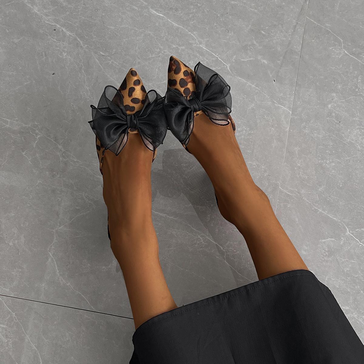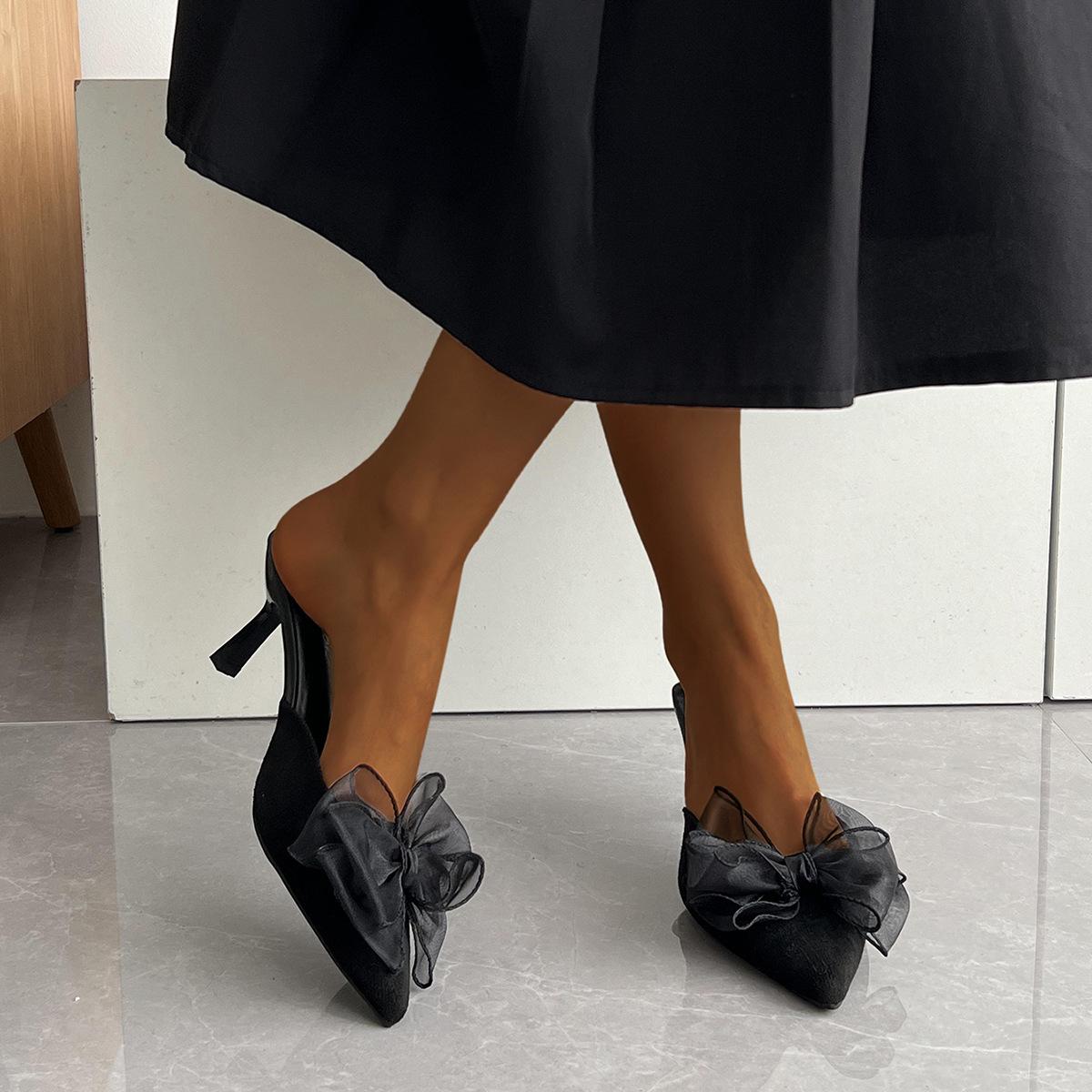 Chinelos de salto agulha femininos 2025 verão novo laço preto elegante sexy salto alto pontudo tamanho grande comércio exterior