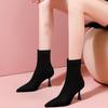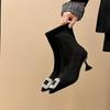 Botas Femininas Outono e Inverno 2024 Salto Agulha Camurça Preta Botas Stretch Fivela Quadrada de Strass Bico Fino Botas da Moda