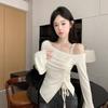 Camiseta de manga comprida com ombro inclinado de algodão puro feminina outono 2025 nova blusa de ombro aberto estilo solto de alta qualidade