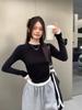 Design Sense Fake Two-piece Base Shirt Camiseta Plissada de Costura Feminina Início da Primavera Ombro Pequeno Estilo Americano Retro Top de Manga Comprida