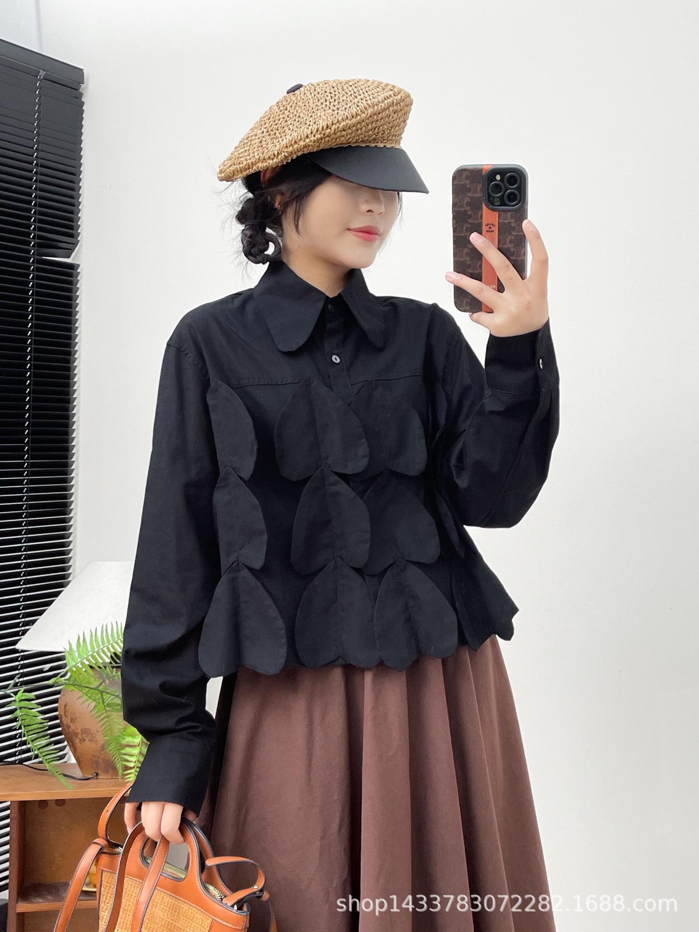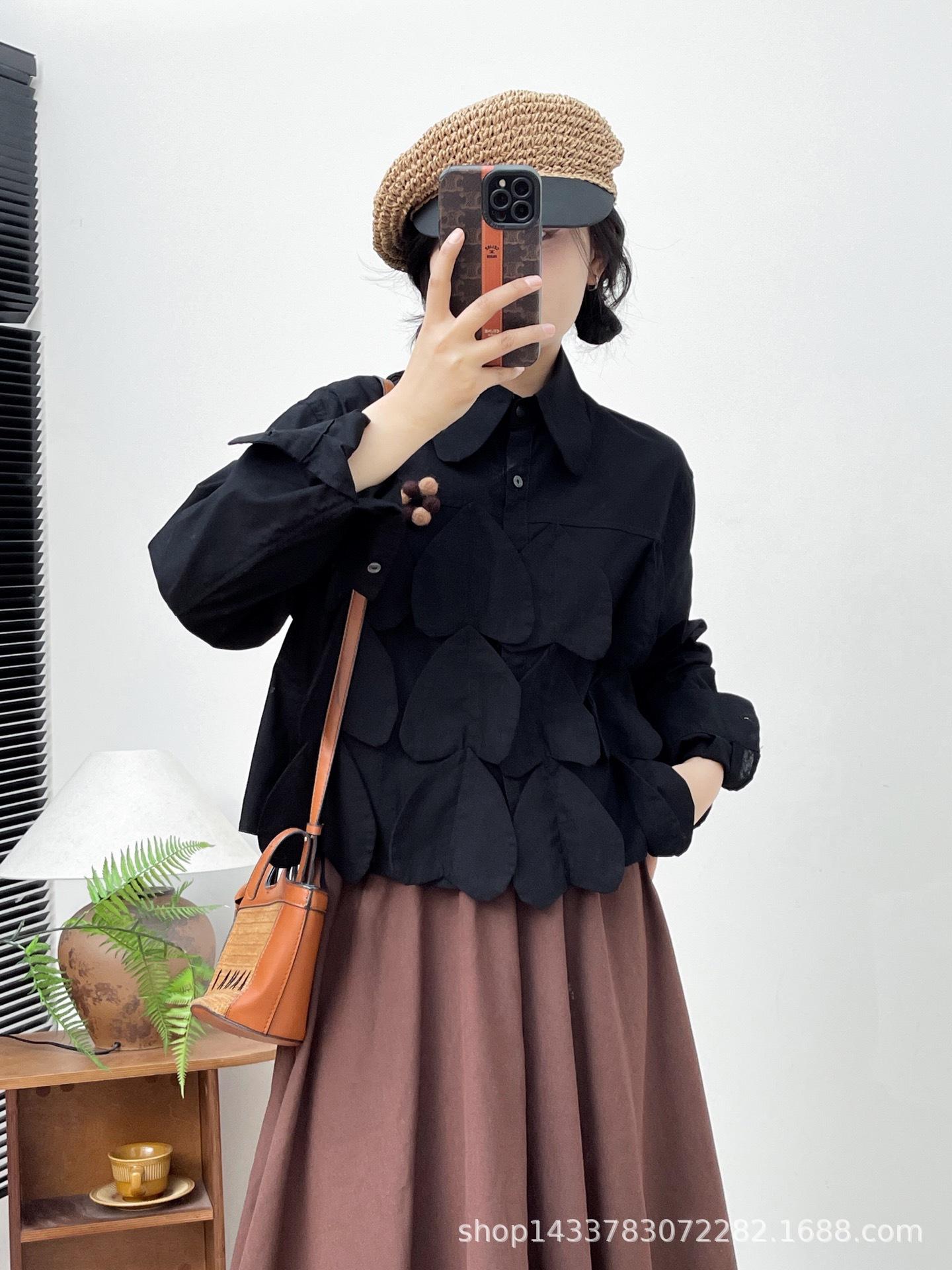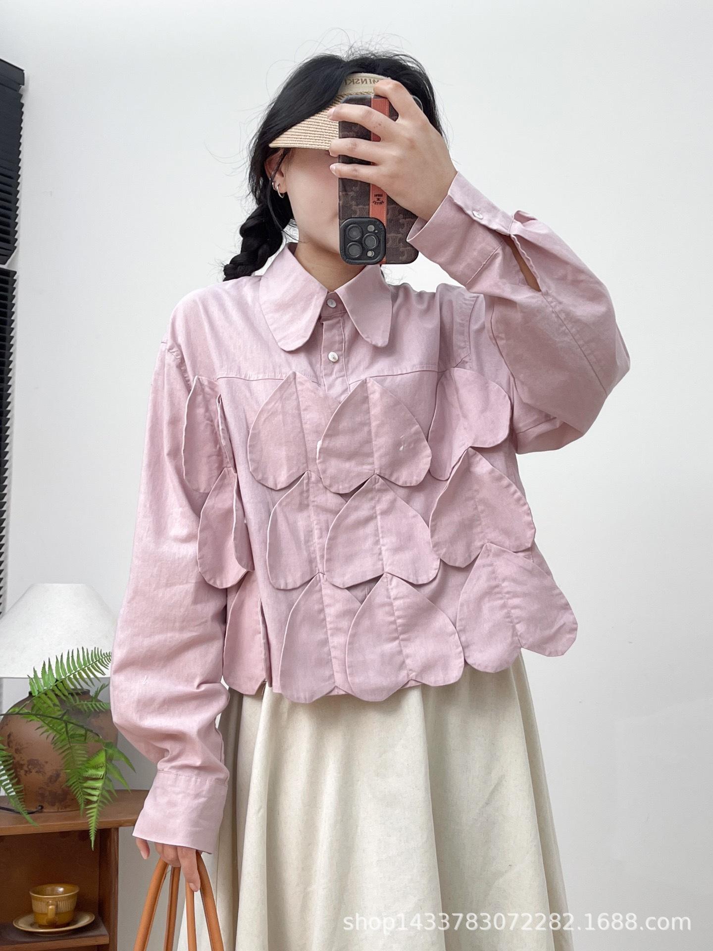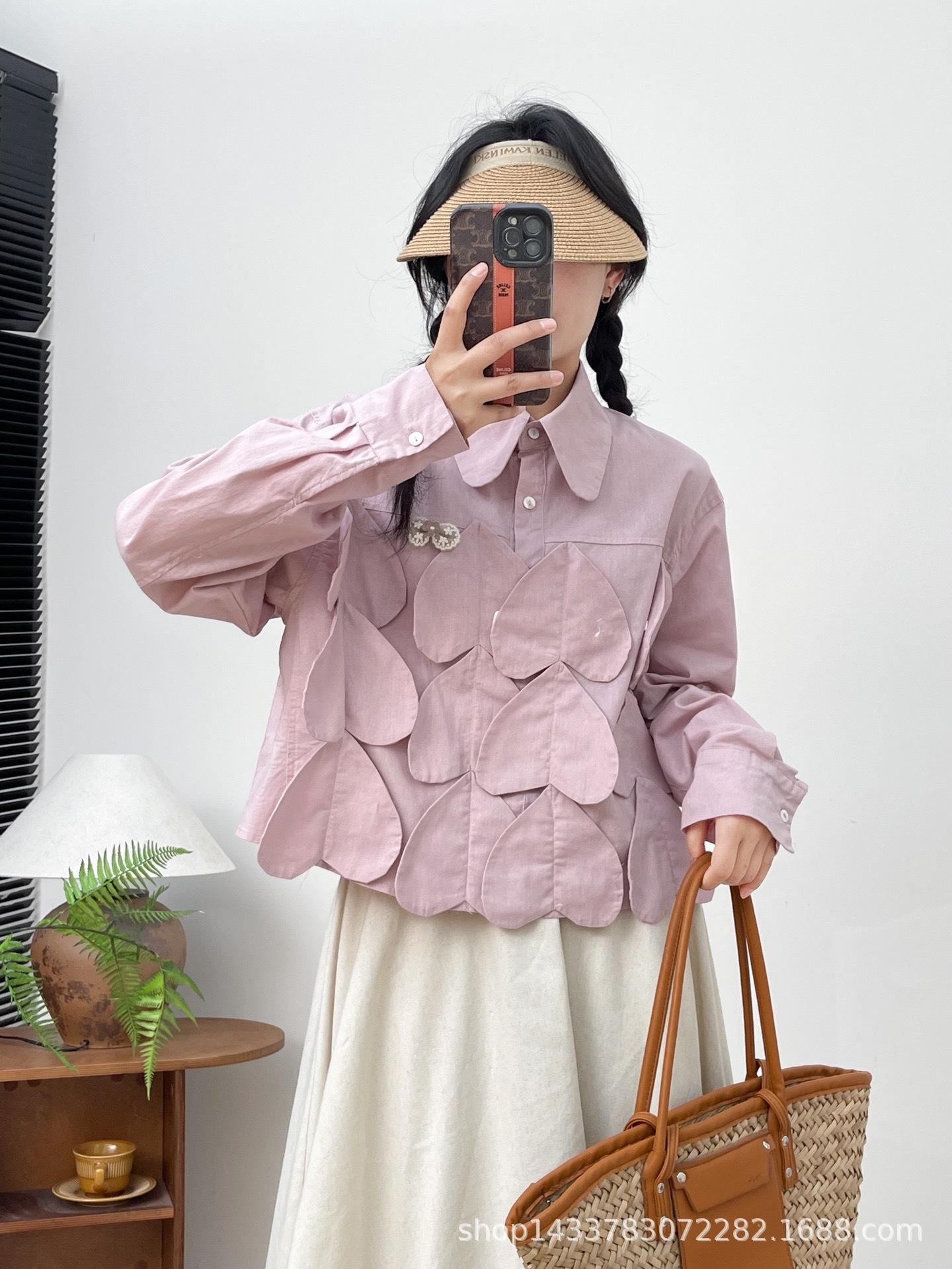 Início da Primavera Novo Amor Patch Algodão Camisa de Manga Comprida com Lapela Top Curto, Camisa com Caimento Solto e Emagrecedor