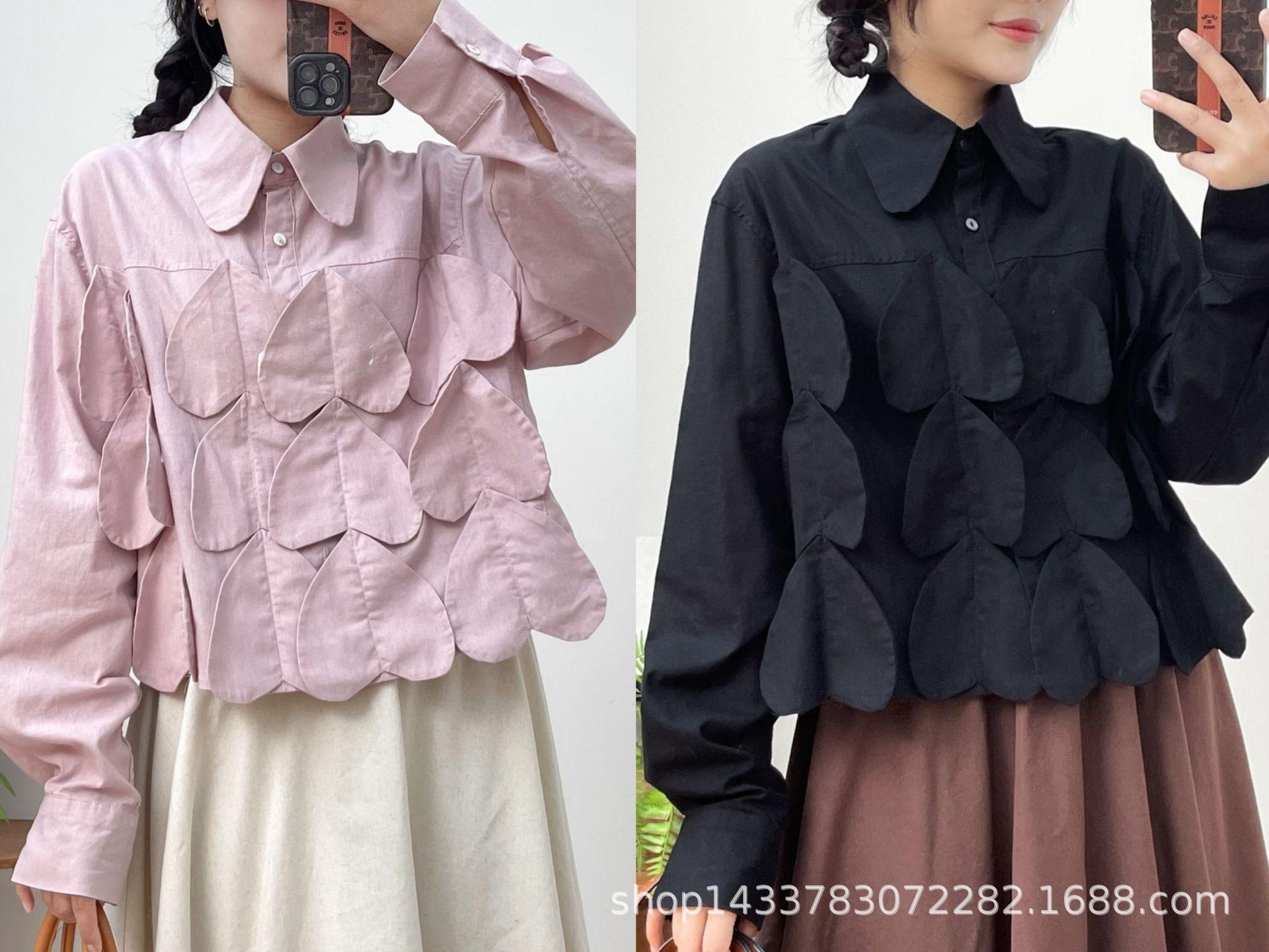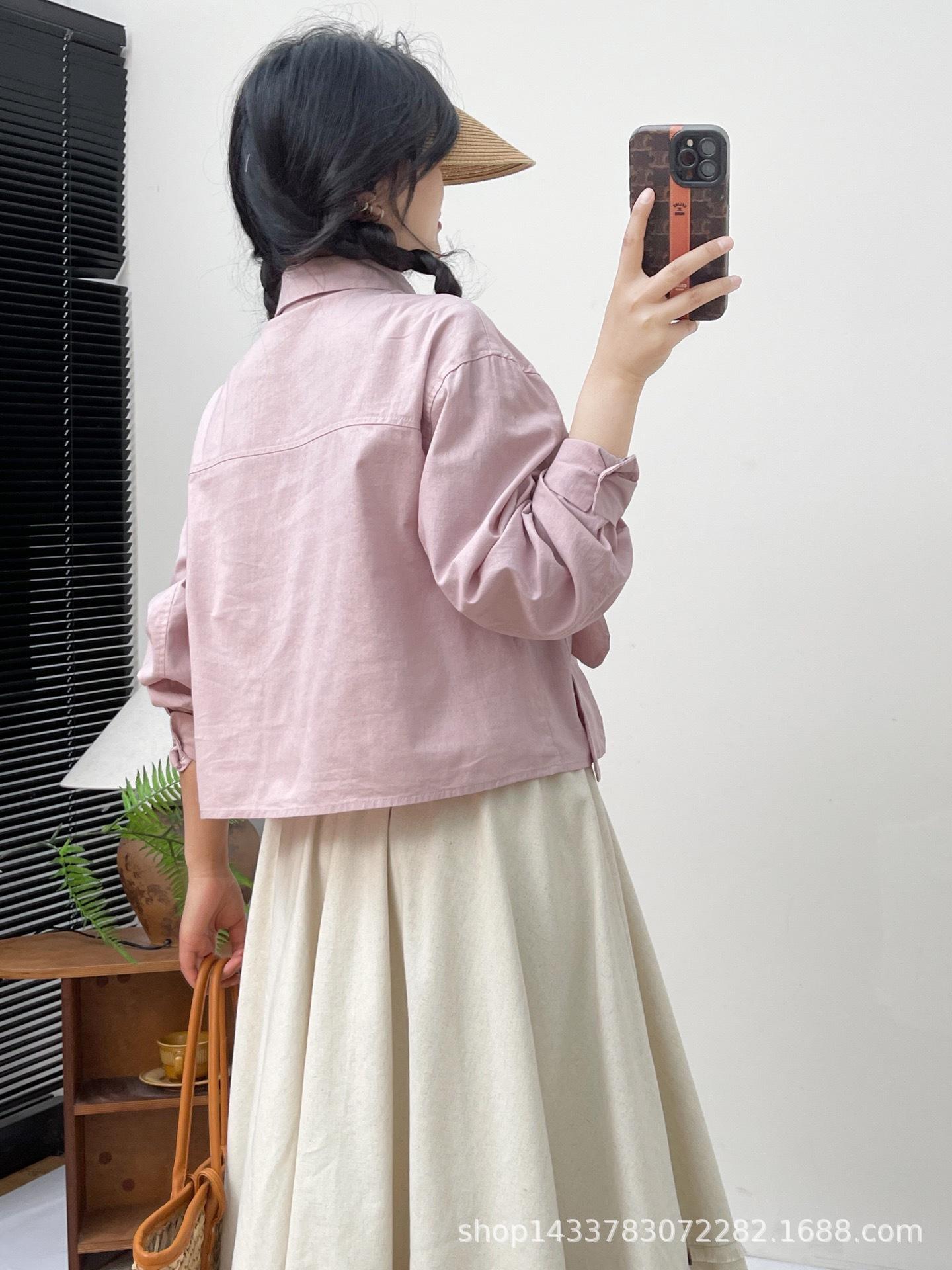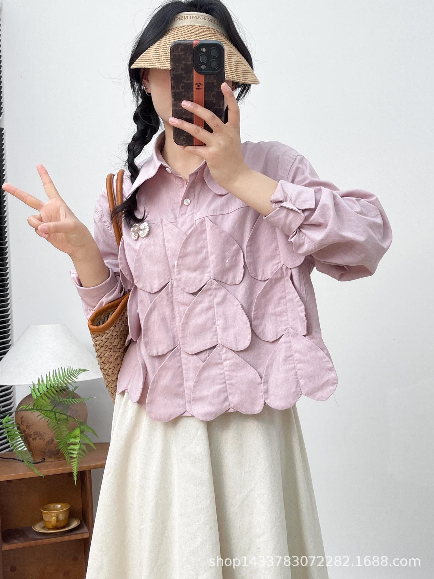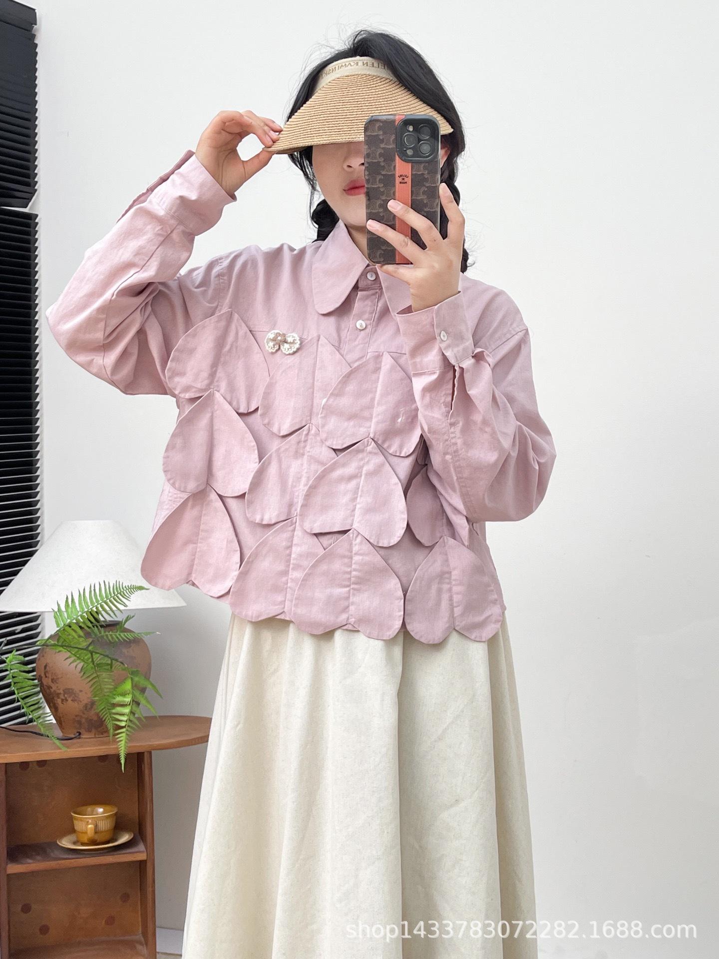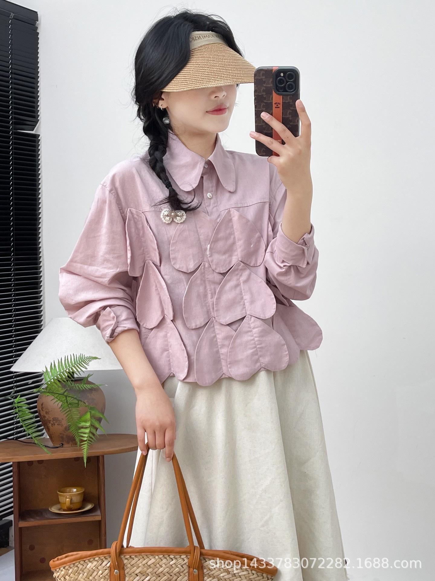 Início da Primavera Novo Amor Patch Algodão Camisa de Manga Comprida com Lapela Top Curto, Camisa com Caimento Solto e Emagrecedor