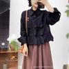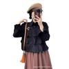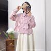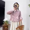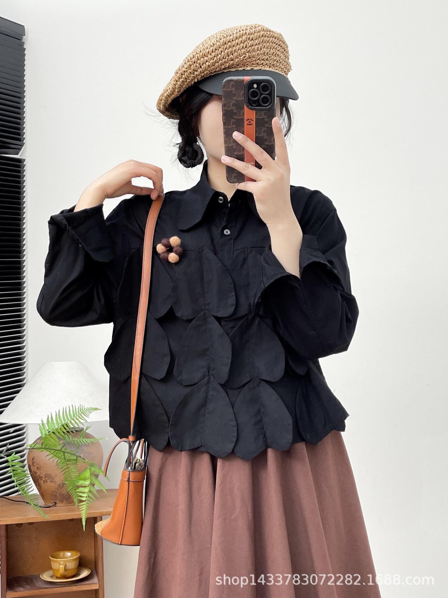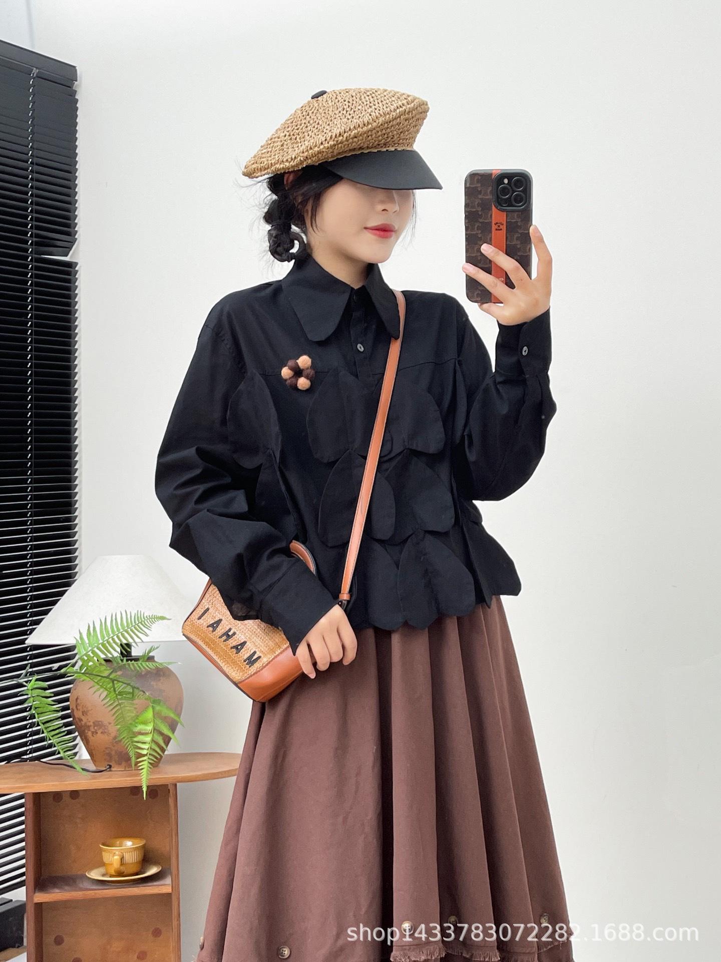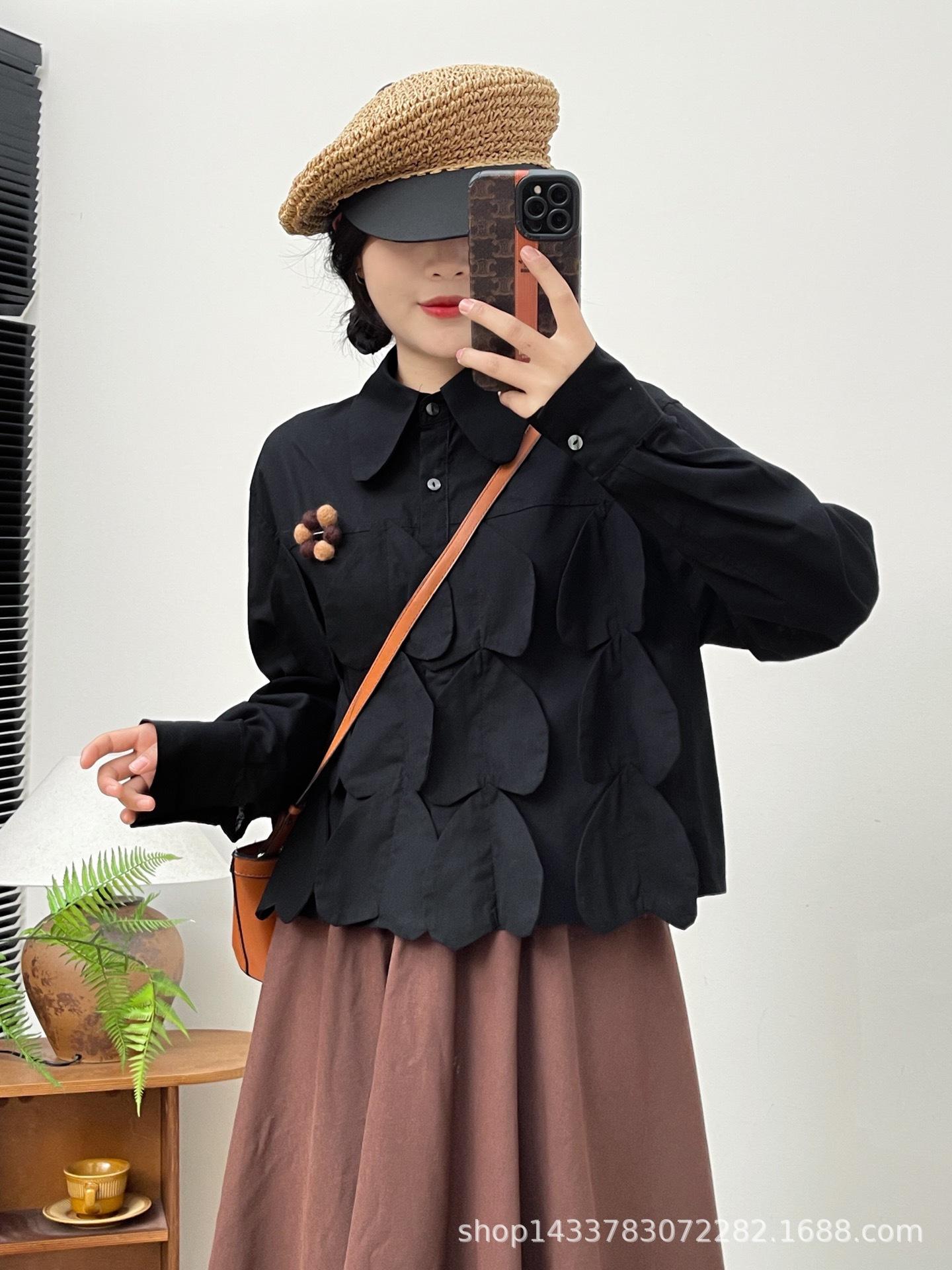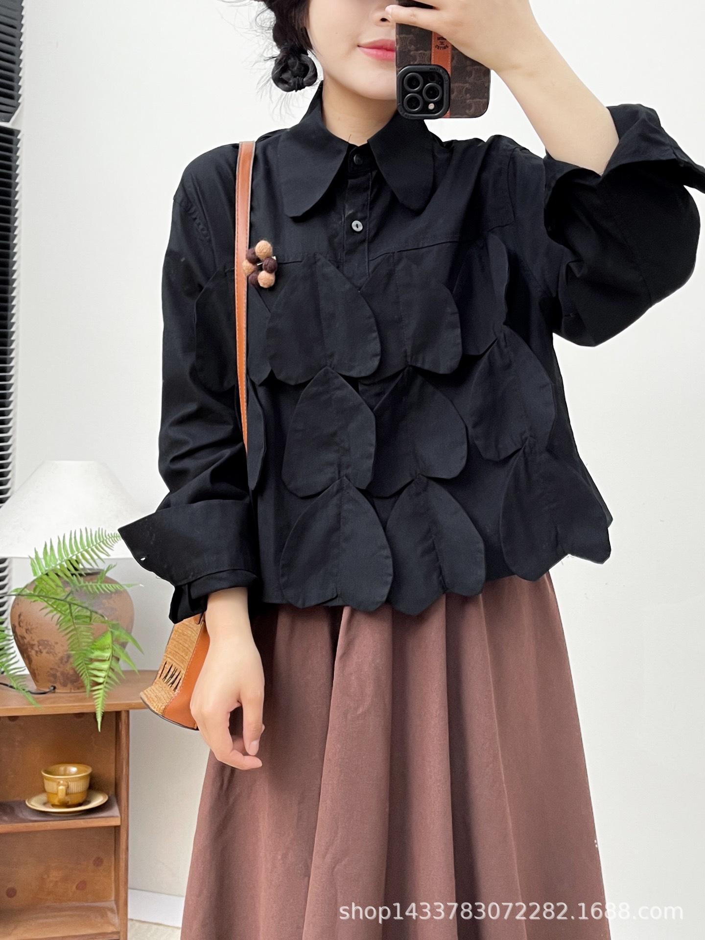Início da Primavera Novo Amor Patch Algodão Camisa de Manga Comprida com Lapela Top Curto, Camisa com Caimento Solto e Emagrecedor