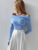 Blusa casual azul de outono com gola alta, ajuste fino, ombros estreitos, camiseta de manga comprida, roupa feminina de malha para viajantes europeus e americanos