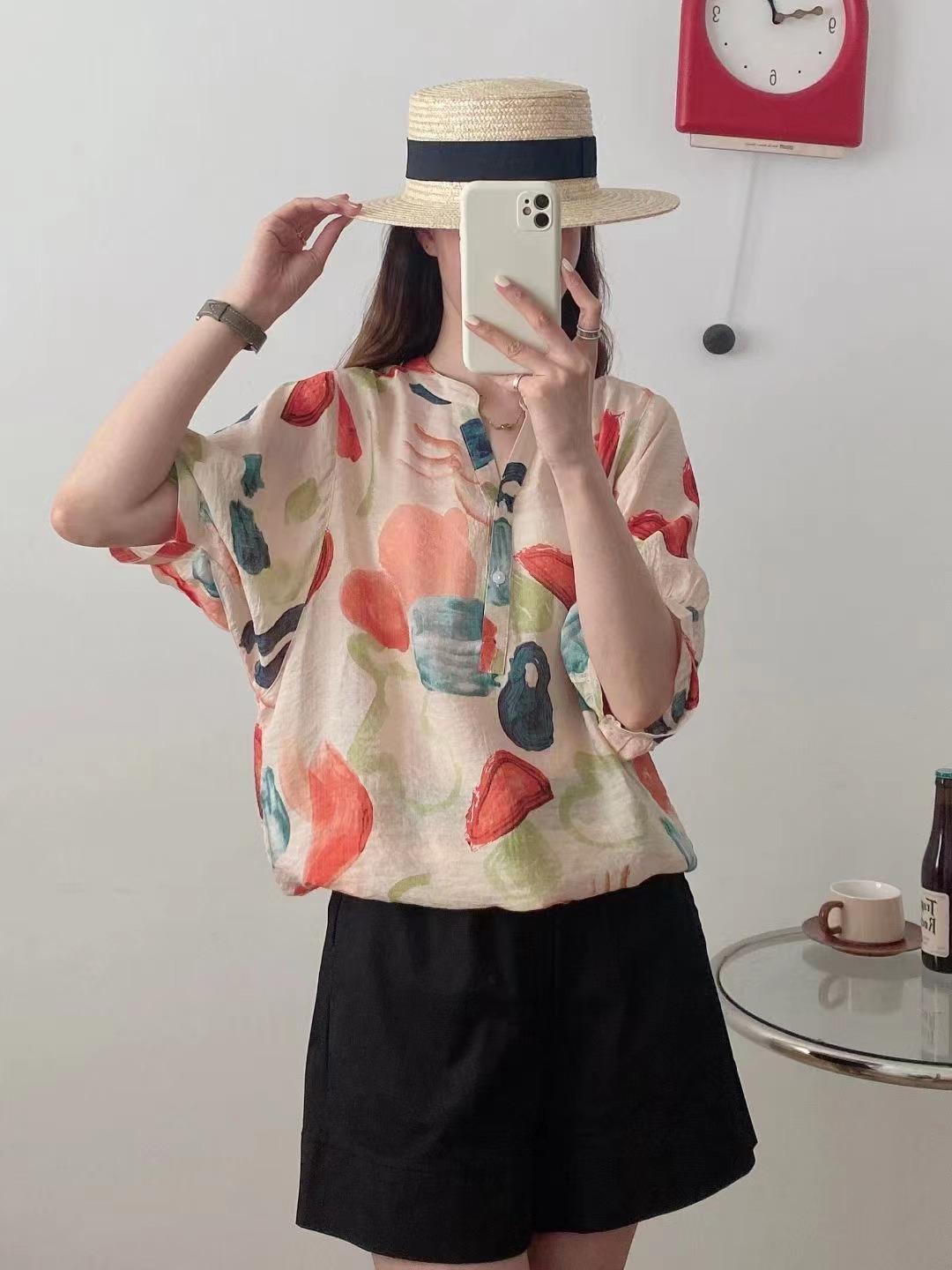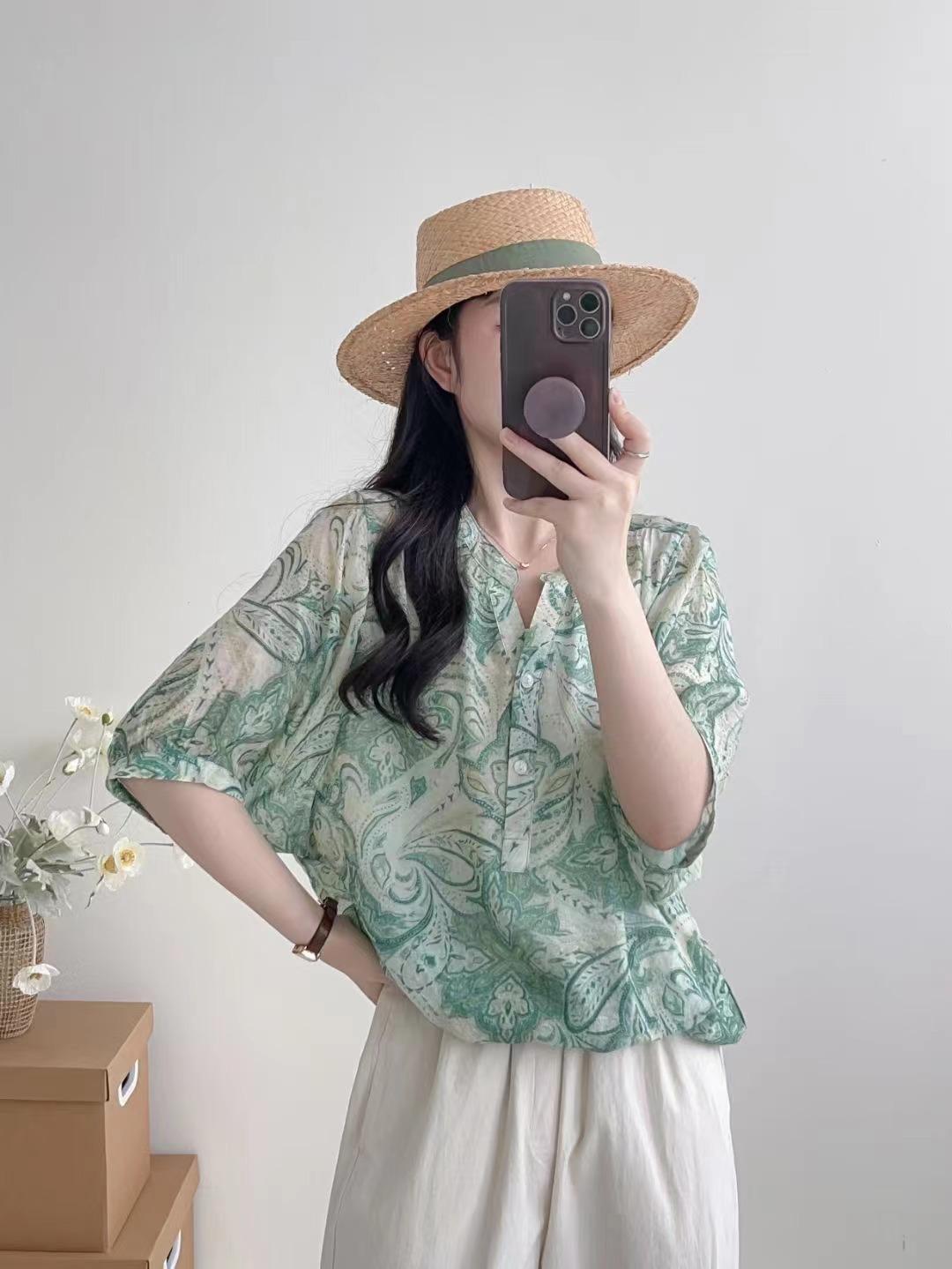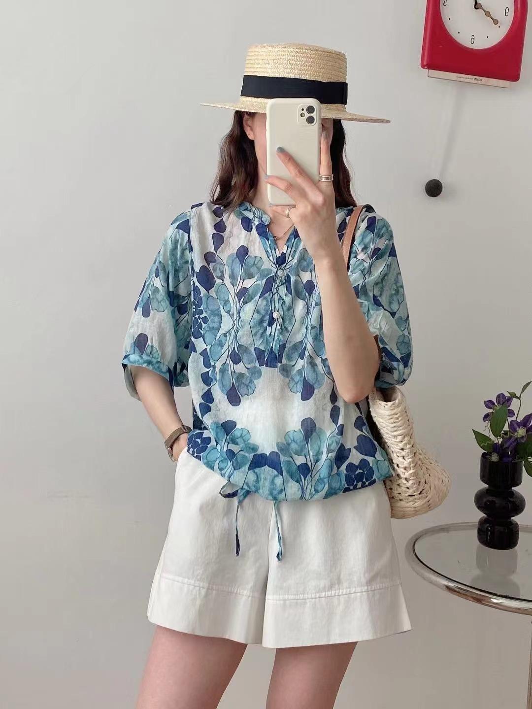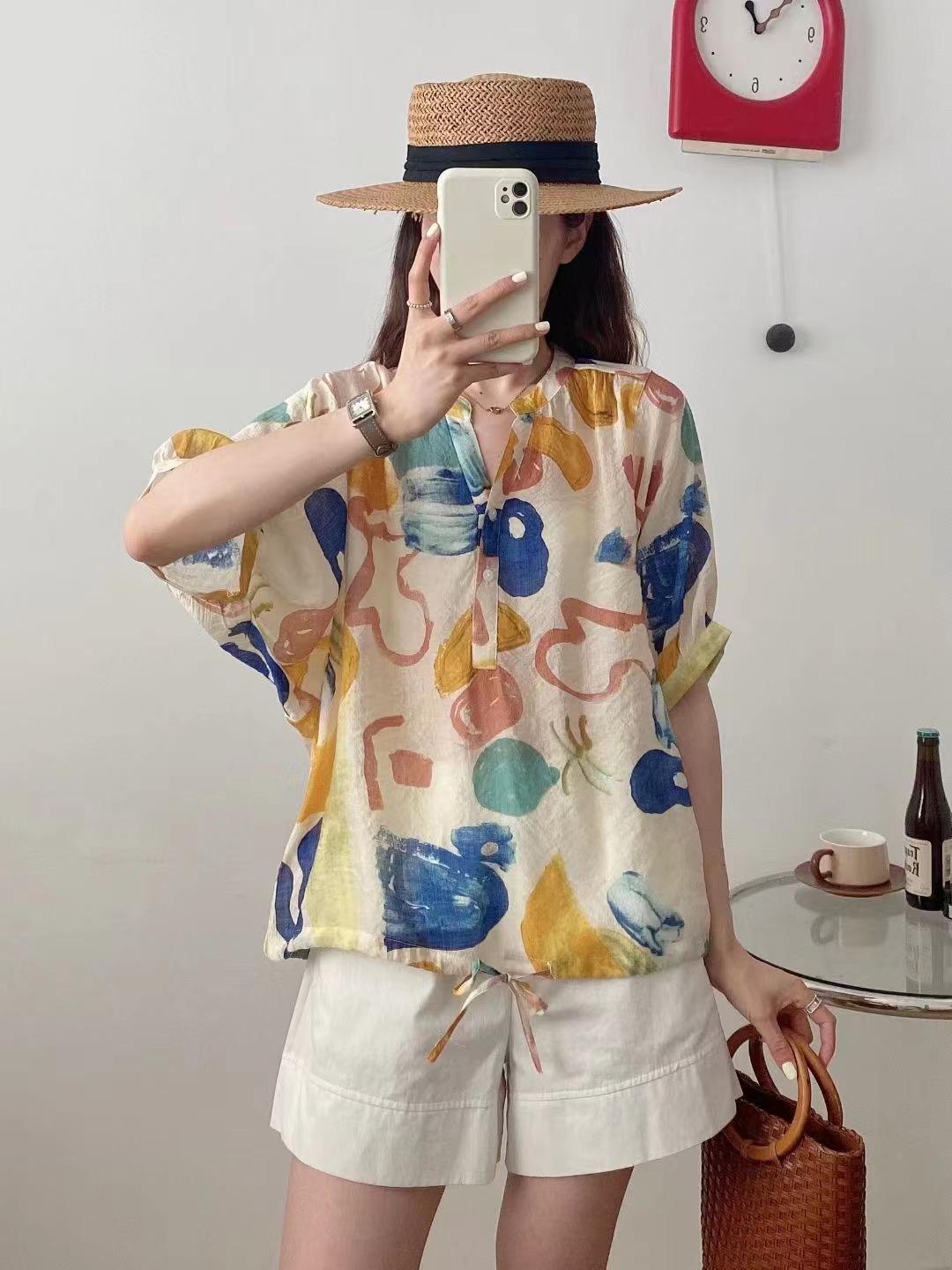 Camisa estampada em tencel leve drapeada estilo coreano, nova camisa feminina de verão com decote em V, manga curta solta e visual slim