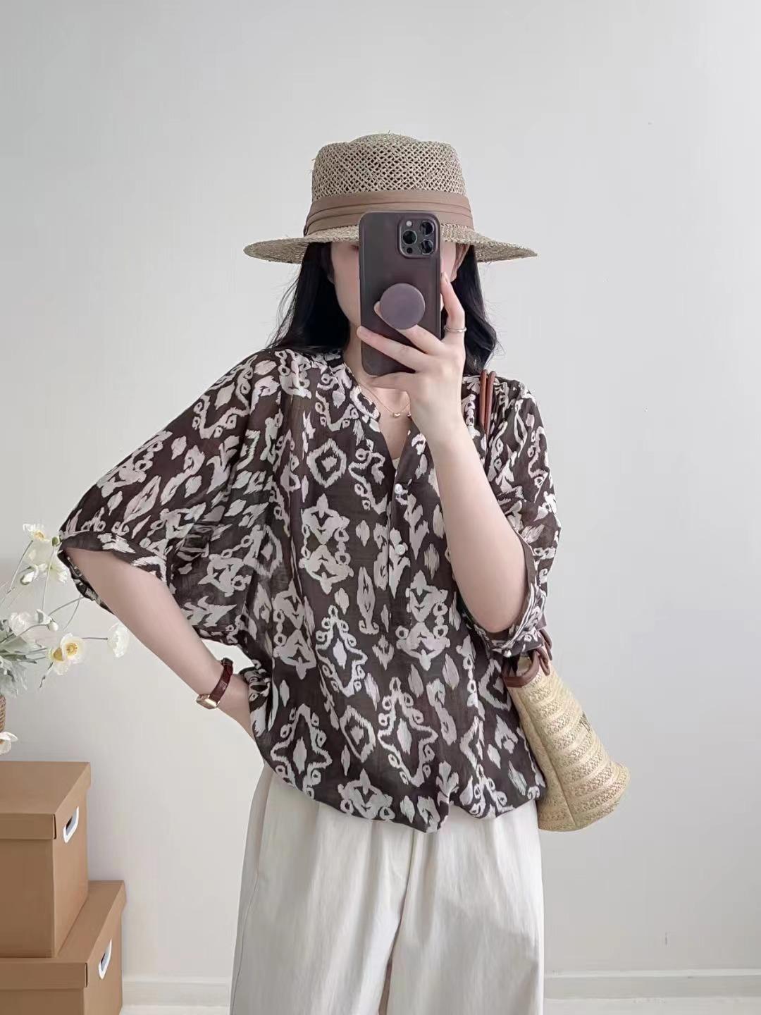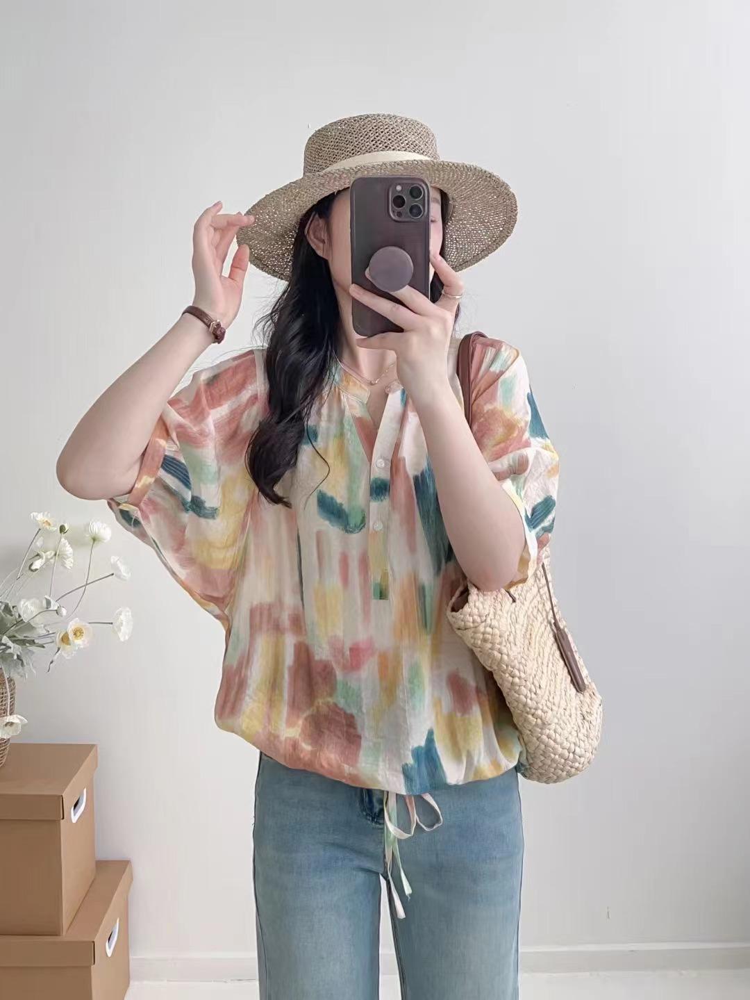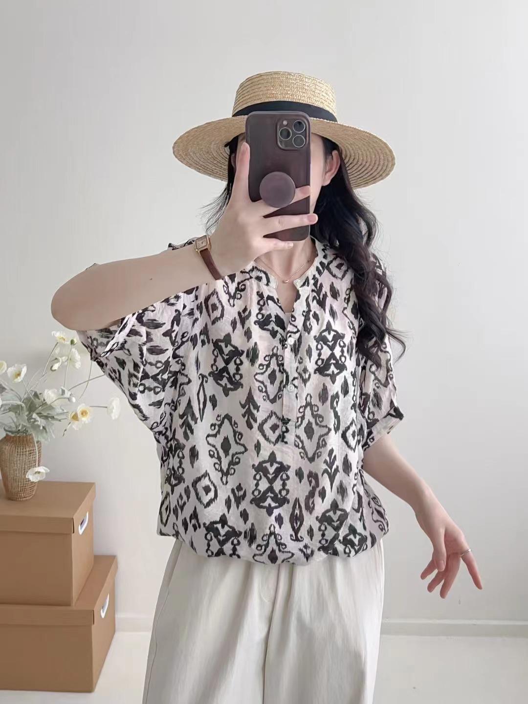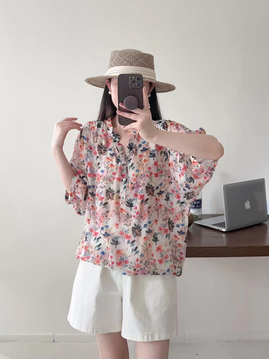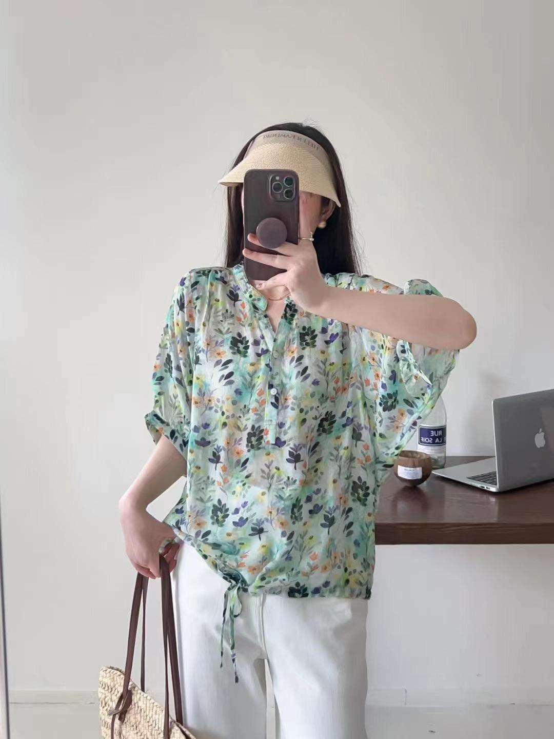 Camisa estampada em tencel leve drapeada estilo coreano, nova camisa feminina de verão com decote em V, manga curta solta e visual slim