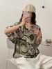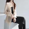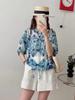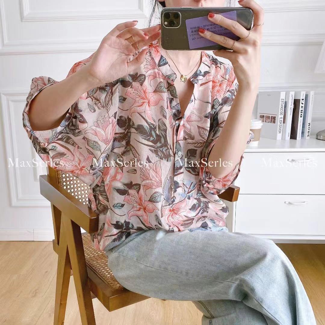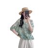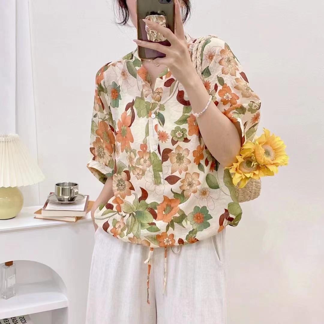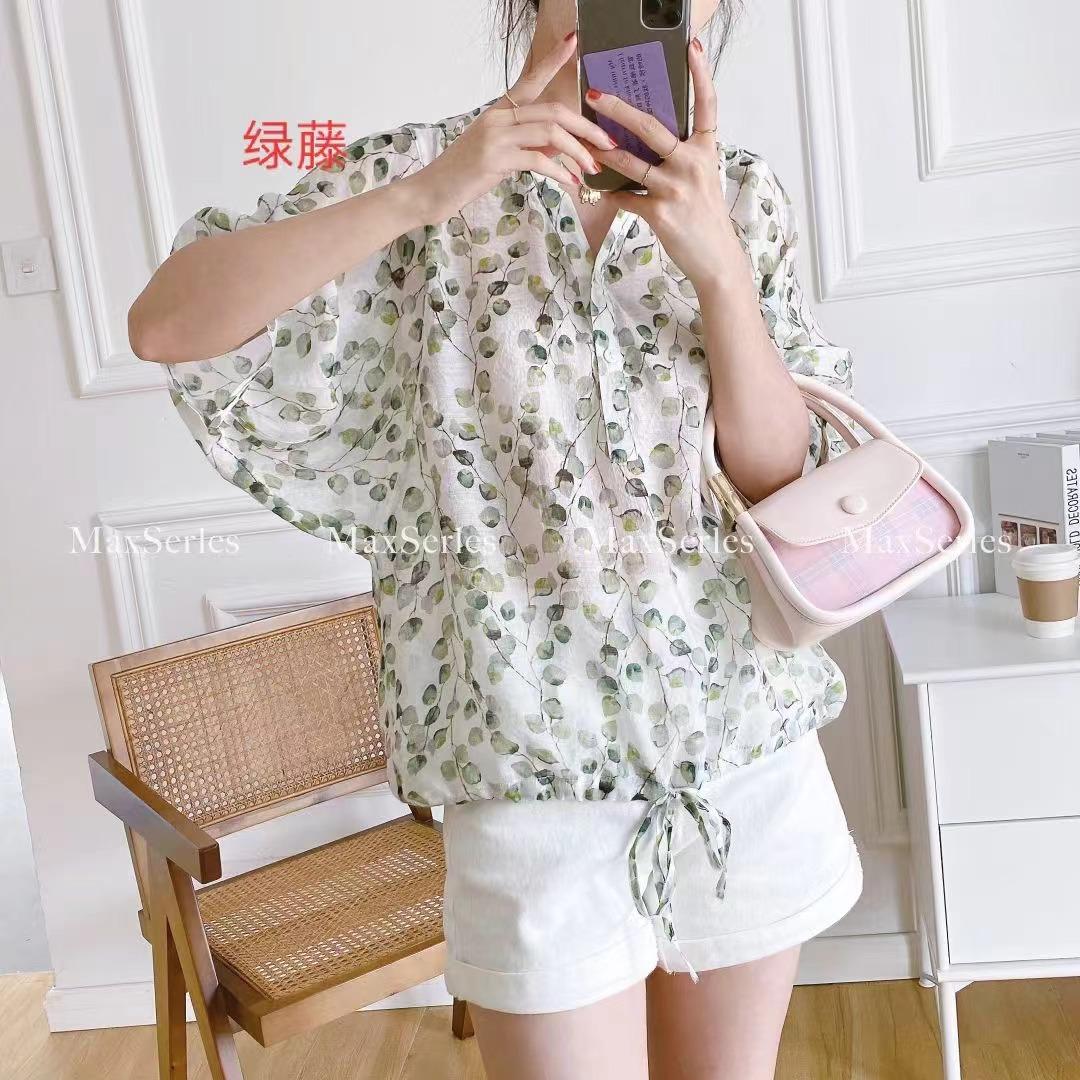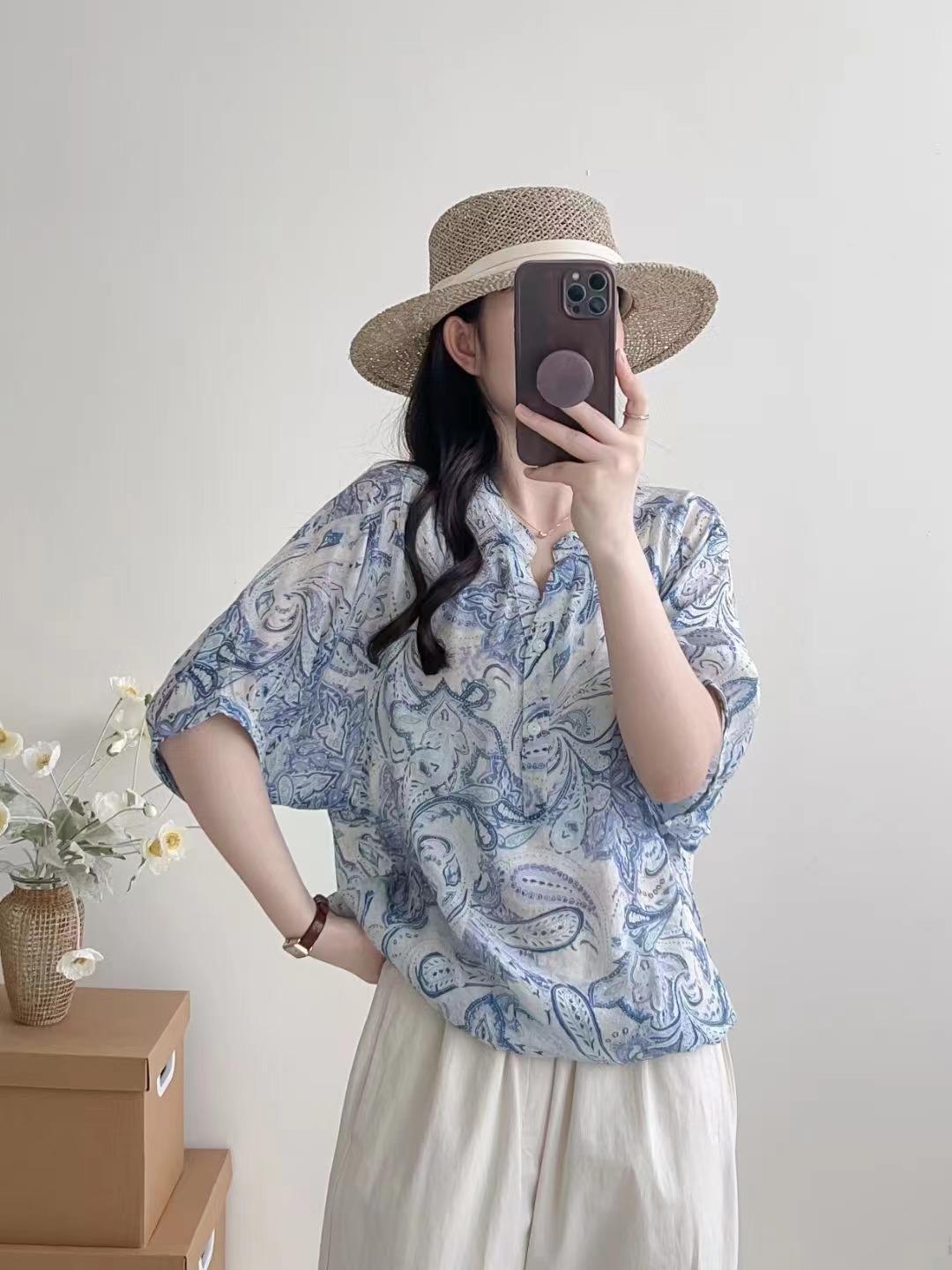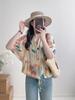 Camisa estampada em tencel leve drapeada estilo coreano, nova camisa feminina de verão com decote em V, manga curta solta e visual slim
