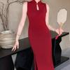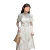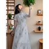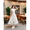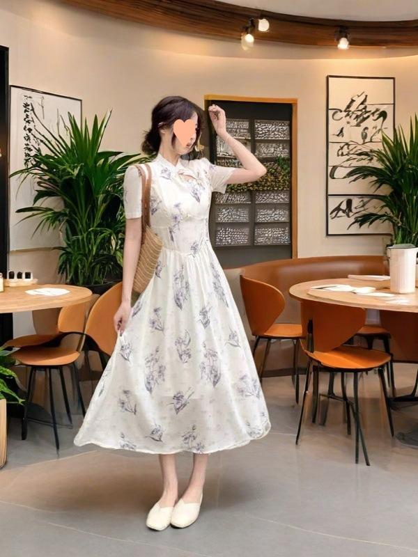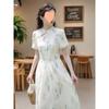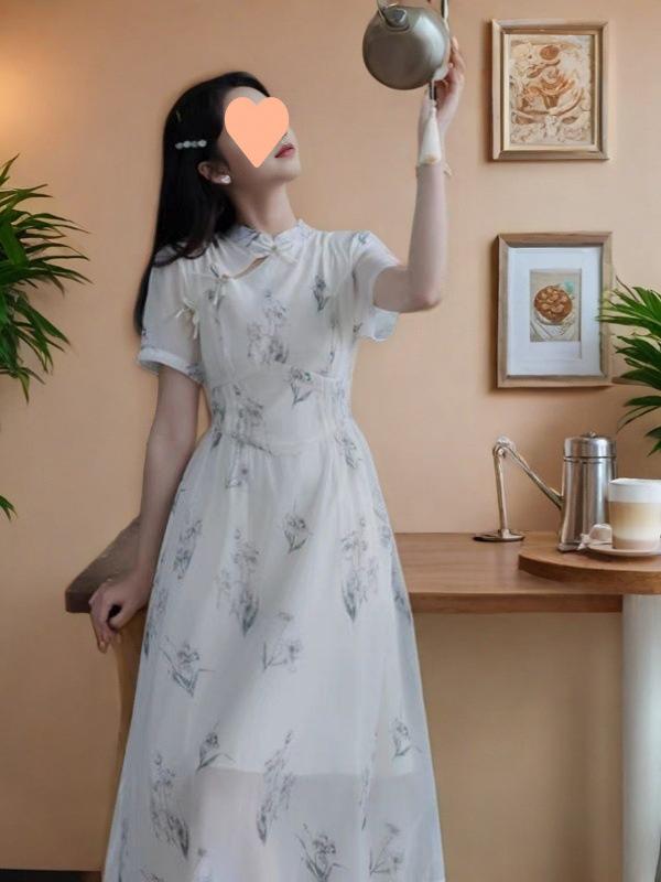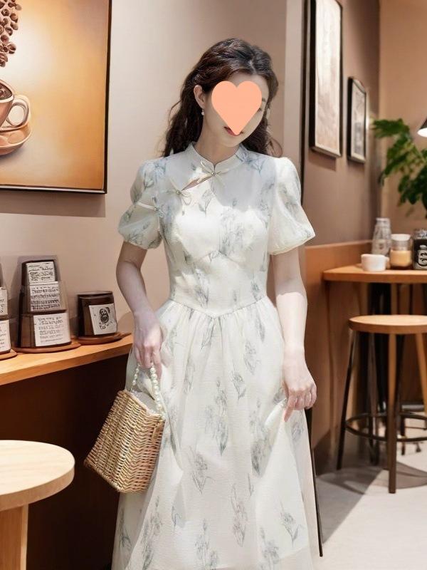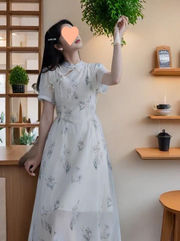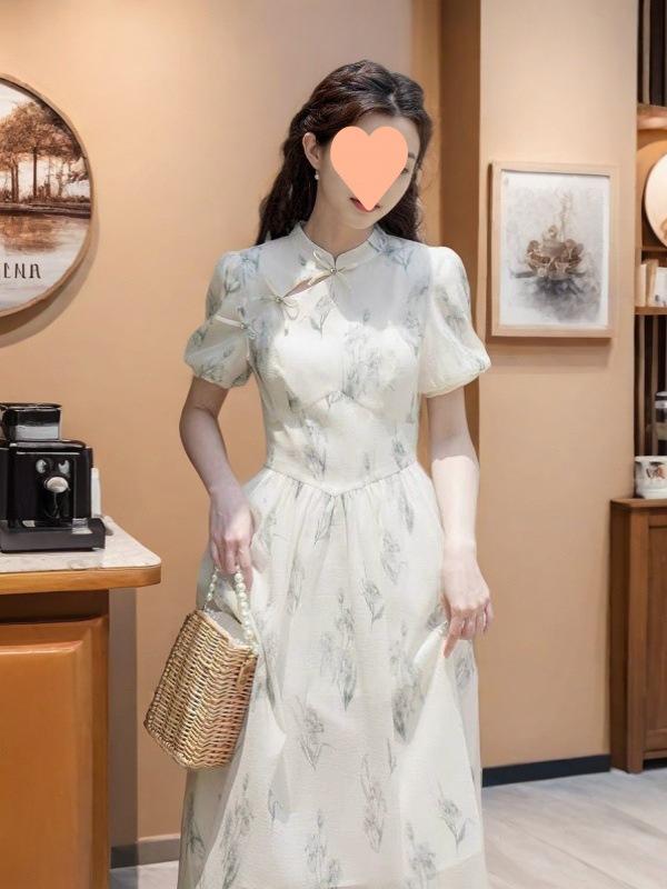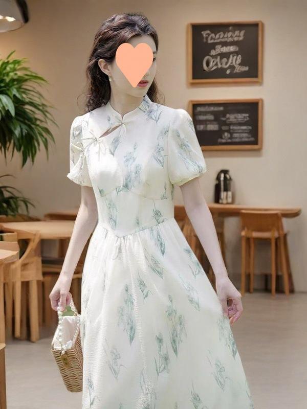 2025 Novo vestido estilo chinês feminino verão modificado cheongsam estilo nacional manga bolha cintura alta saia de chiffon francês