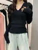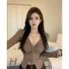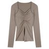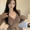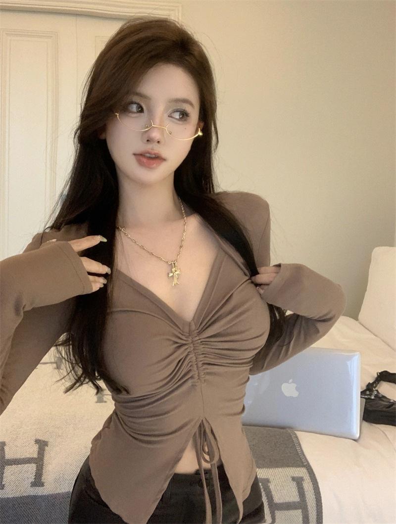 Spice Girls Camiseta de manga comprida com decote em V, sexy, com cordão, ajuste fino, cintura justa, emagrecimento, puro desejo, nicho, moda, ins, top exclusivo