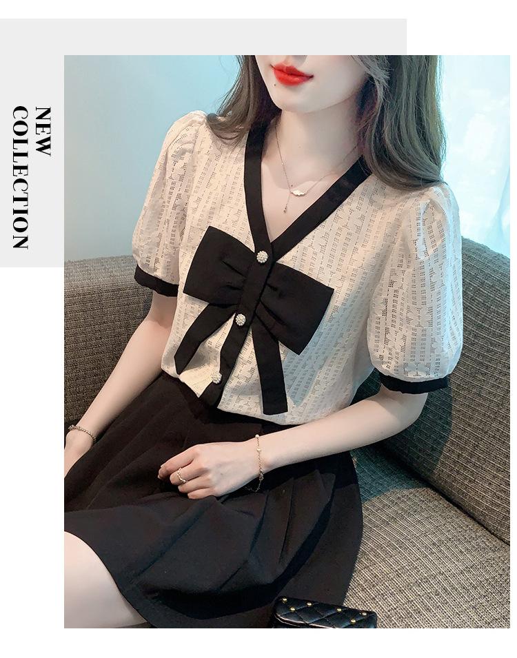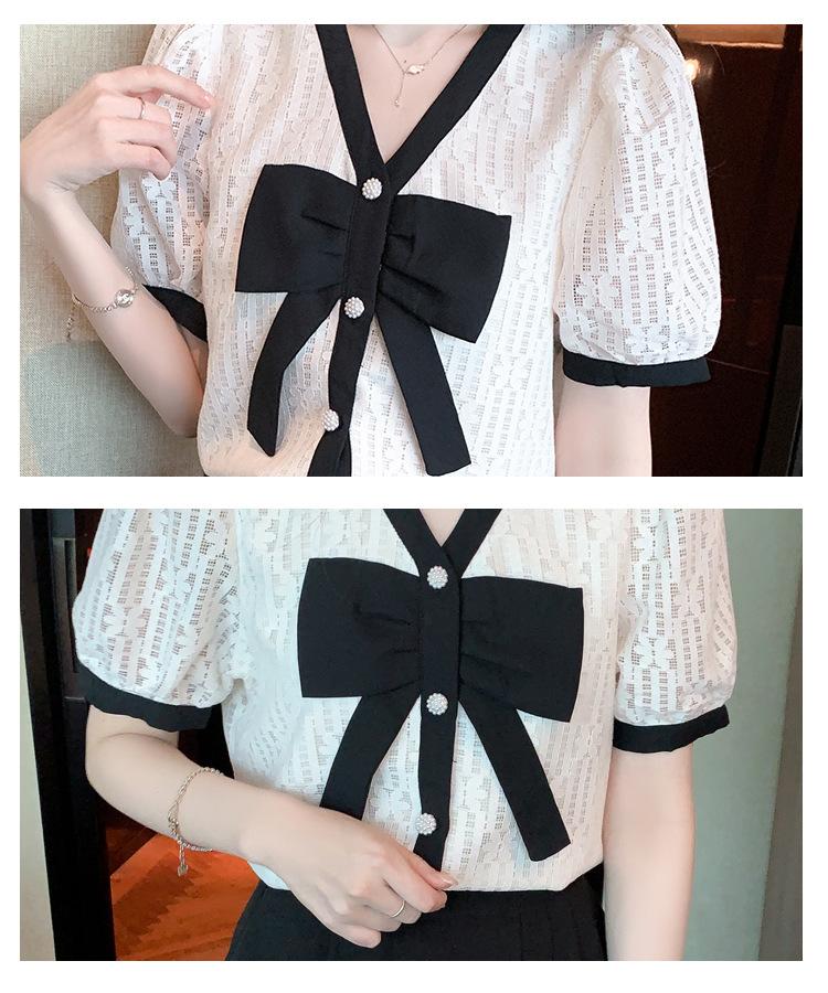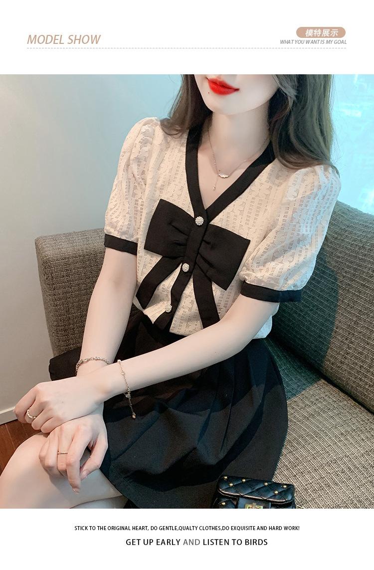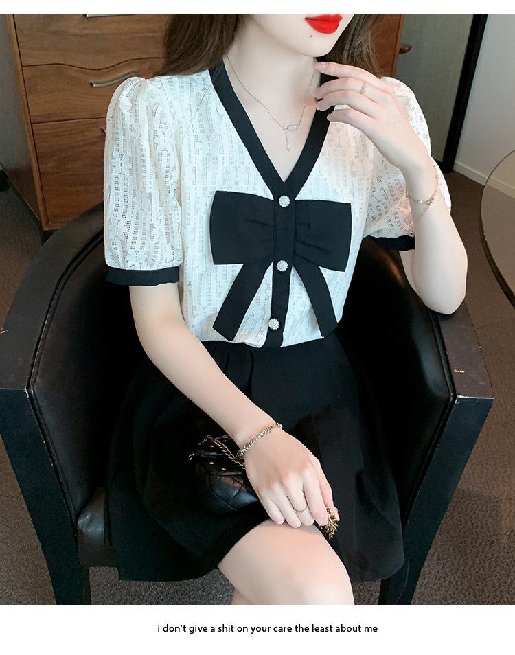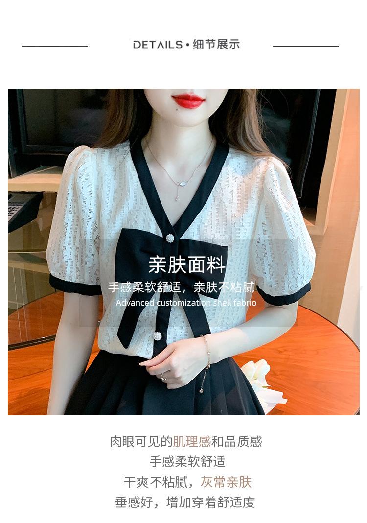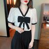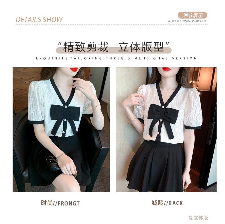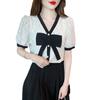 2025 Verão Novo Estilo Coreano All-match Costura Renda Camisa de manga curta Feminina Elegante Doce Fino Top com Laço