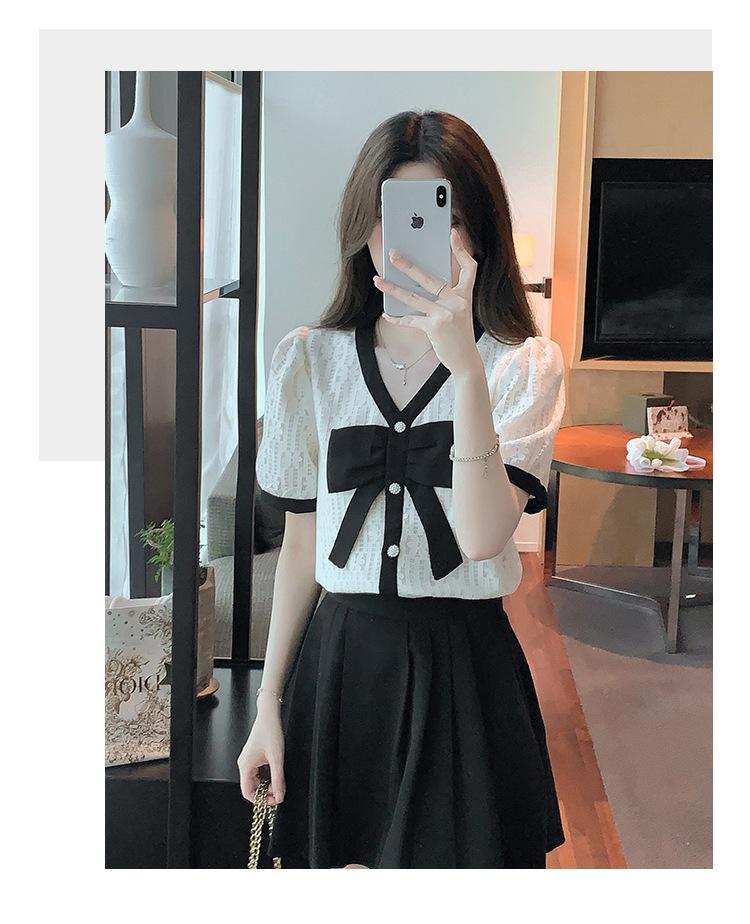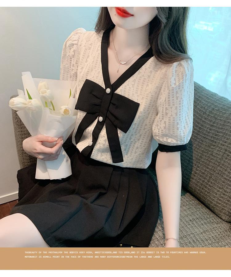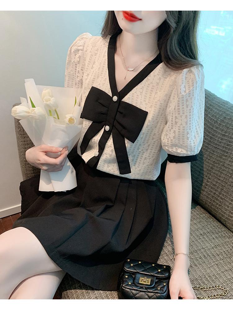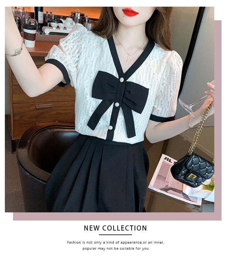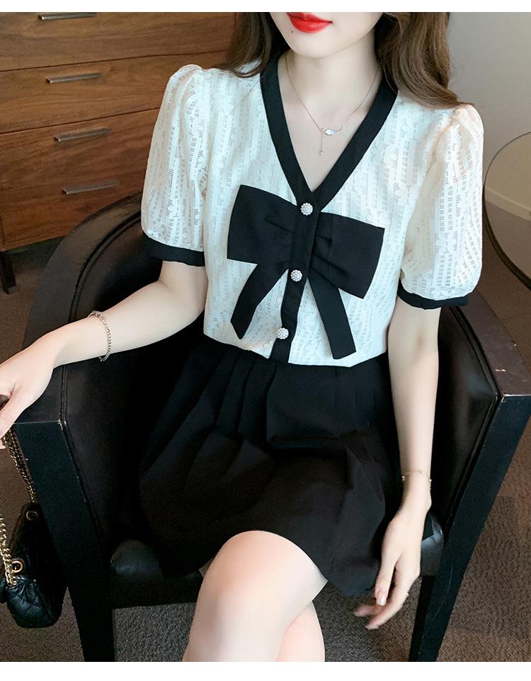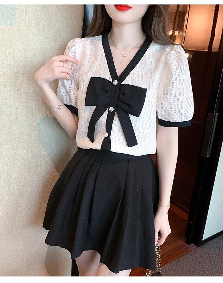 2025 Verão Novo Estilo Coreano All-match Costura Renda Camisa de manga curta Feminina Elegante Doce Fino Top com Laço