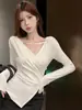 Outono 2024 Estilo coreano Cruz V-neck Slim-fit Slimming Manga comprida T-shirt Moda Irregular Nicho Spice Girls Sexy Top