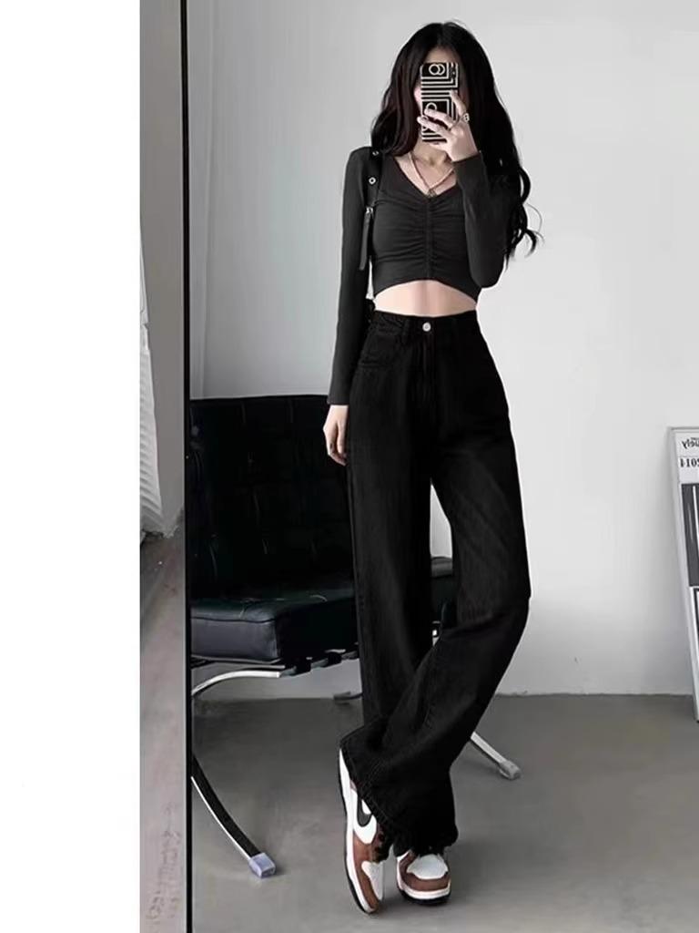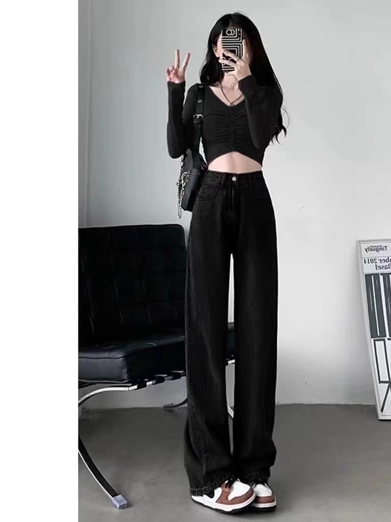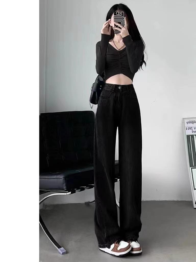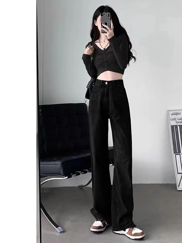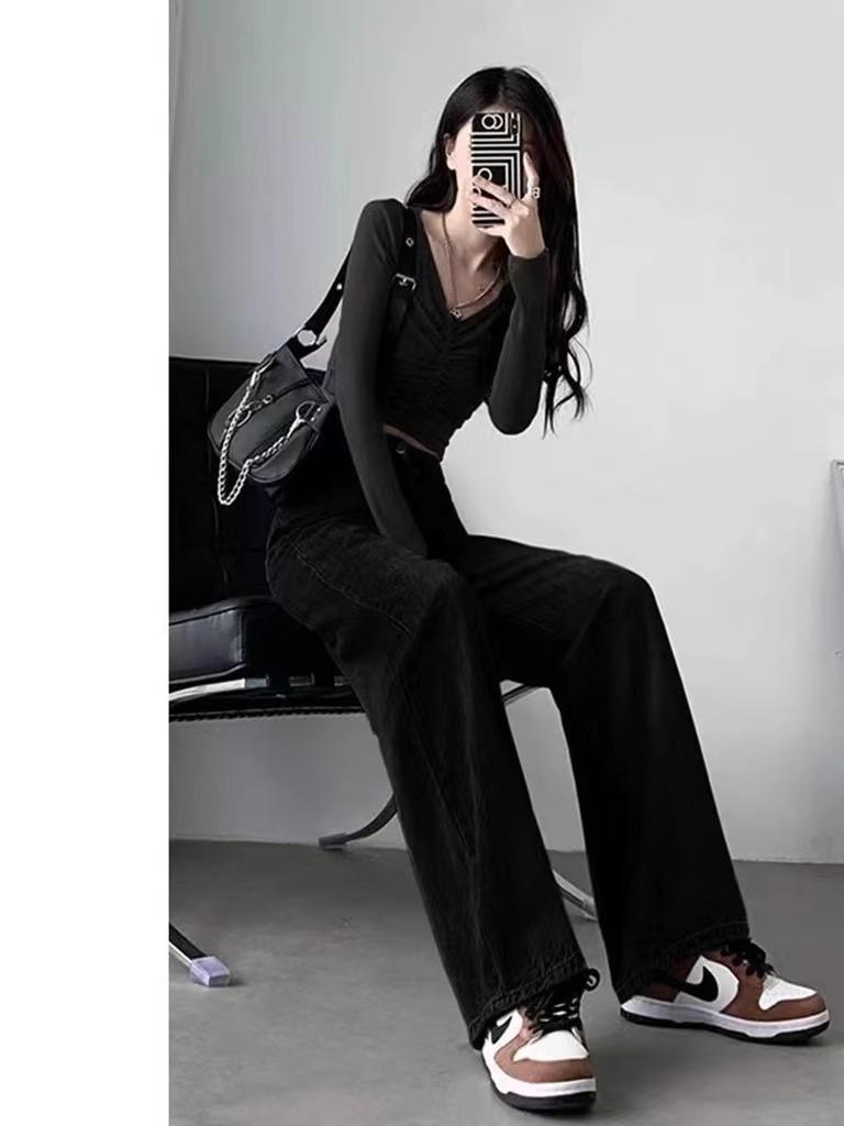 Calça Jeans Preta Cintura Alta Perna Reta Feminina Outono Nova Solta All-match Look Slim Calça Alta Perna Larga Arrastando