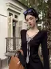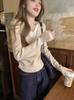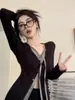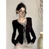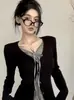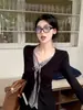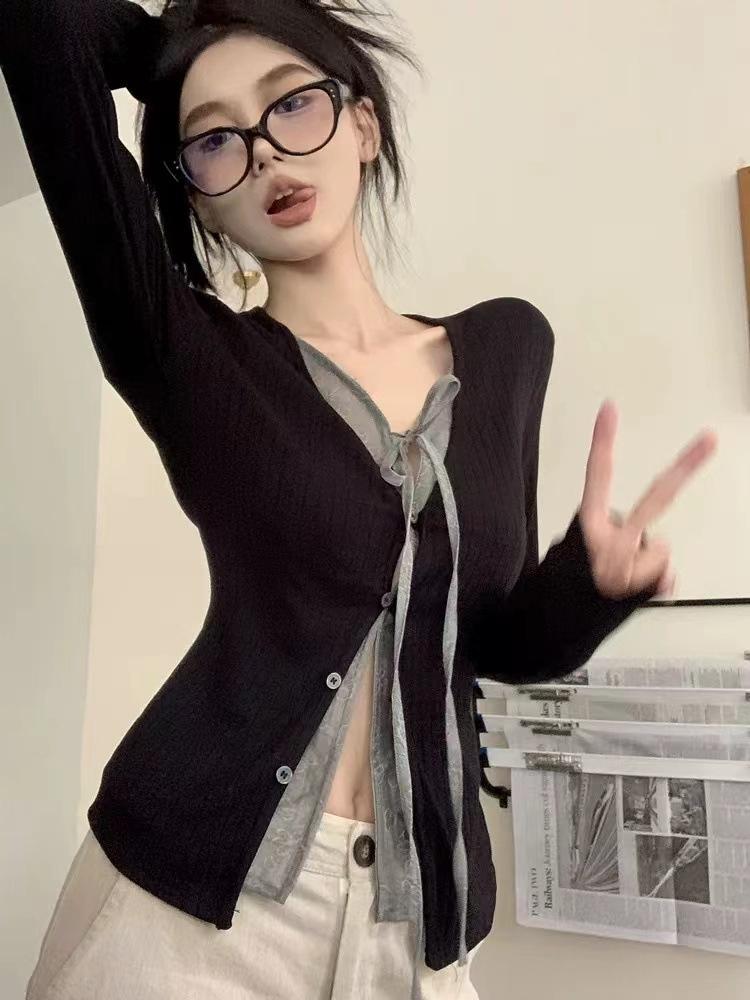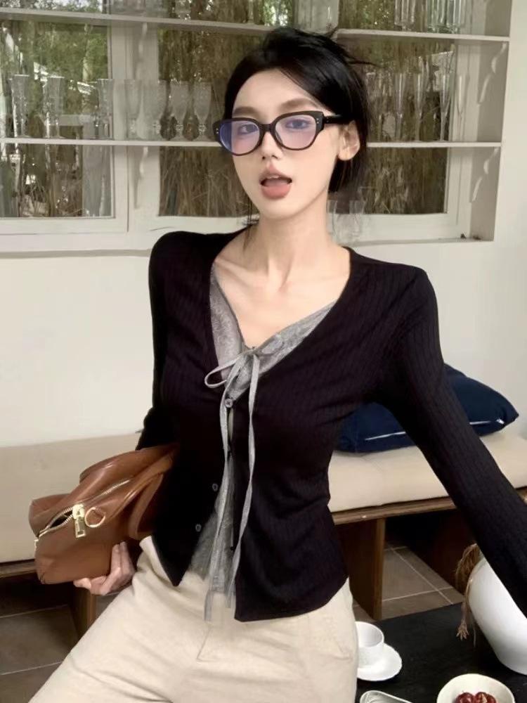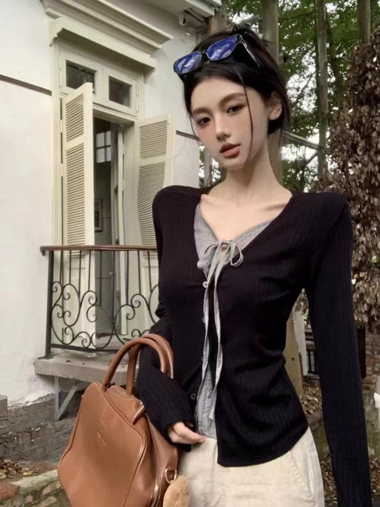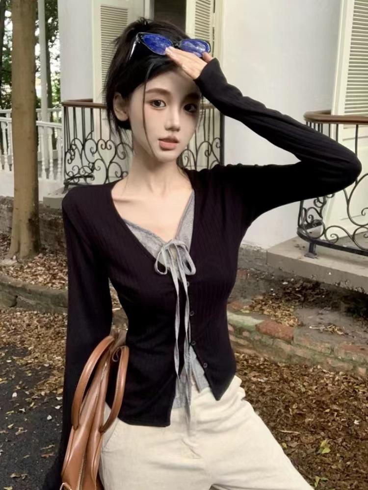 Moda Nicho Costura Falso Duas Peças Camiseta Manga Longa Outono Novo Doce Spice Girl Ajuste Slim Emagrecimento Senso de Design Decote V Top