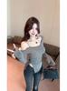 Início do Outono Chic Puro Ombro Clavícula Fino Irregular Malha T-shirt Hot Girl Sexy Design Sense Manga Longa Top