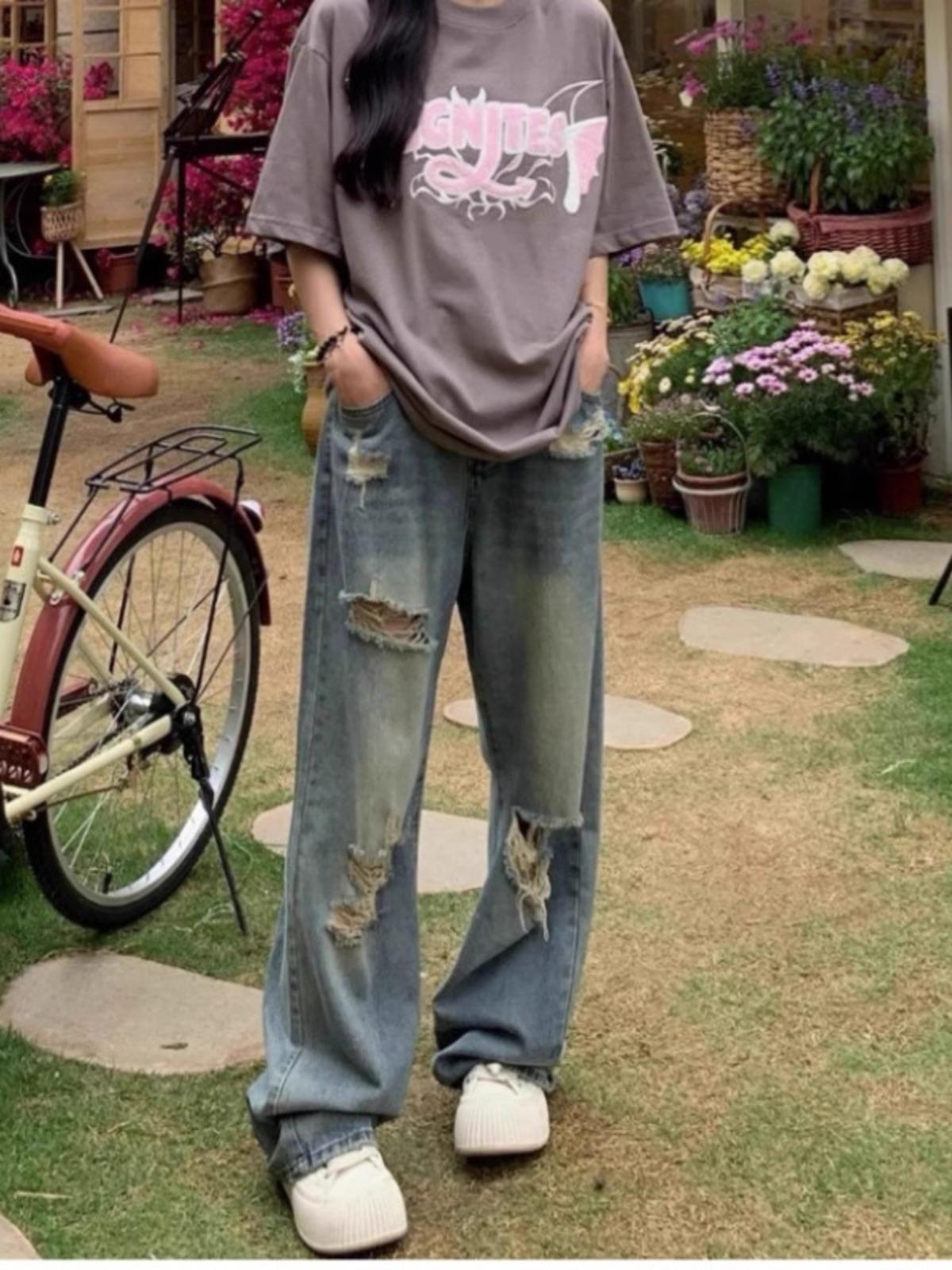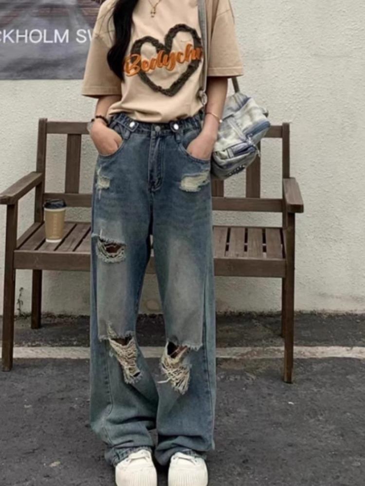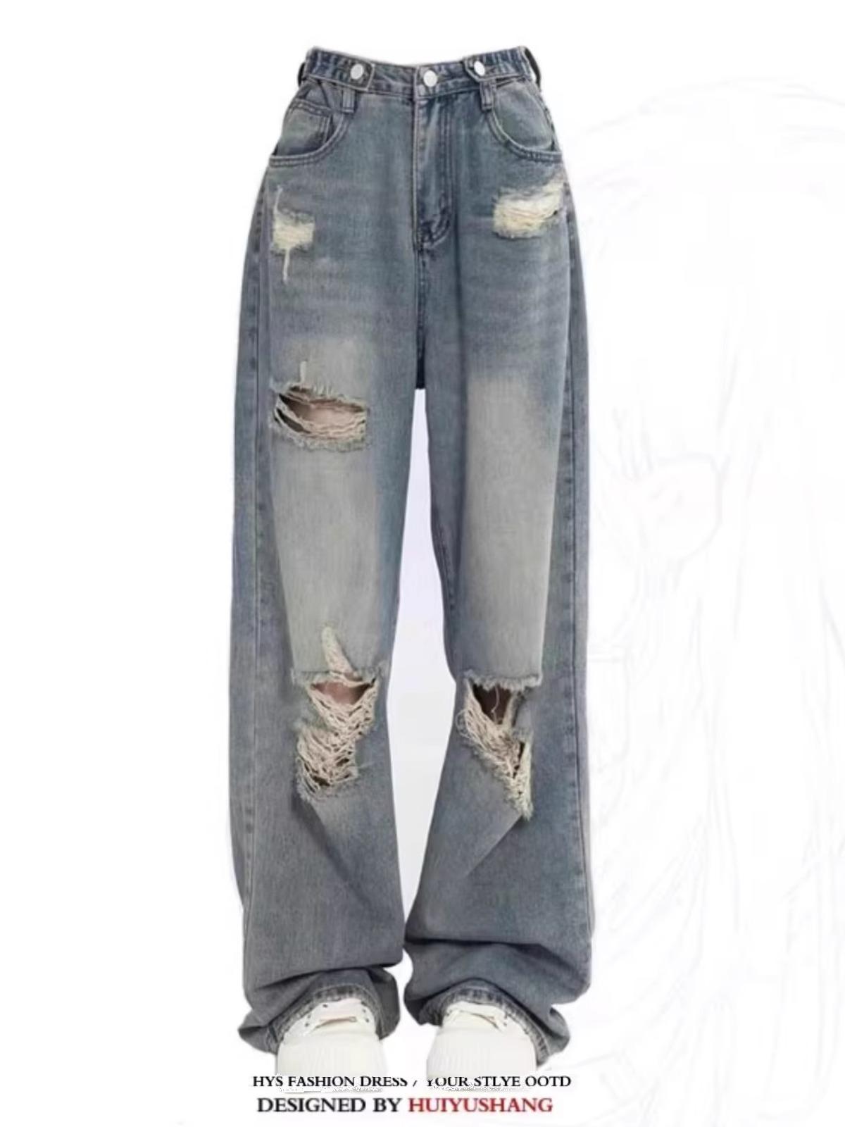 Jeans rasgado vintage perna larga feminino outono e inverno 2025 novo solto emagrecimento calças retas tubo