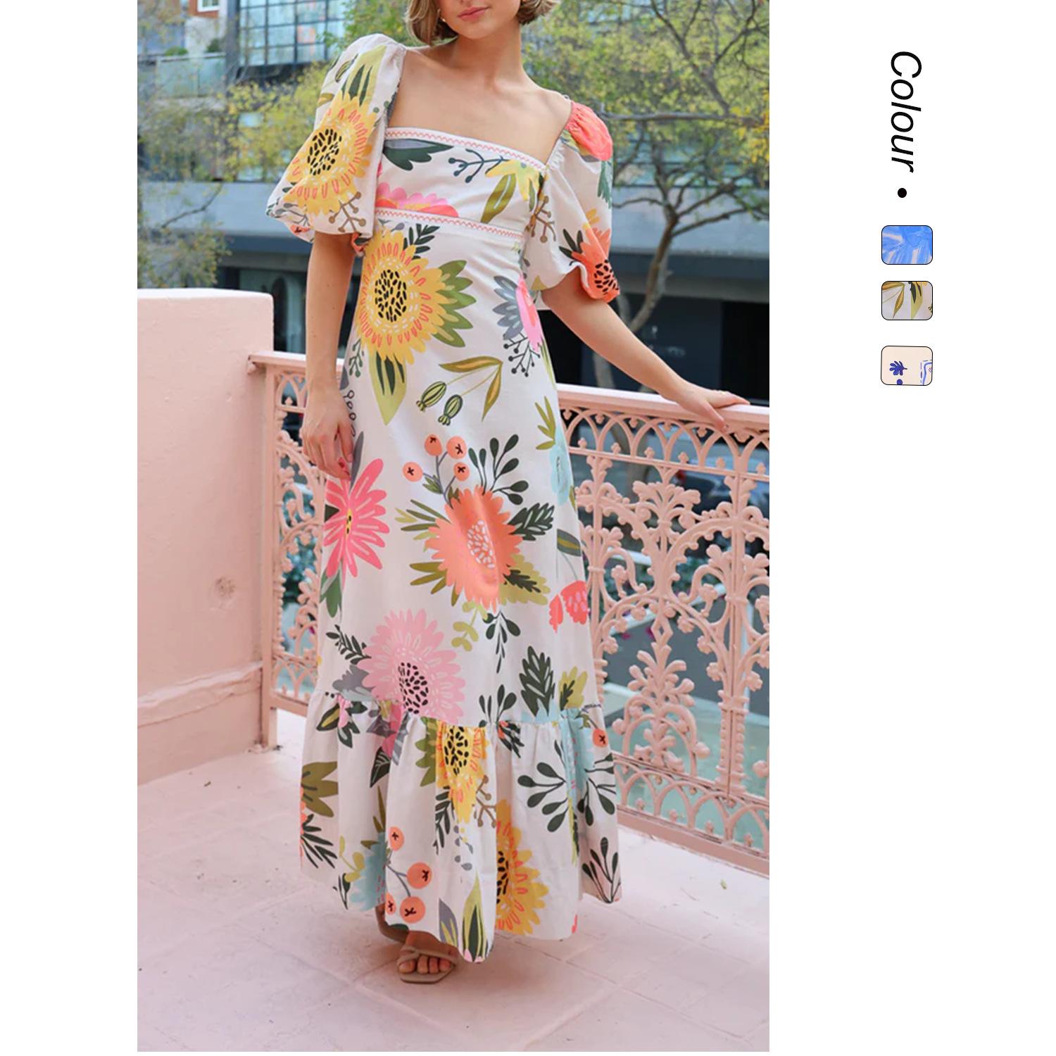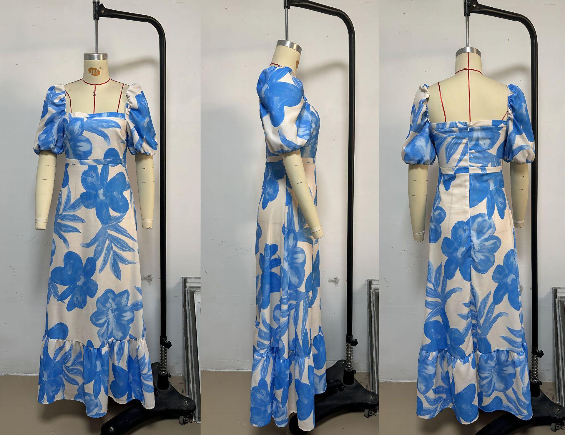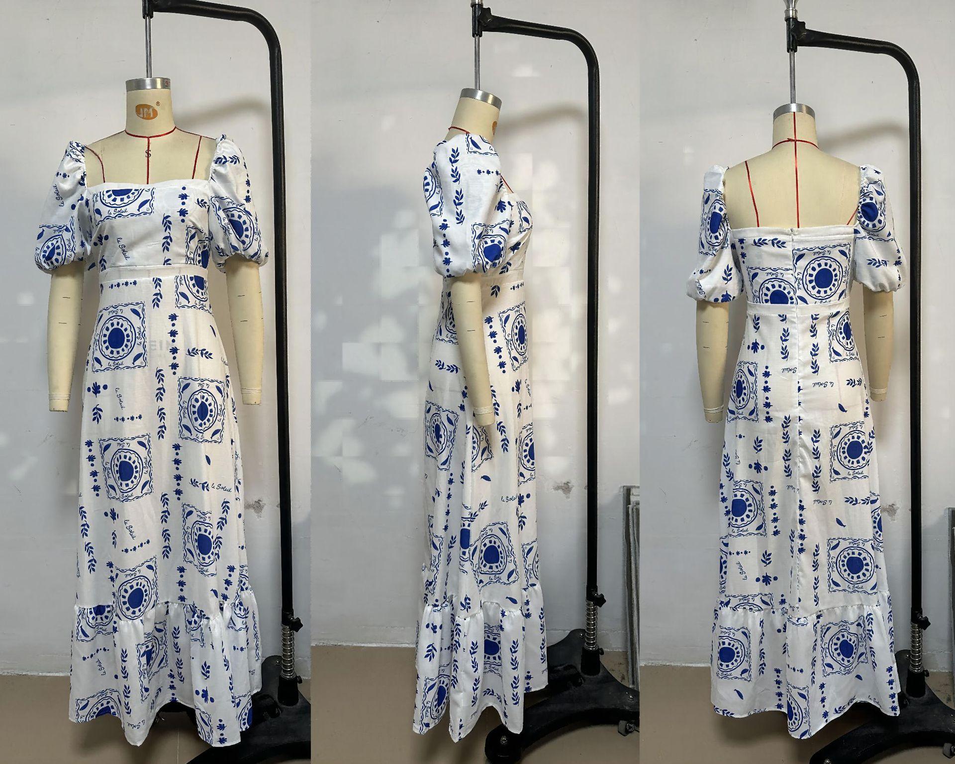 Ponto 25 Verão Novo Europeu e Americano Casual Gola de Uma Linha Estampado Manga Lanterna Vestido da Moda-68576