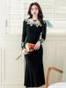 Vestido elegante de cola de pez negro con cintura pequeña y cuello de muñeca de encaje francés en contraste de color para otoño e invierno 2024 para mujer