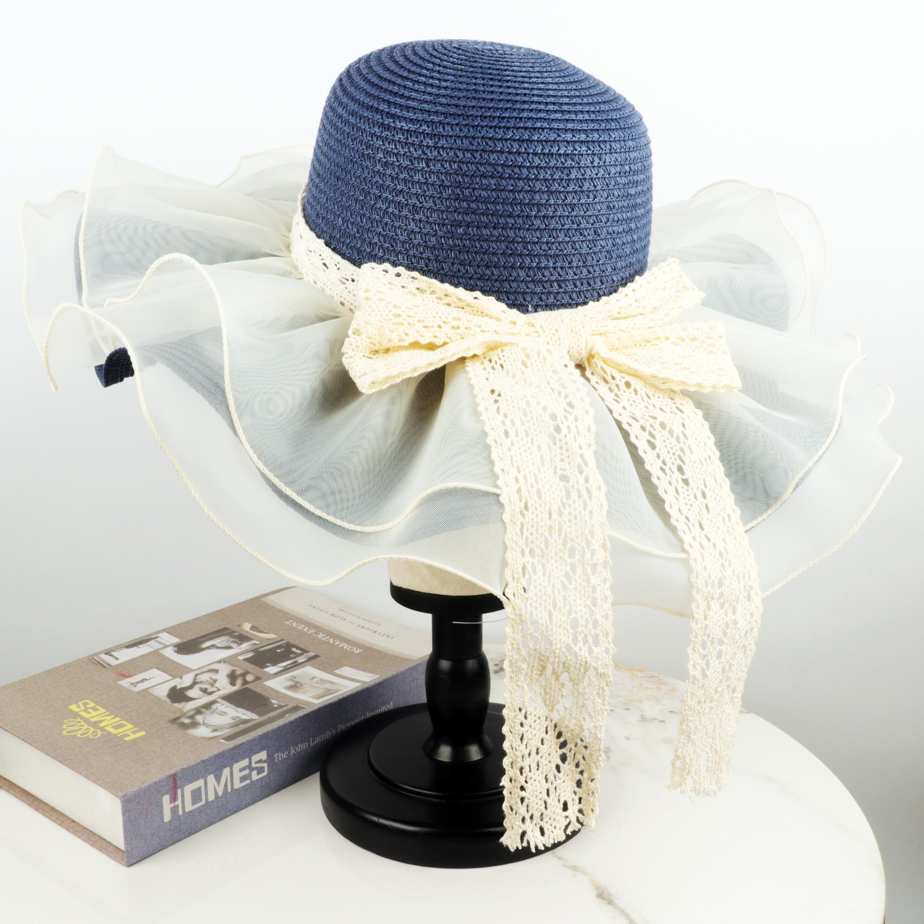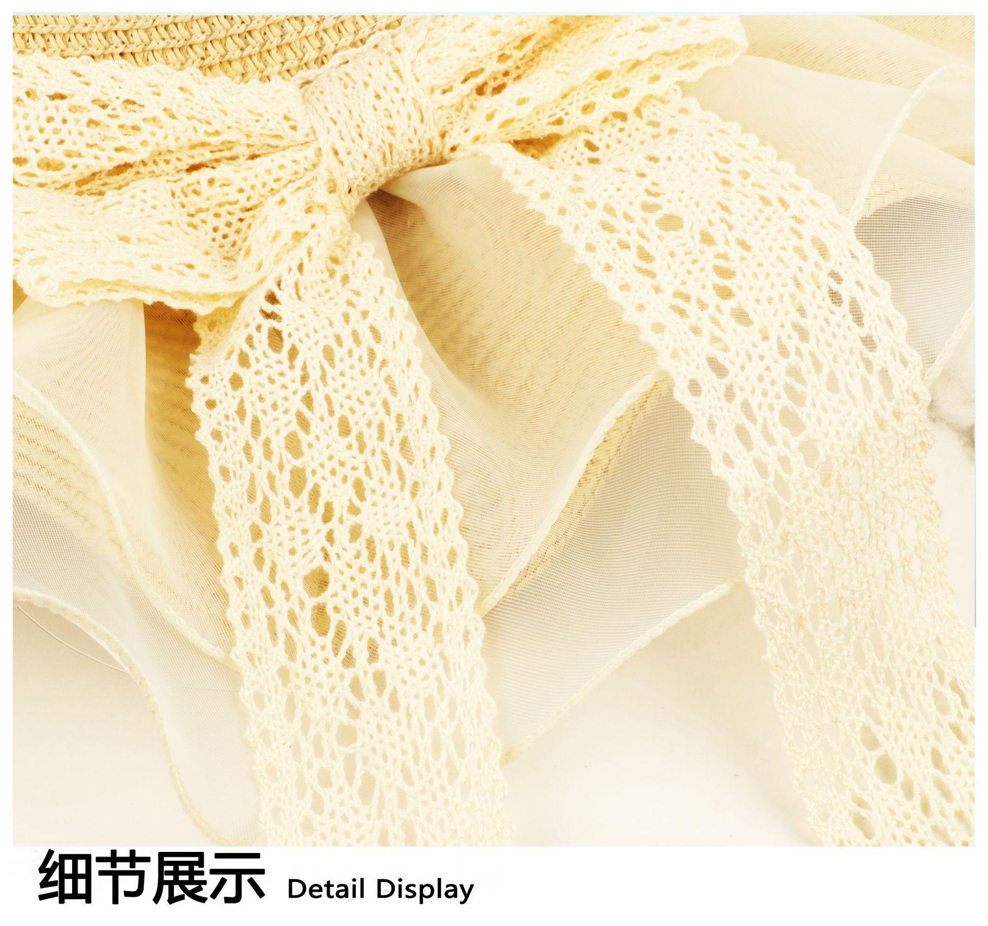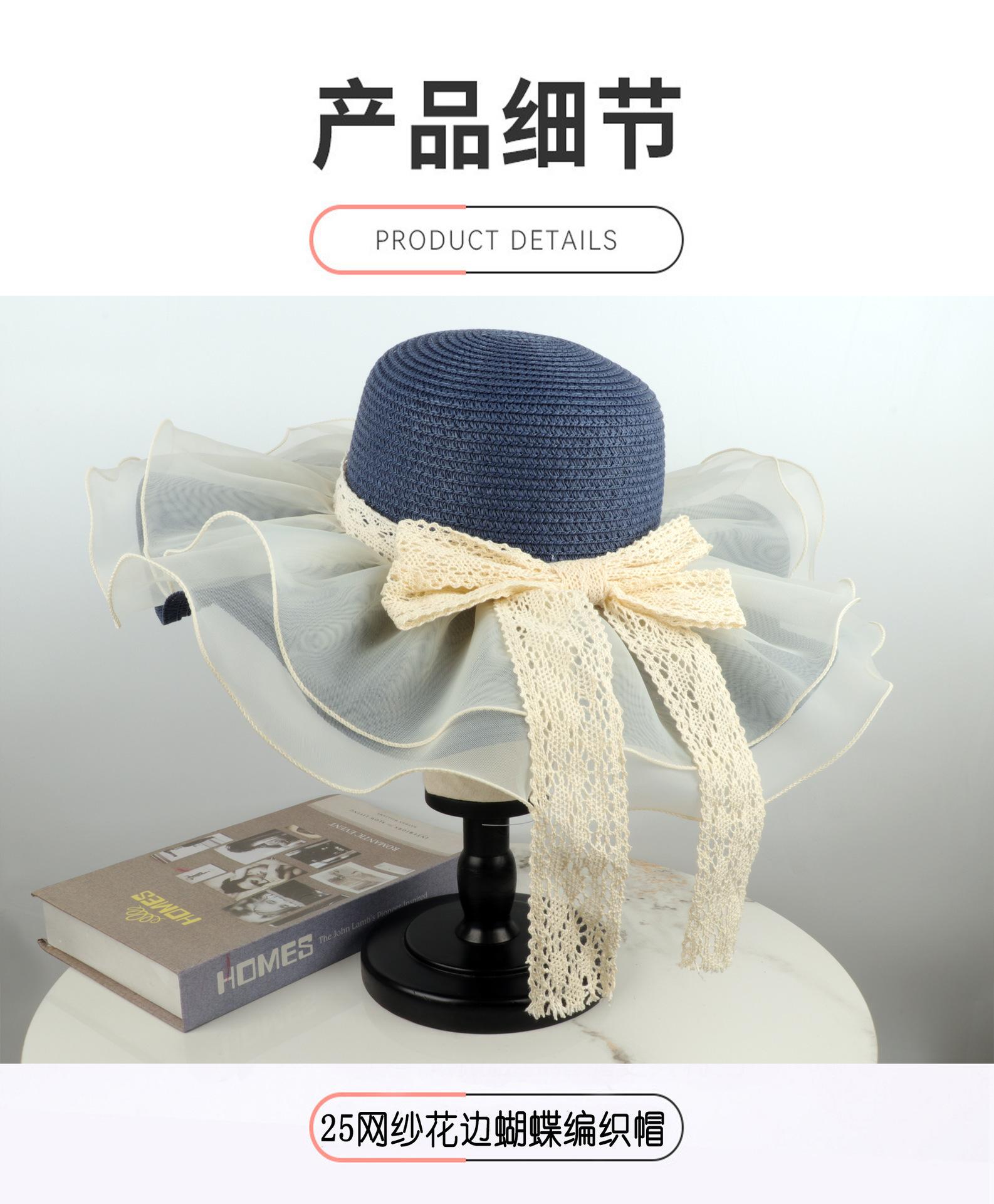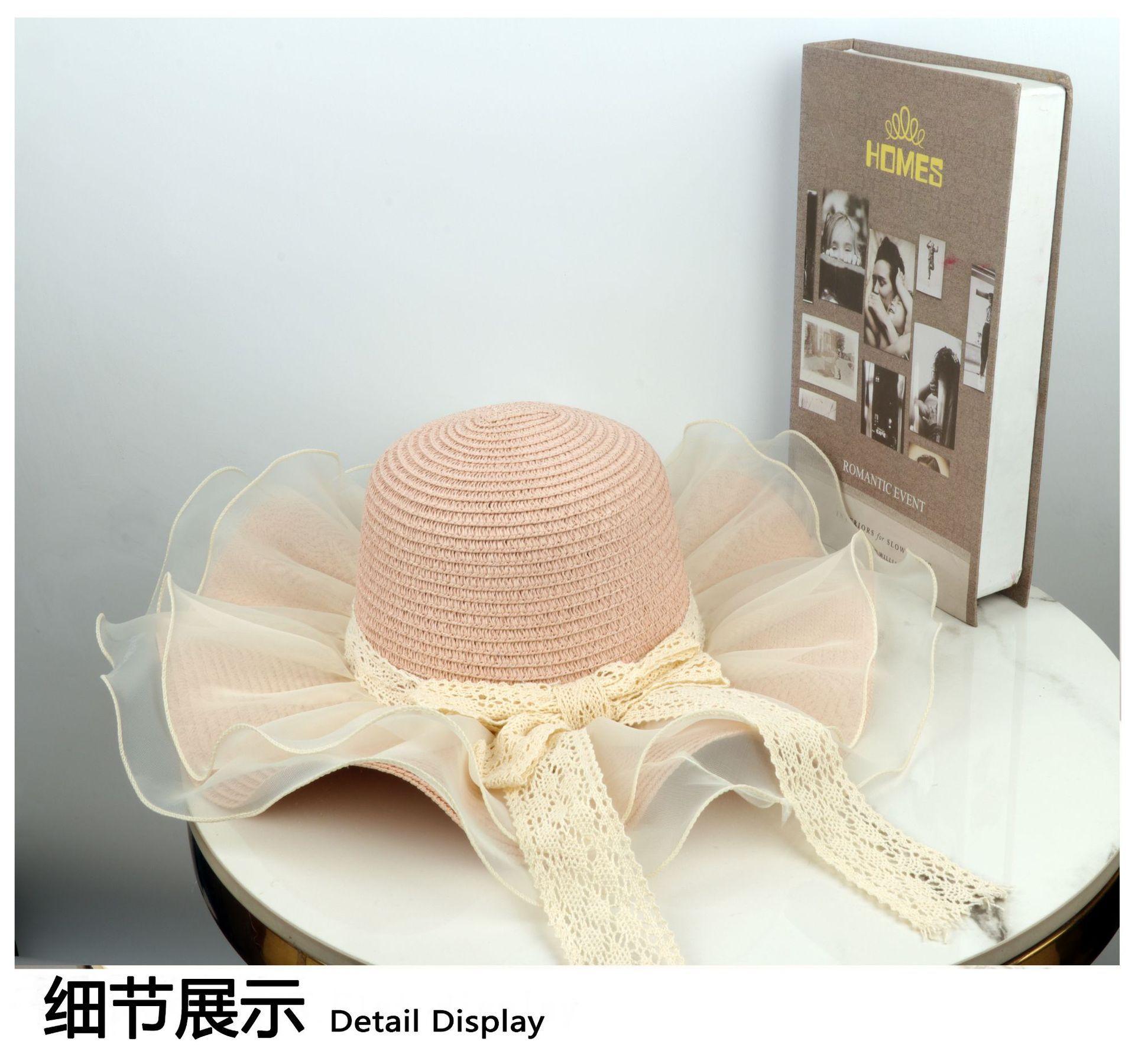 Chapéu de palha com aba francesa de malha de renda e laço de fita para mulheres, chapéu de sombra trançado para férias na praia, chapéu de malha de renda