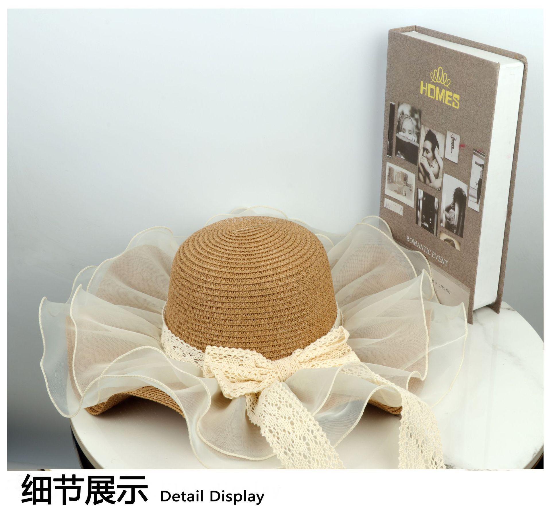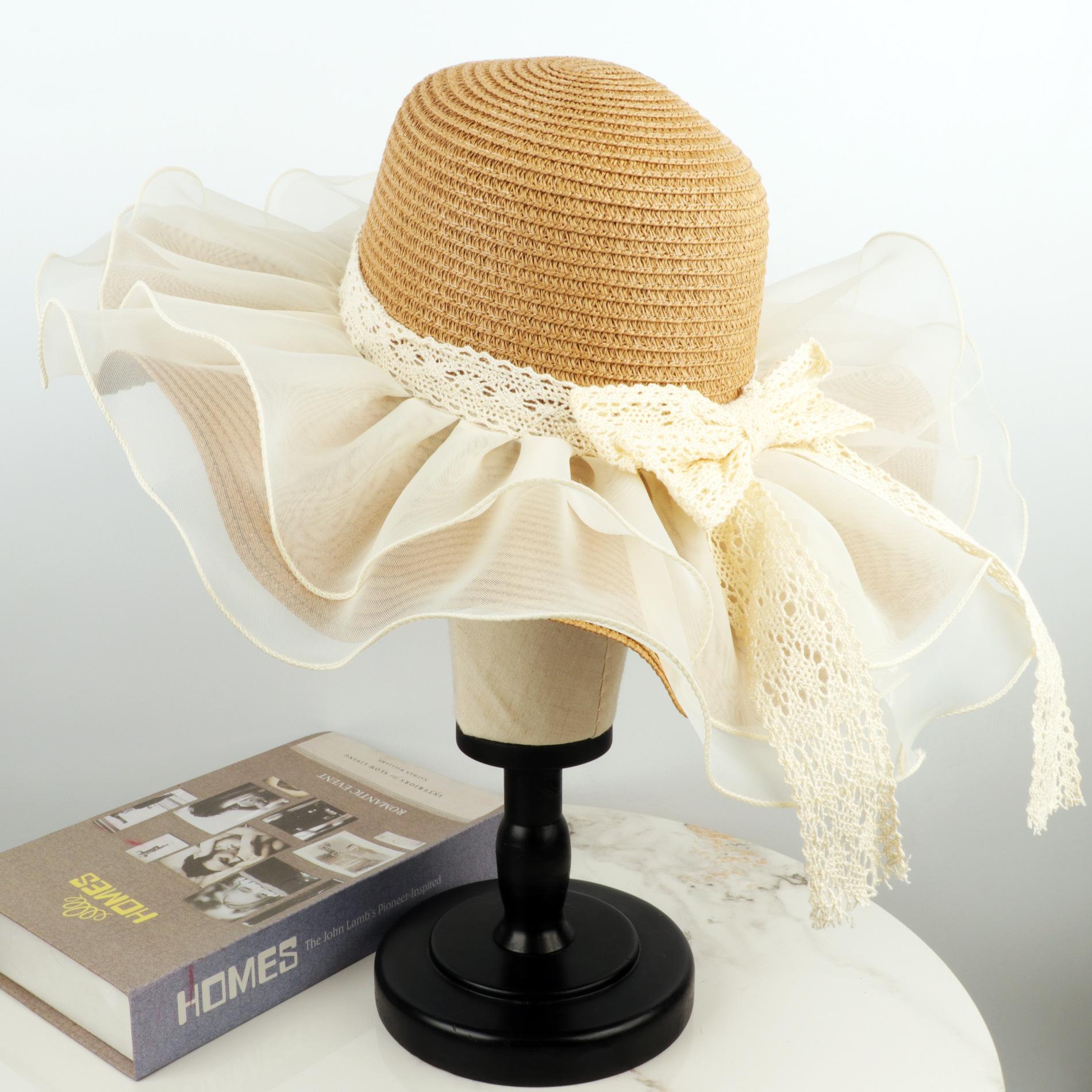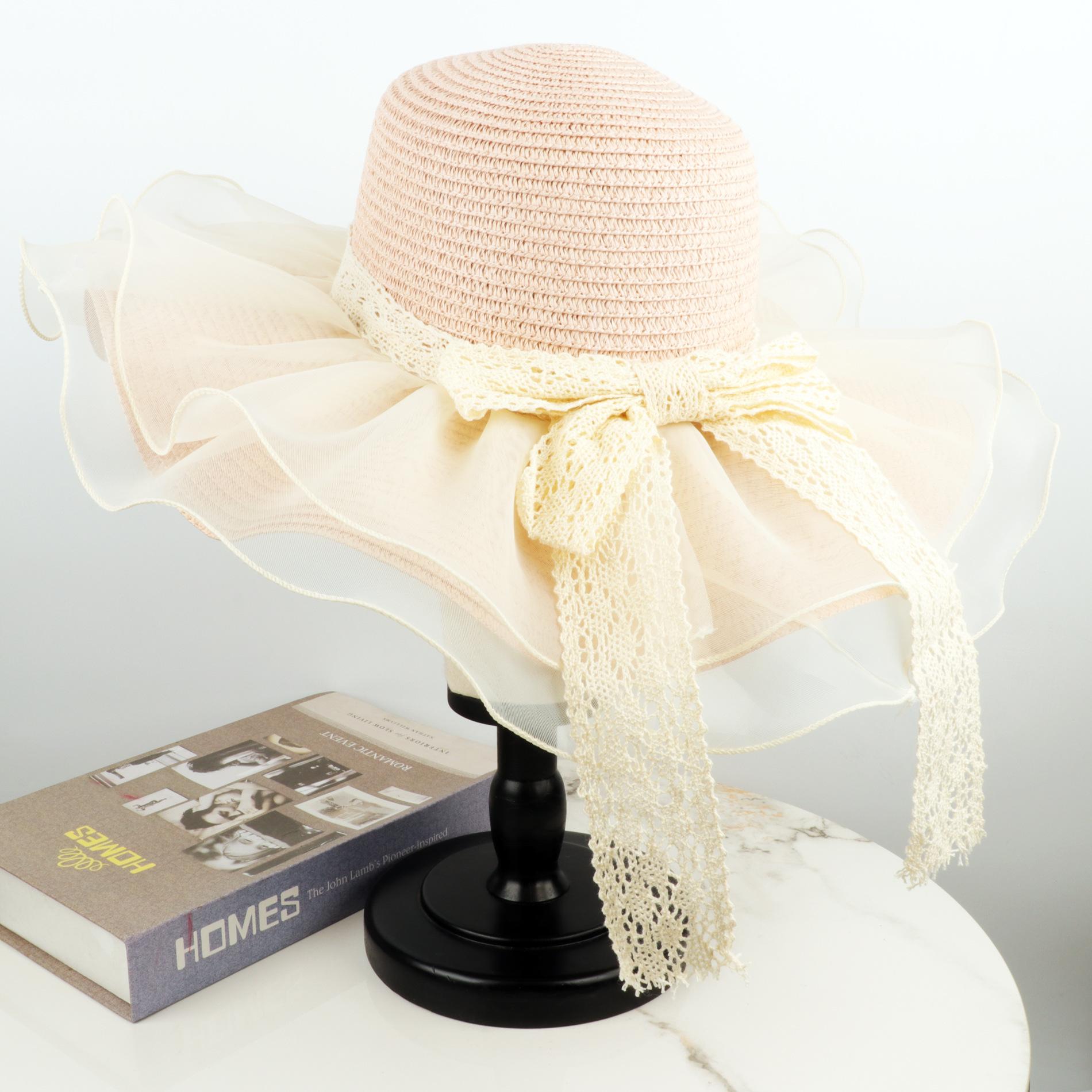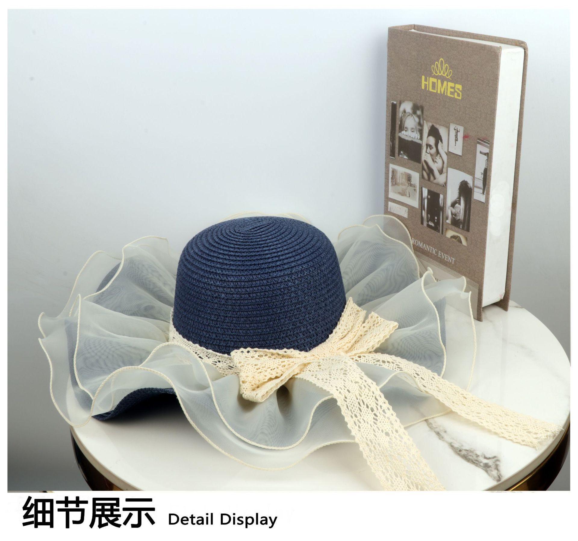 Chapéu de palha com aba francesa de malha de renda e laço de fita para mulheres, chapéu de sombra trançado para férias na praia, chapéu de malha de renda