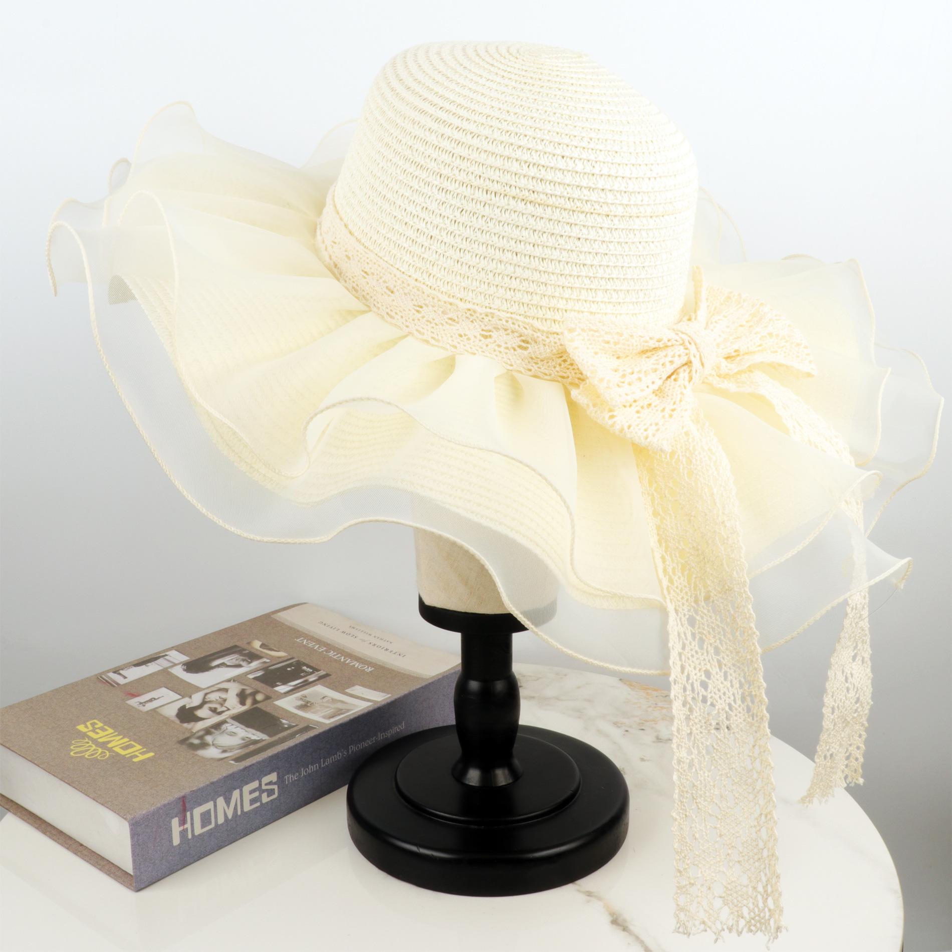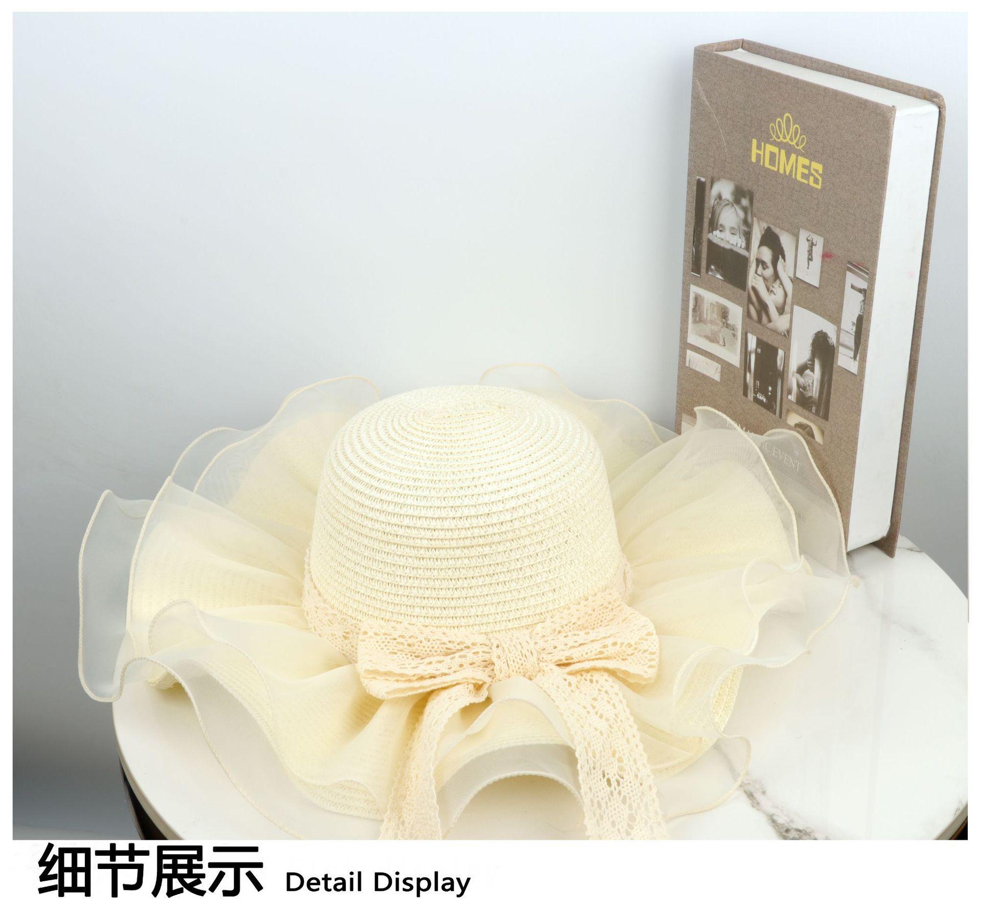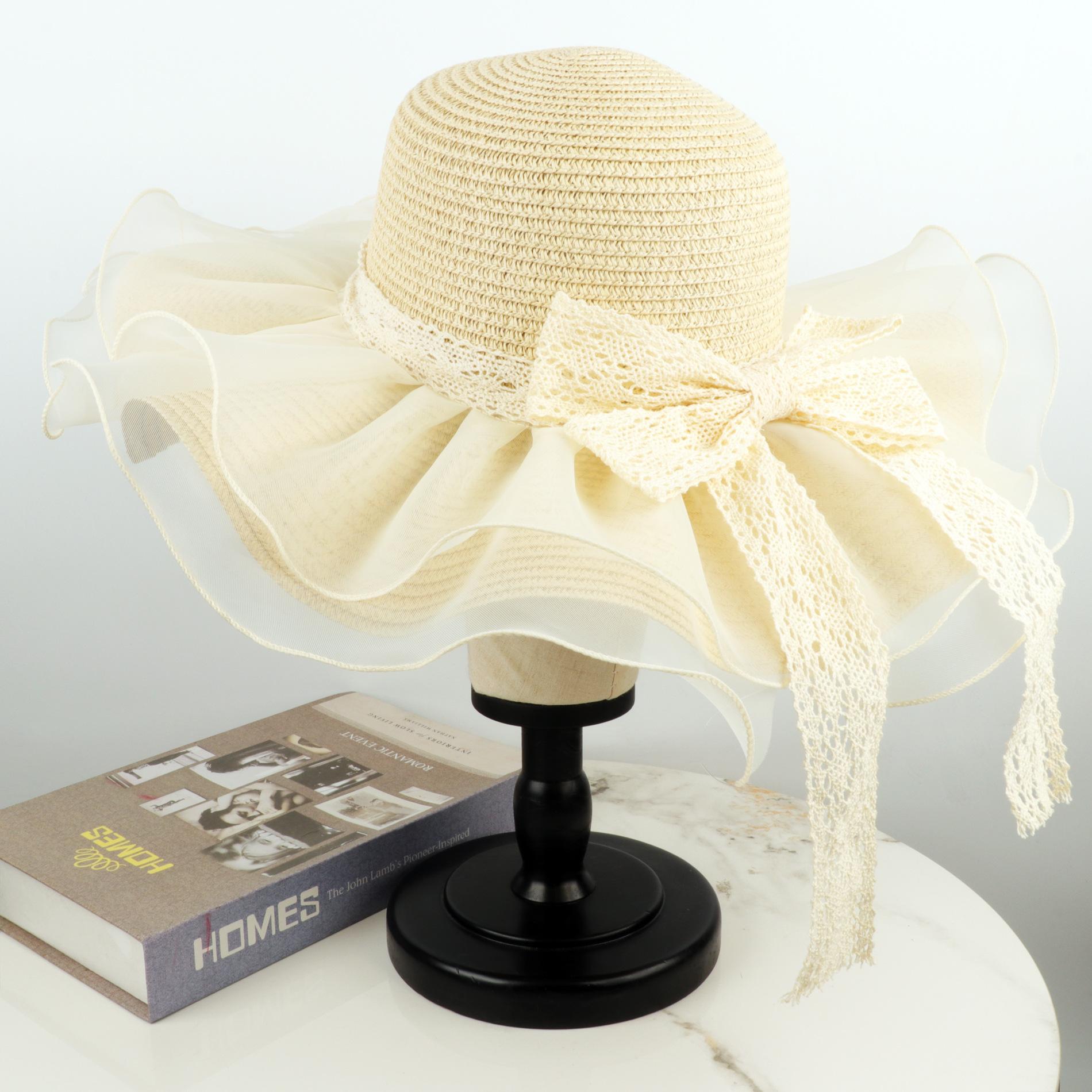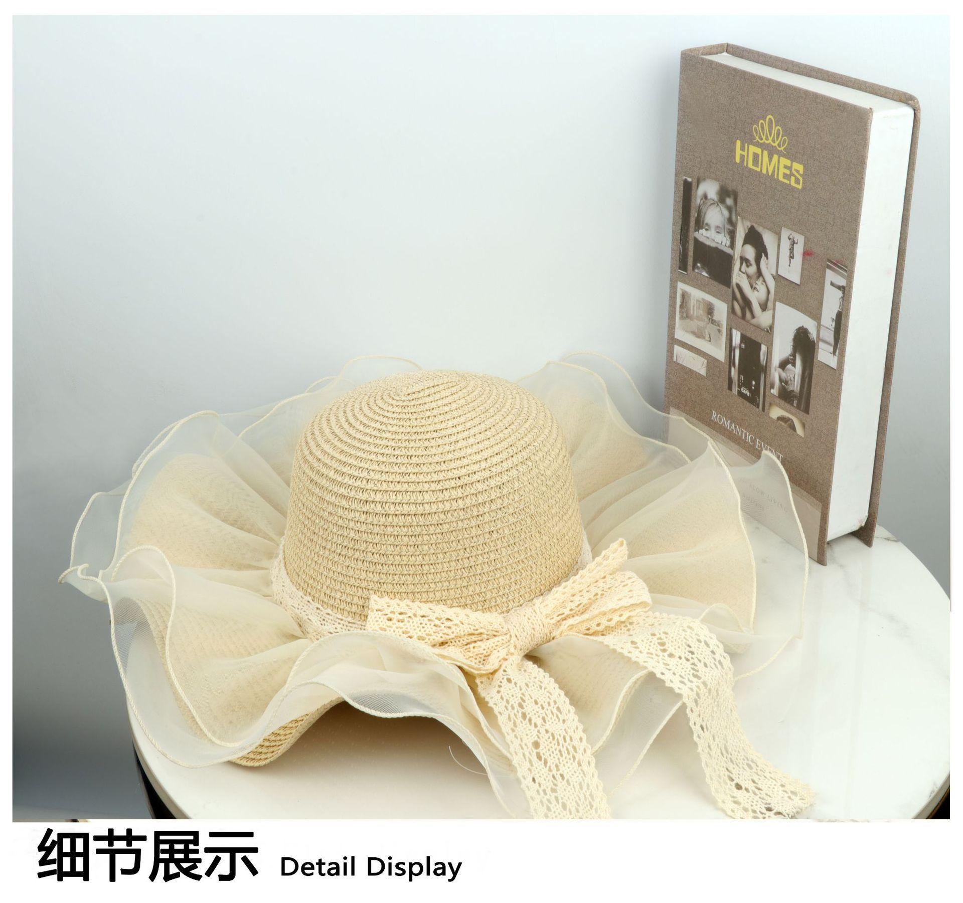 Chapéu de palha com aba francesa de malha de renda e laço de fita para mulheres, chapéu de sombra trançado para férias na praia, chapéu de malha de renda