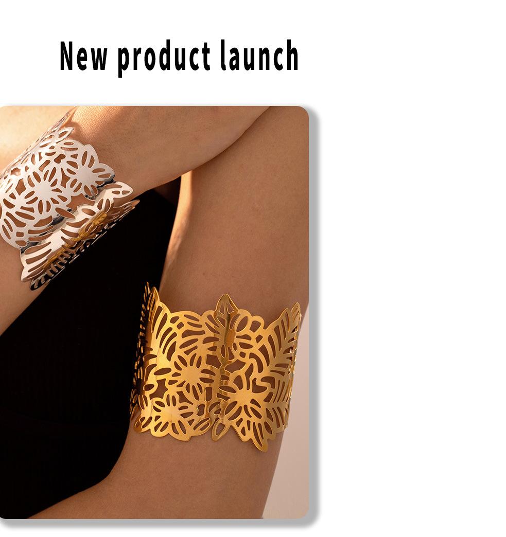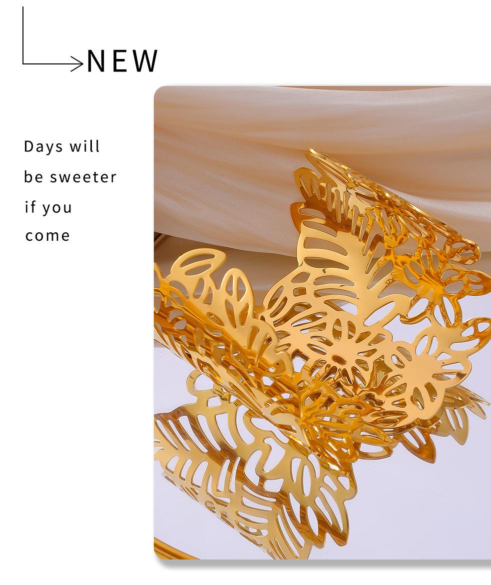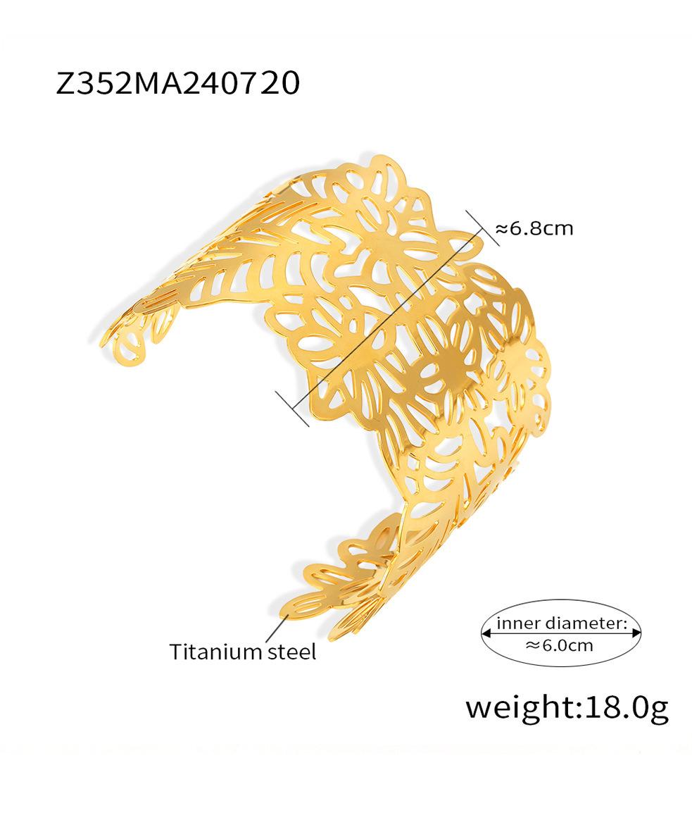 Europa e Estados Unidos pulseira aberta transfronteiriça com costura de folha de flor, aço titânio banhado a ouro 18k, personalidade exagerada, geométrica oca, ornamentos de mão