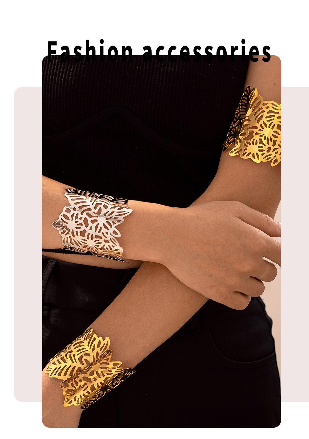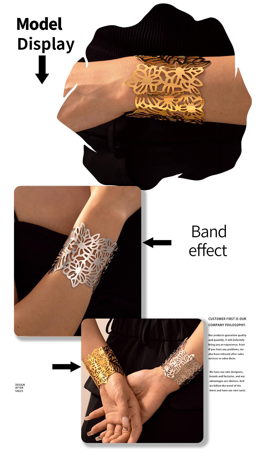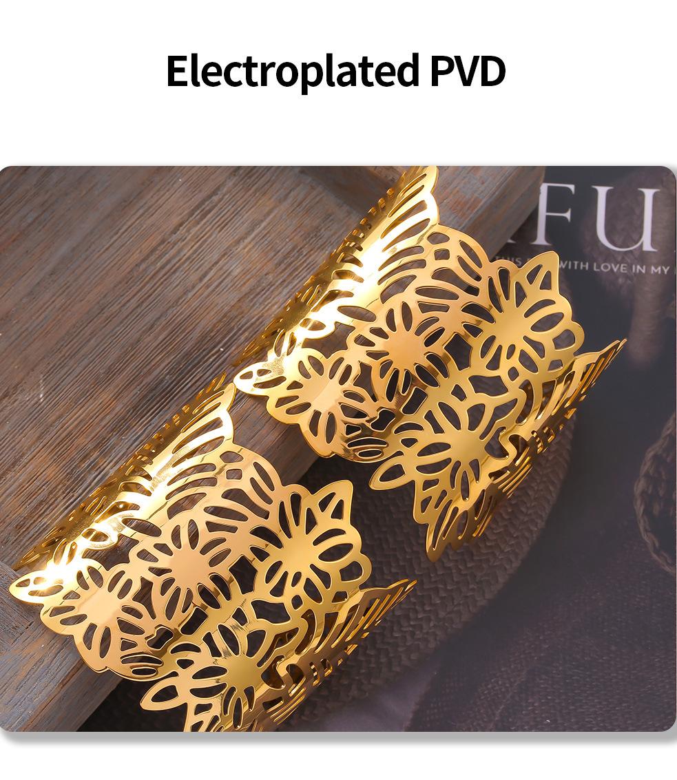 Europa e Estados Unidos pulseira aberta transfronteiriça com costura de folha de flor, aço titânio banhado a ouro 18k, personalidade exagerada, geométrica oca, ornamentos de mão