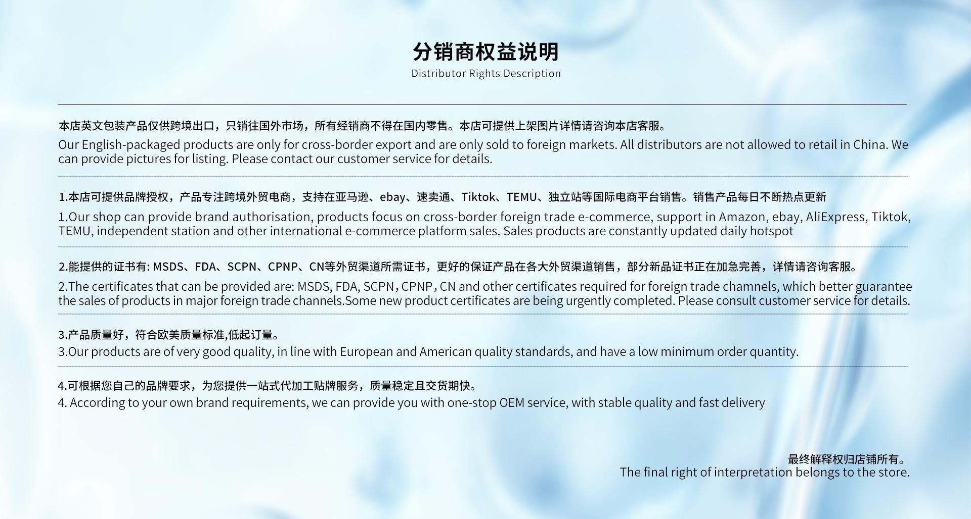 Os produtos Enqlish da empresa destinam-se exclusivamente ao comércio eletrónico transfronteiriço e são vendidos apenas no estrangeiro. Os distribuidores não estão autorizados a vender na China e, se a violarem, serão desqualificados para fornecer uma vez descobertos e arcarão com os riscos e consequências das leis e regulamentos.