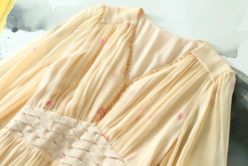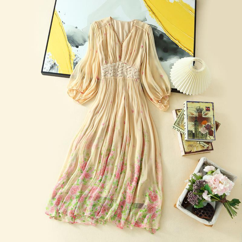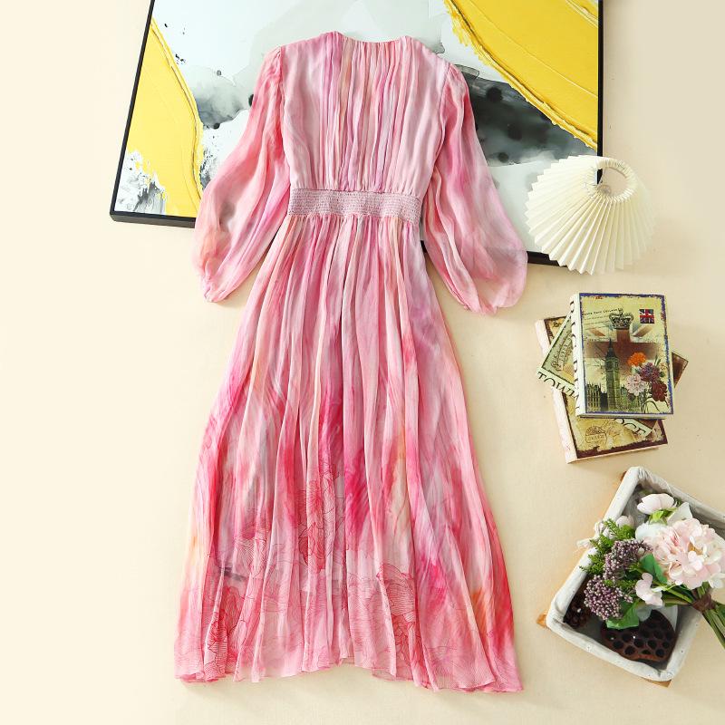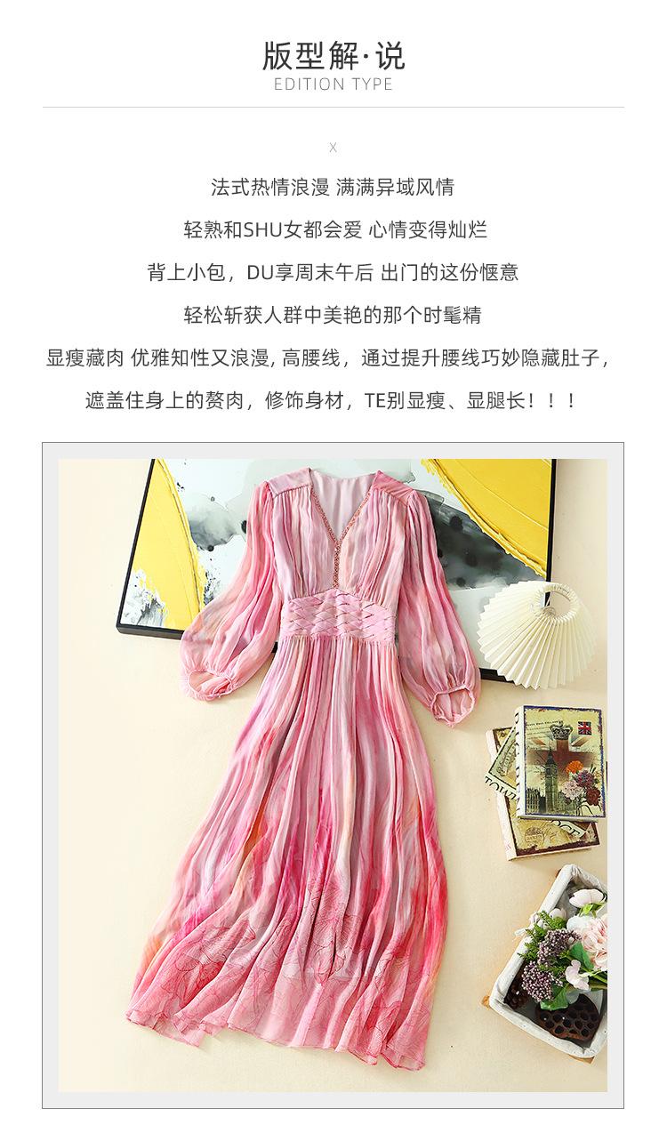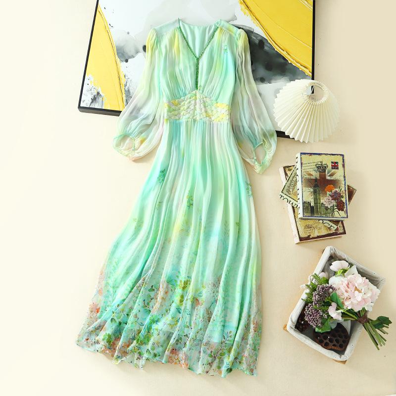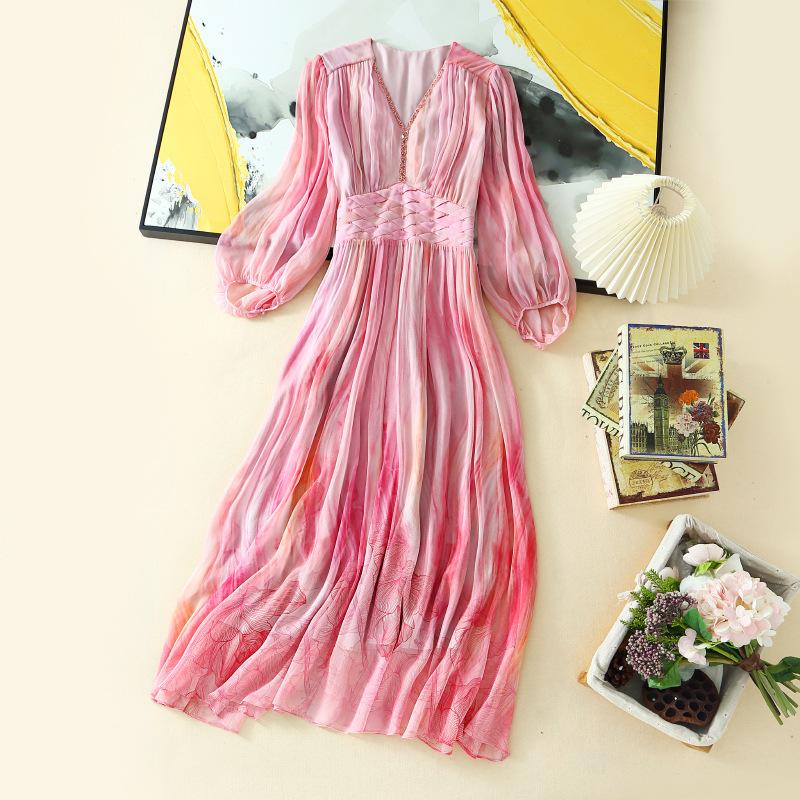 Seda de Amoreira Vestido de Seda Elegante Feminino Verão 2024 Novo Saia Evasê Slim de Cintura Alta Decote V Saia de Fada com Miçangas