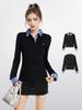 Camisa polo xadrez preta estilo americano, suéter falso de duas peças, outono e inverno, camisa curta com base interna e ajuste fino
