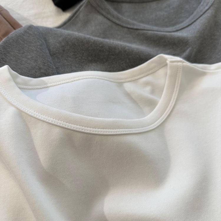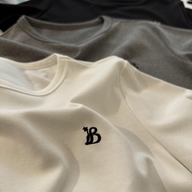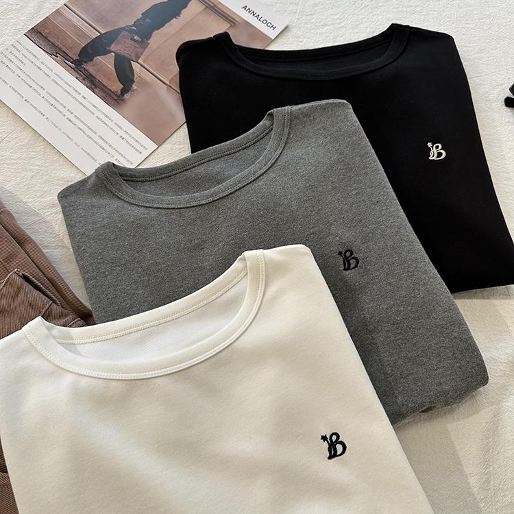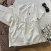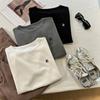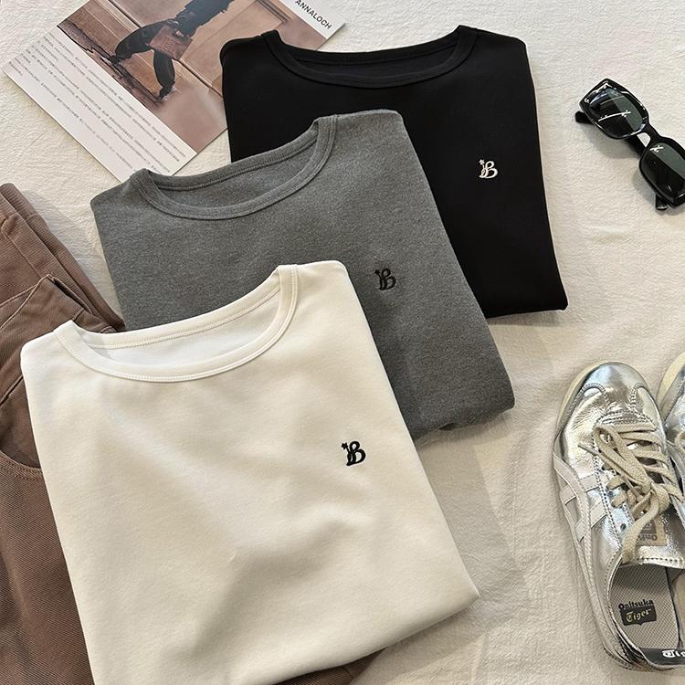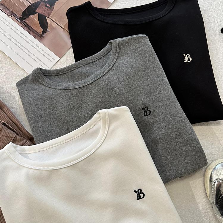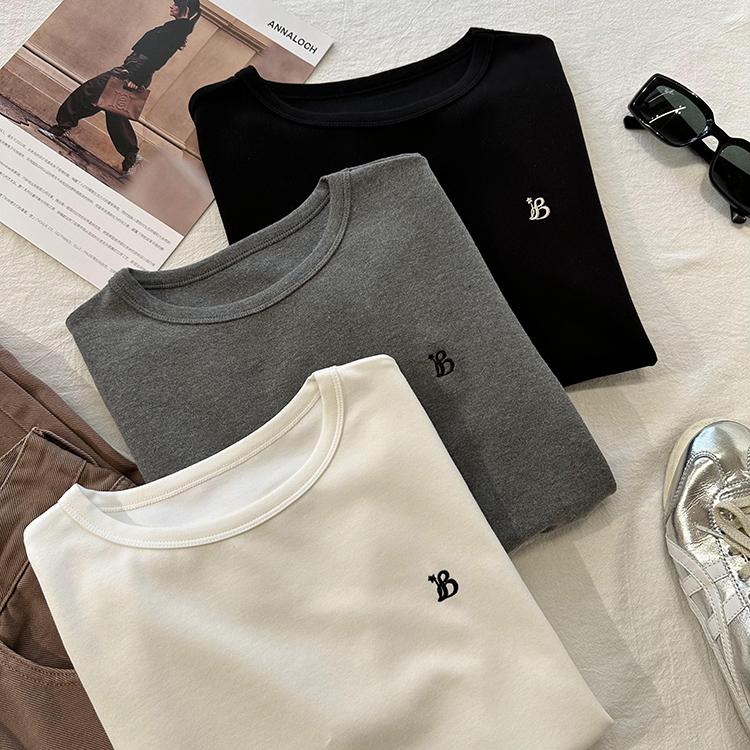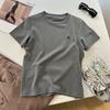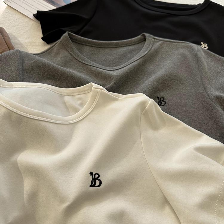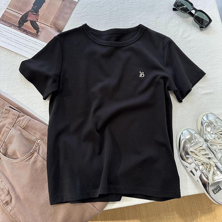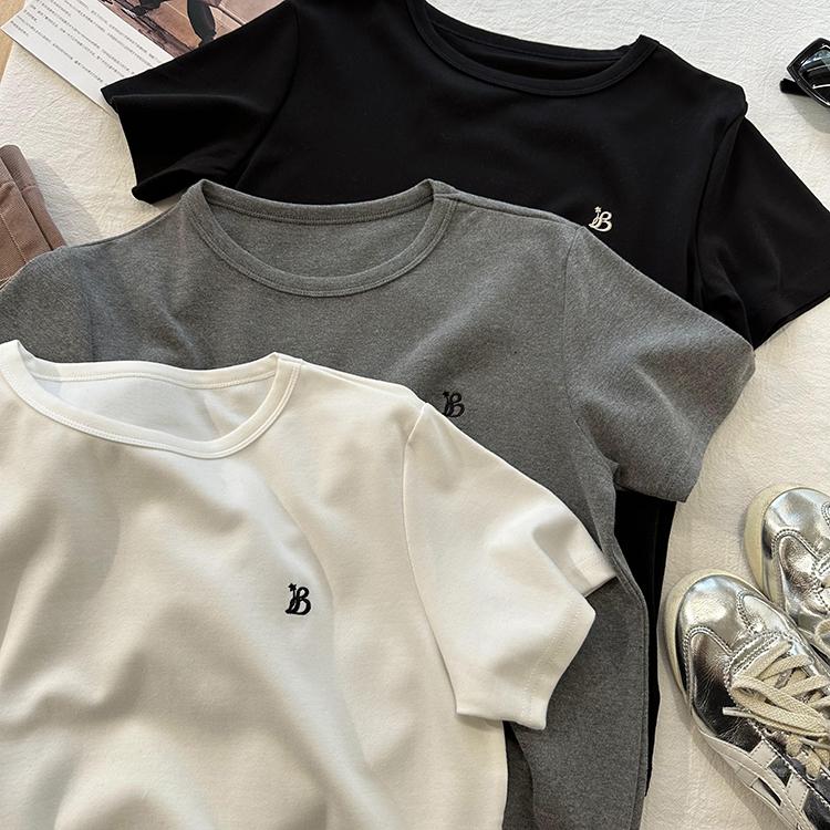Camiseta feminina cinza gola redonda manga curta primavera e verão solta all-match emagrecimento bordado top para pequeno ombro base branco