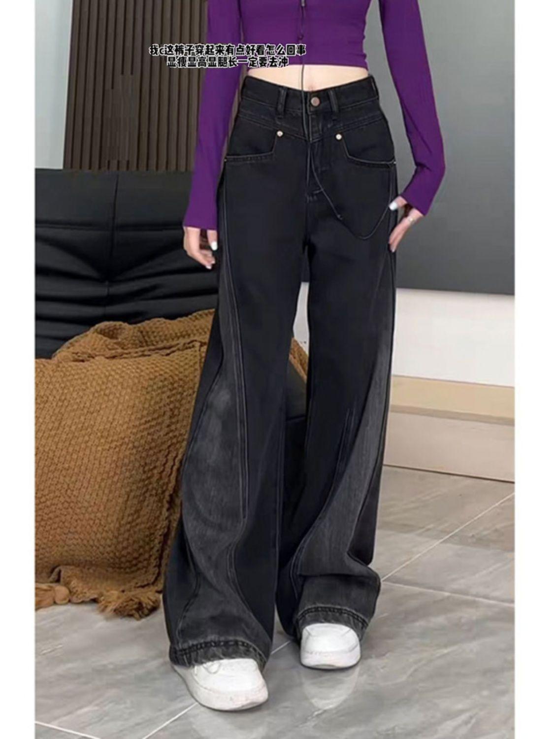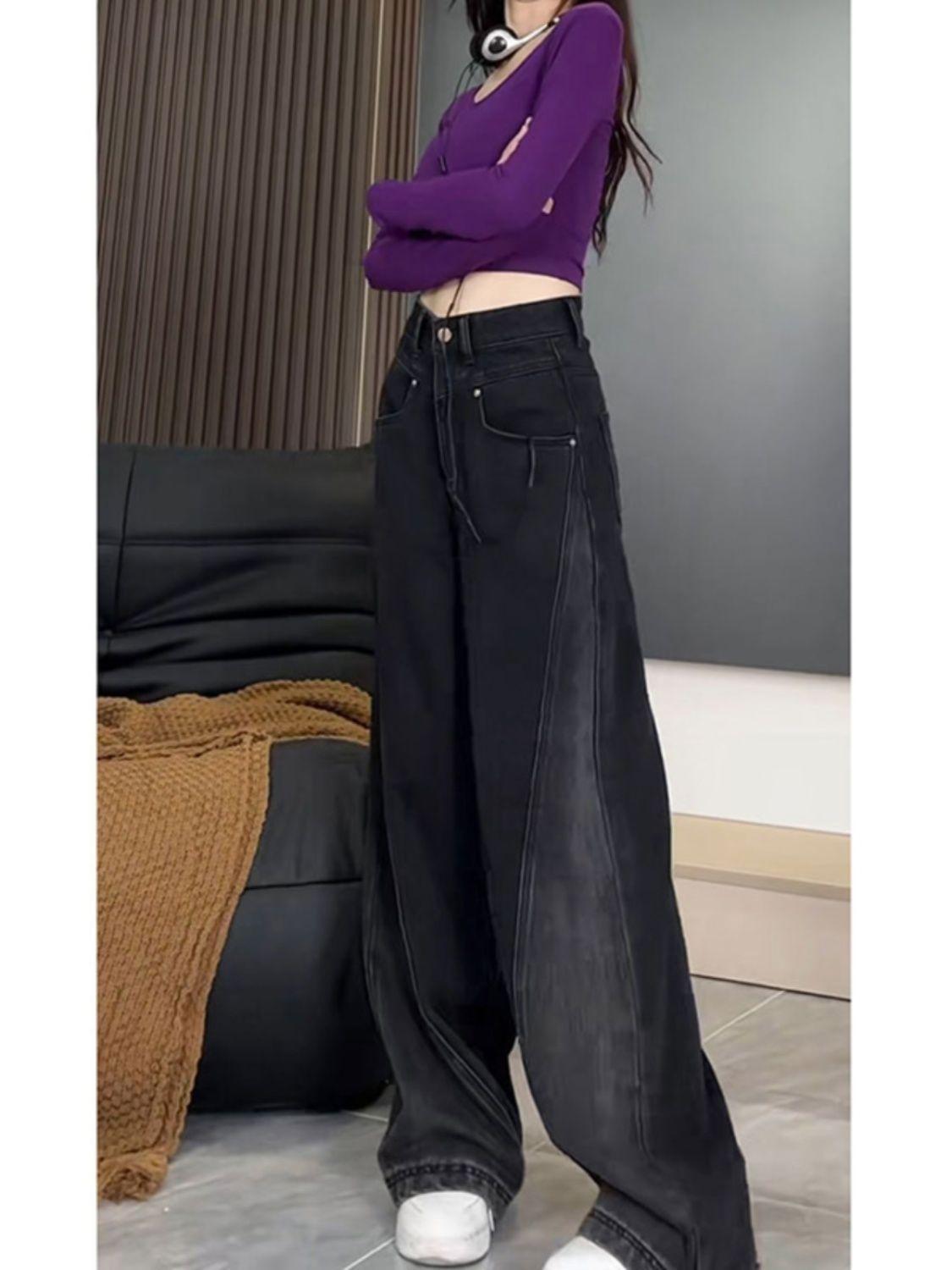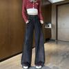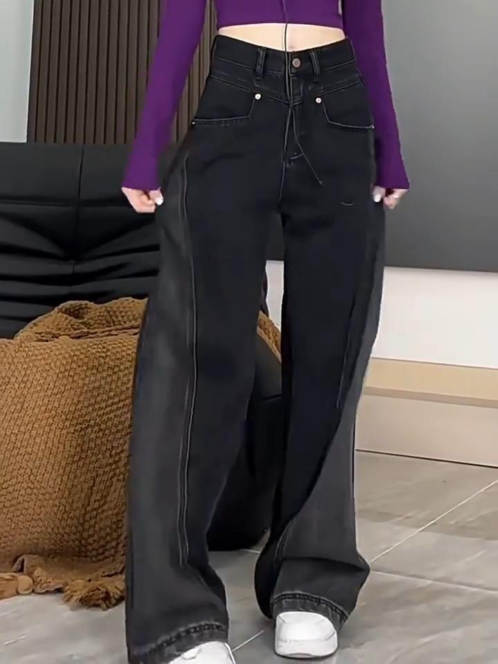 Calça jeans feminina cintura alta perna larga costura vintage lavada antiga 2025 nova calça reta solta e emagrecedora