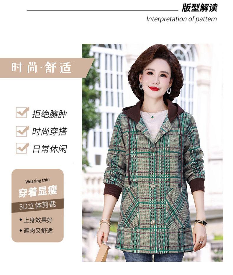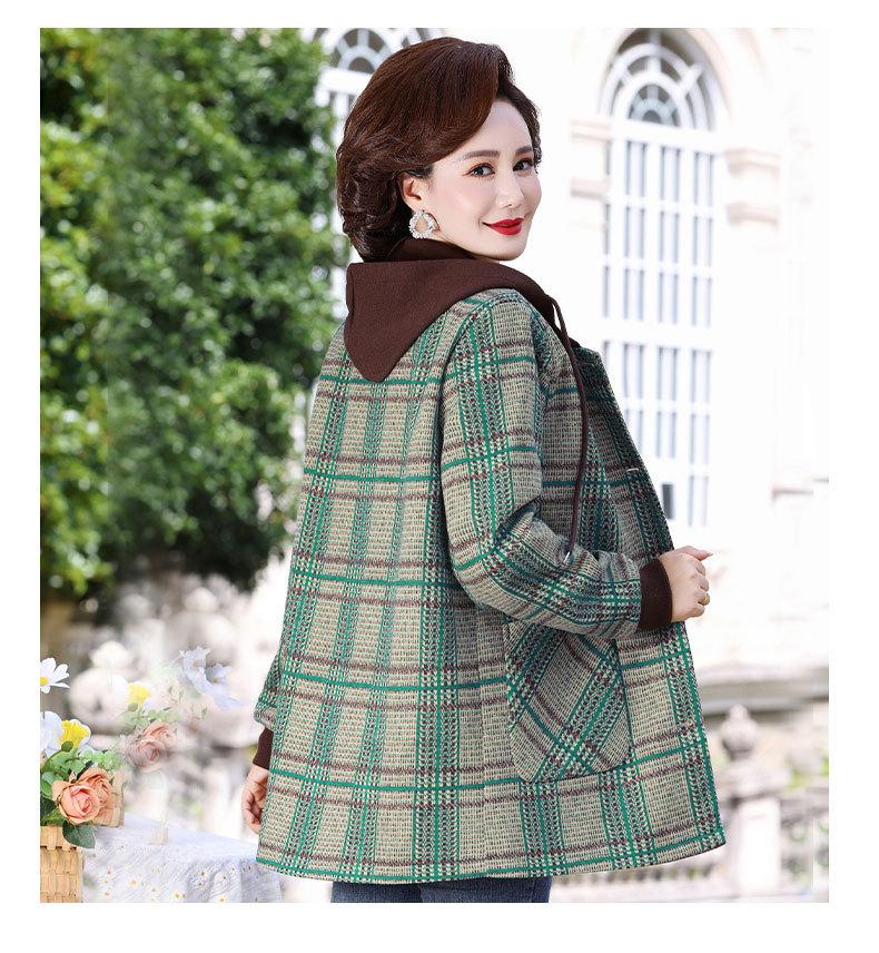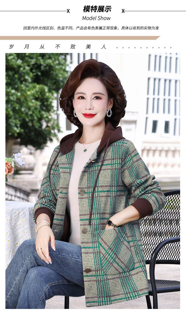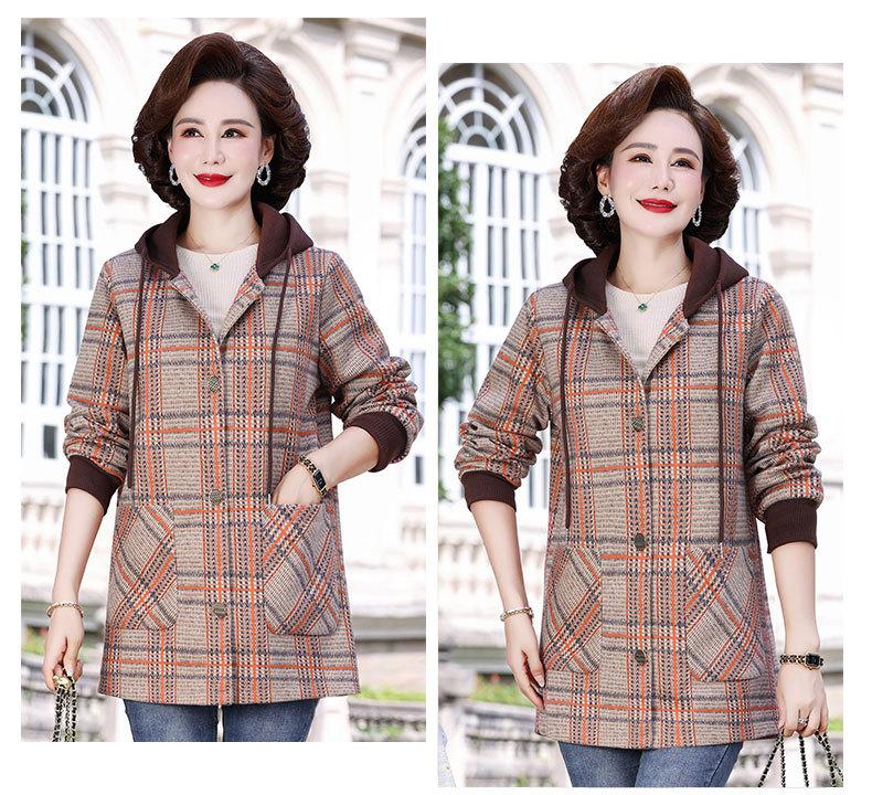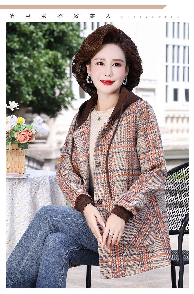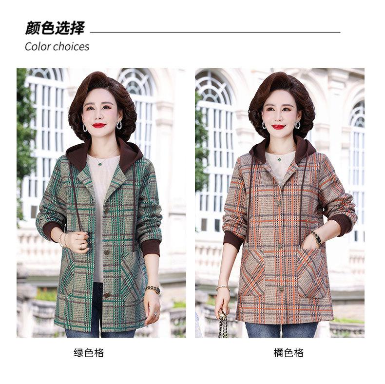 Roupas de Outono Novas para Mães de Meia-Idade, Roupas Femininas da Moda de Comprimento Médio, Jaqueta Xadrez com Capuz para Primavera e Outono