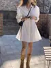 Em estoque Vestido branco de cintura justa, verão 2025, design coreano feminino, manga comprida, abotoamento simples, vestido linha A
