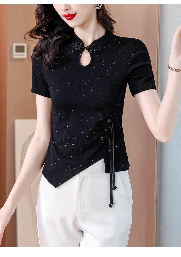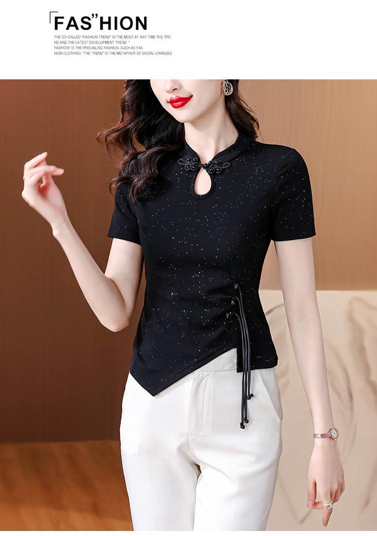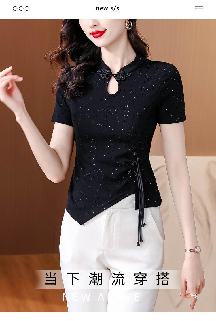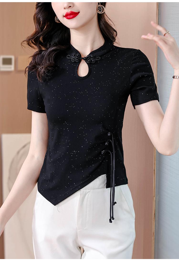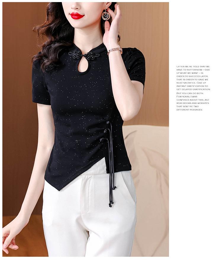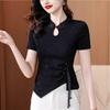 Nova camiseta feminina estilo chinês retrô com botões, design de verão, senso de nicho, irregular, emagrecedora, estilo ocidental, manga curta