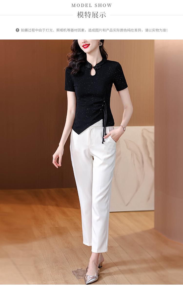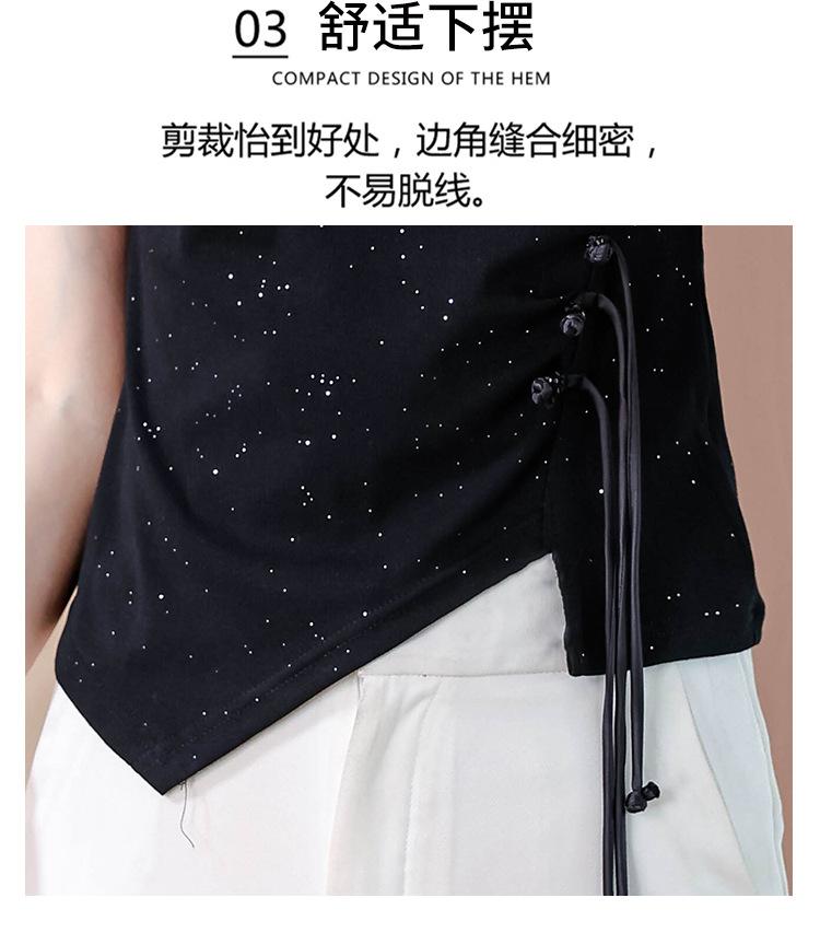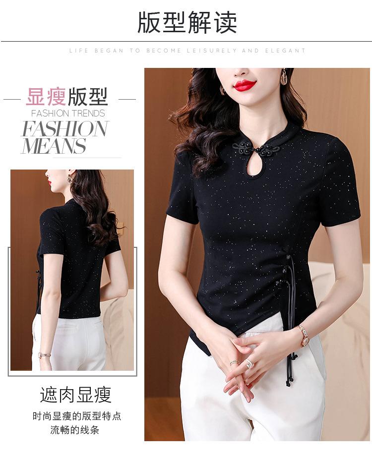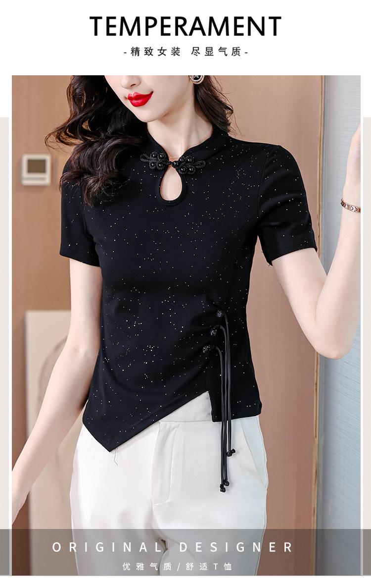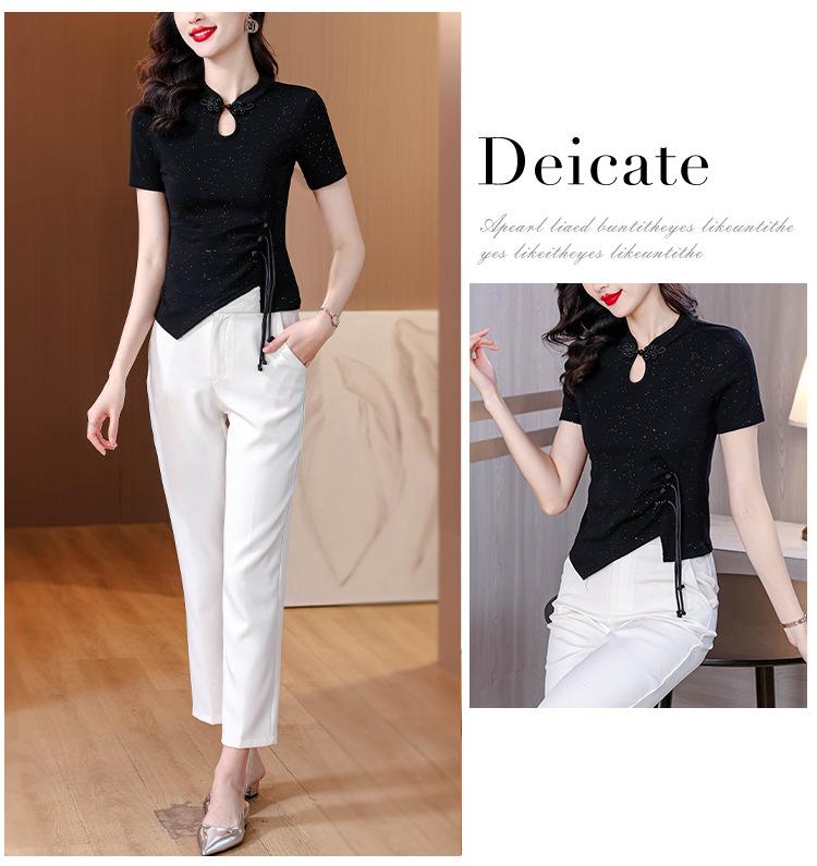 Nova camiseta feminina estilo chinês retrô com botões, design de verão, senso de nicho, irregular, emagrecedora, estilo ocidental, manga curta