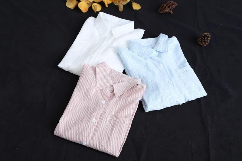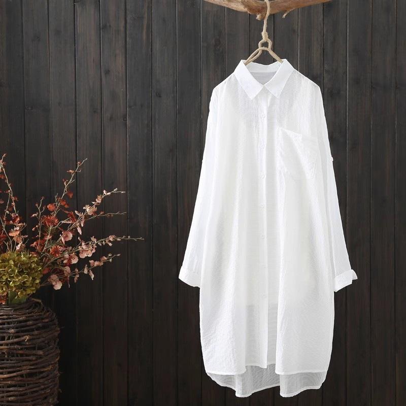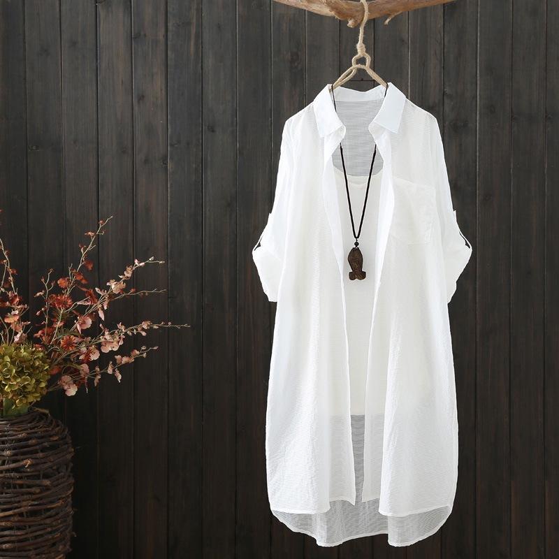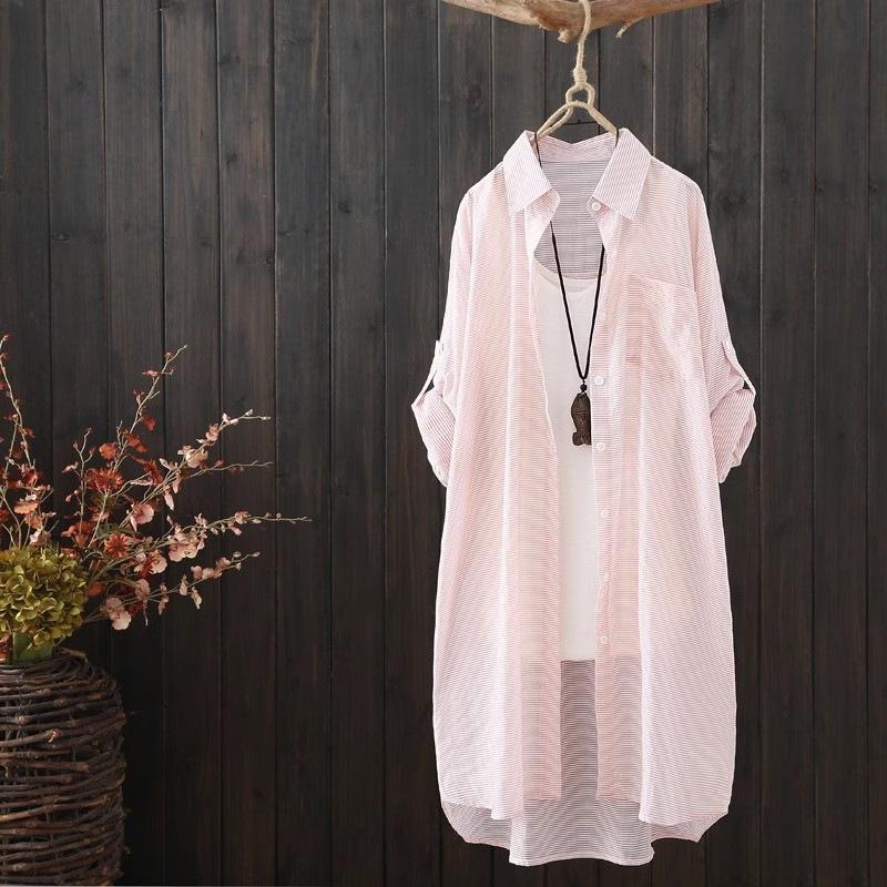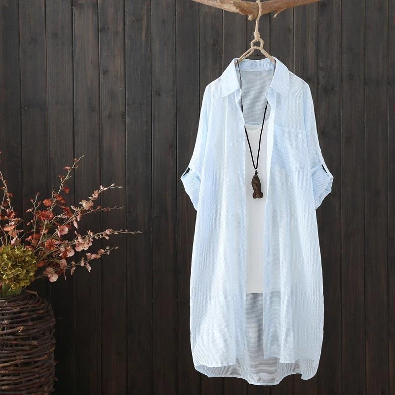 Verão 2025 Blusa Listrada de Comprimento Médio Camisa Solta Feminina Moda Casaco Externo Proteção Solar Jaqueta Fina Versátil