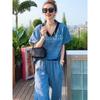 Conjunto Esportivo Feminino Verão 2024 Nova Tendência da Moda Solto Manga Curta Estilo Estrangeiro Azul Casual Corrida Conjunto de Duas Peças