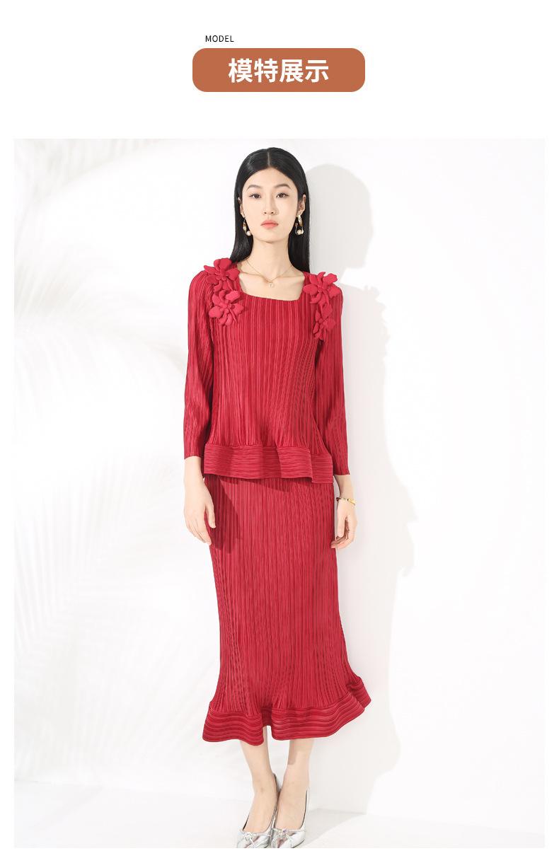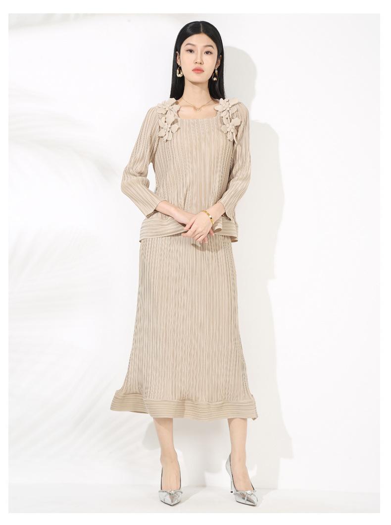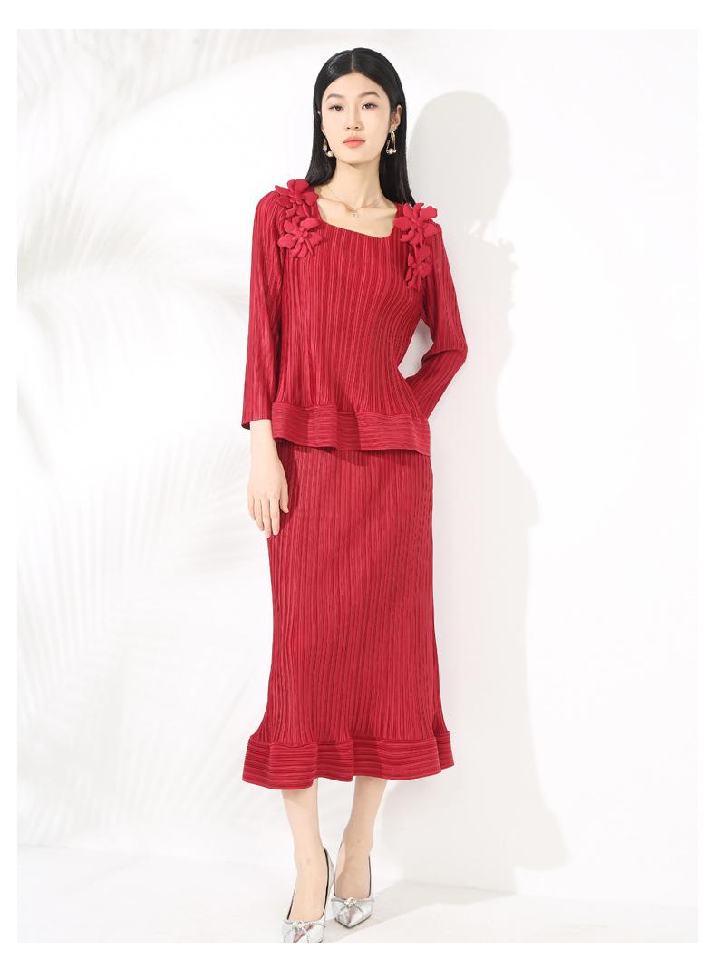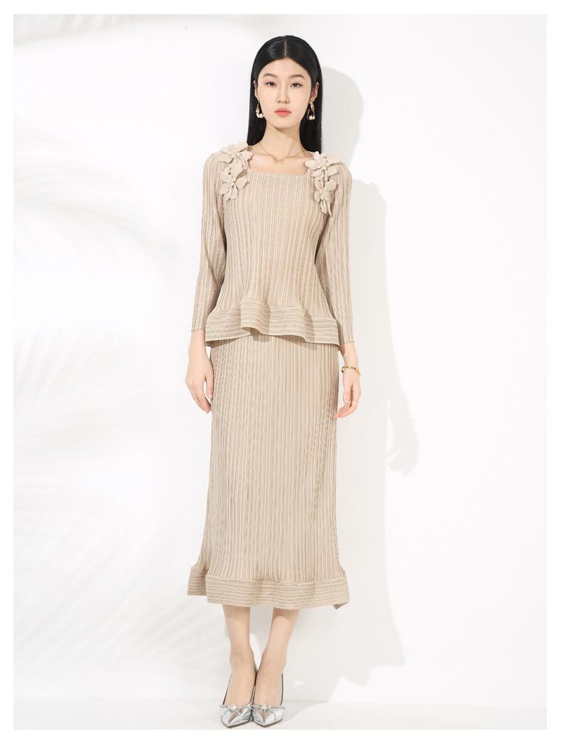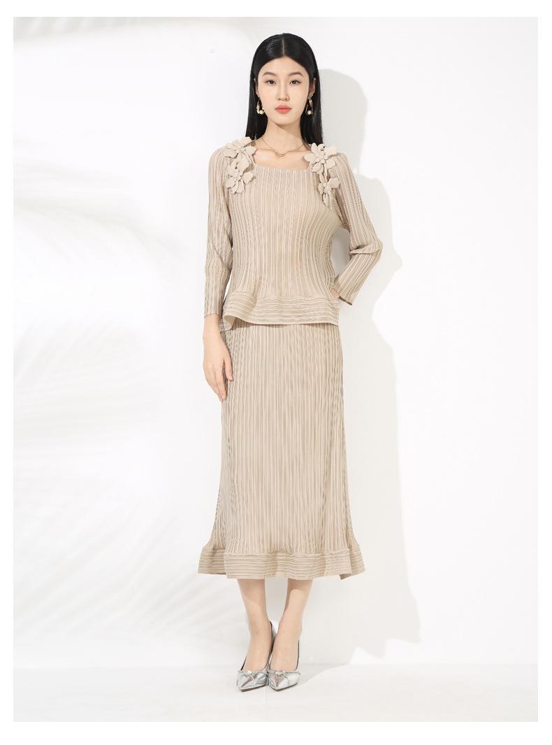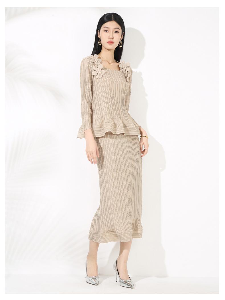 Conjunto de duas peças plissado, moda primavera 2025, design sofisticado, moda floral, top e meia saia