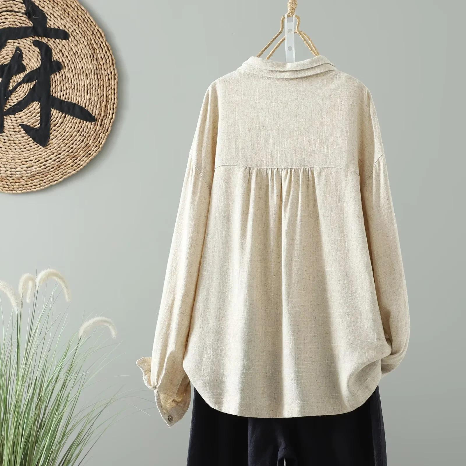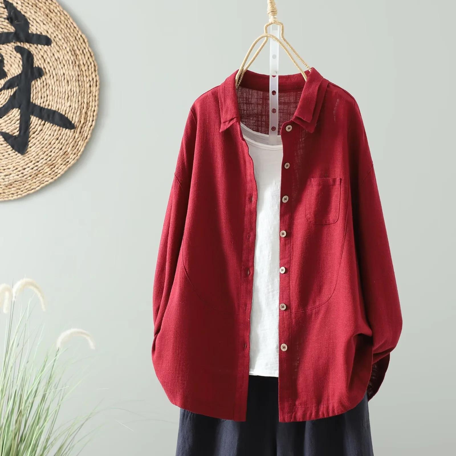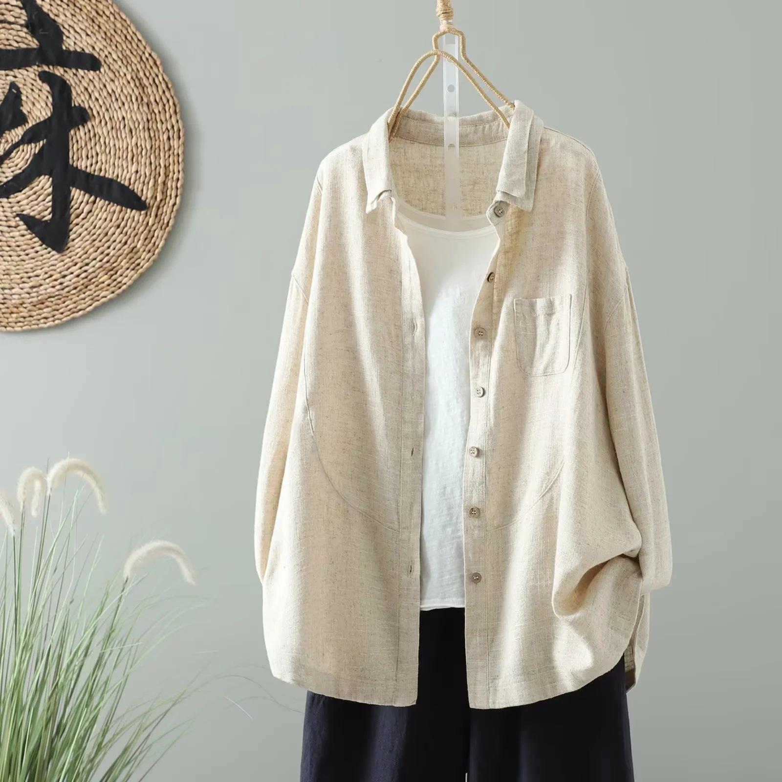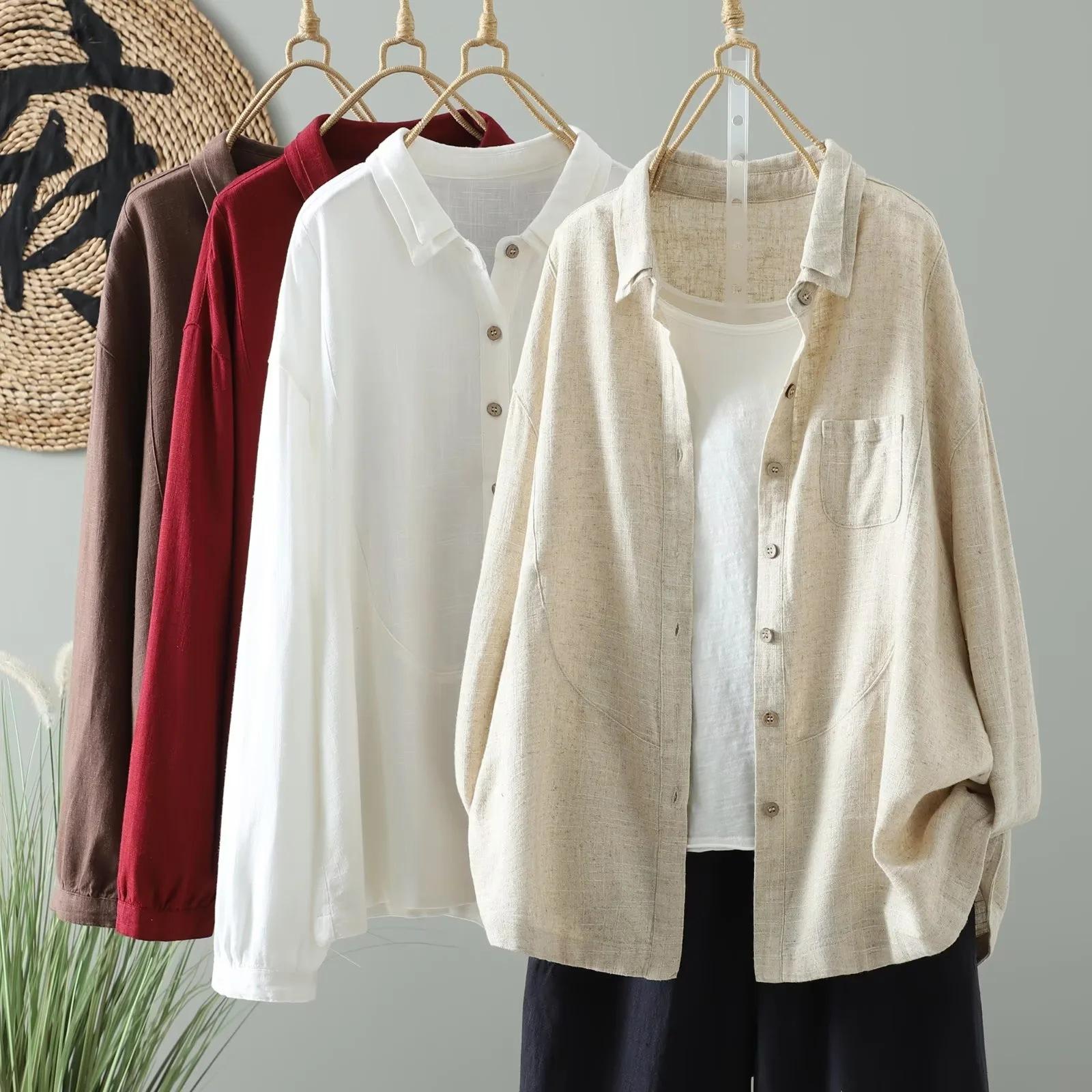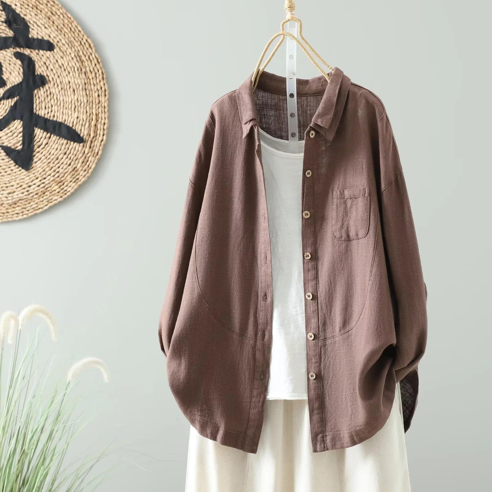 Camisa feminina de cânhamo, nova, de cor sólida, para primavera e verão de 2025, solta, de manga comprida, casual, com lapela artística, para mulheres